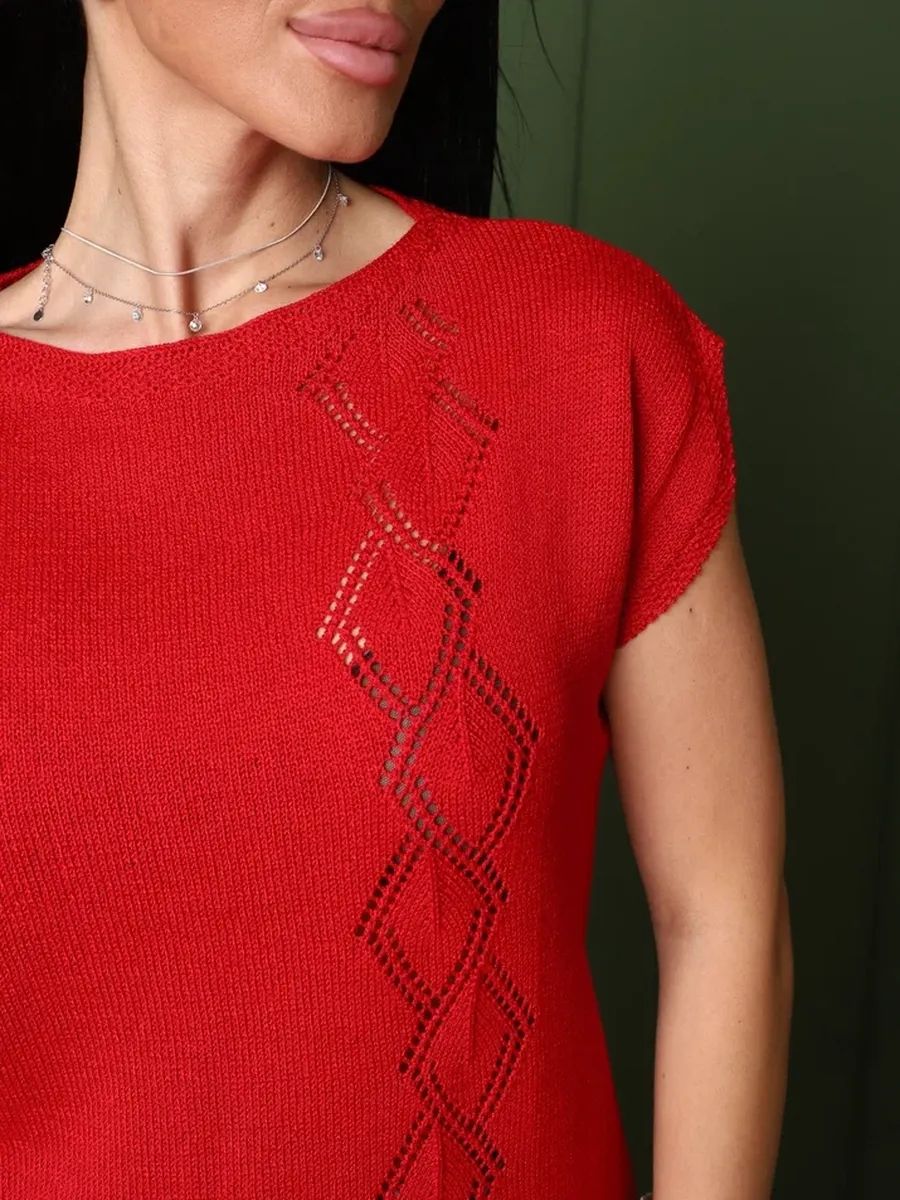 Футболка летняя вязаная - настоящая находка для ценителей стильных и комфортных вещей. Ее ажурная отделка придает изысканный вид, добавляя немного ретро-стиля в ваш образ. Модный дизайн делает базовую футболку универсальной для любого случая - будь то вечерние прогулки или праздничные мероприятия. Нарядная футболка с приталенной посадкой замечательно впишется в образ любой модницы. Однотонная футболка с вырезом лодочка станет замечательным подарком на любой праздник. Большие размеры и удобный свободный крой делают эту оверсайз футболку идеальным выбором как для беременных, так и для высоких и невысоких женщин. Классическая футболка с длинной посадкой и авторским рисунком в виде ромбов подойдет для офиса, школы и для домашнего отдыха. Она подходит для девушек и женщин всех возрастов.