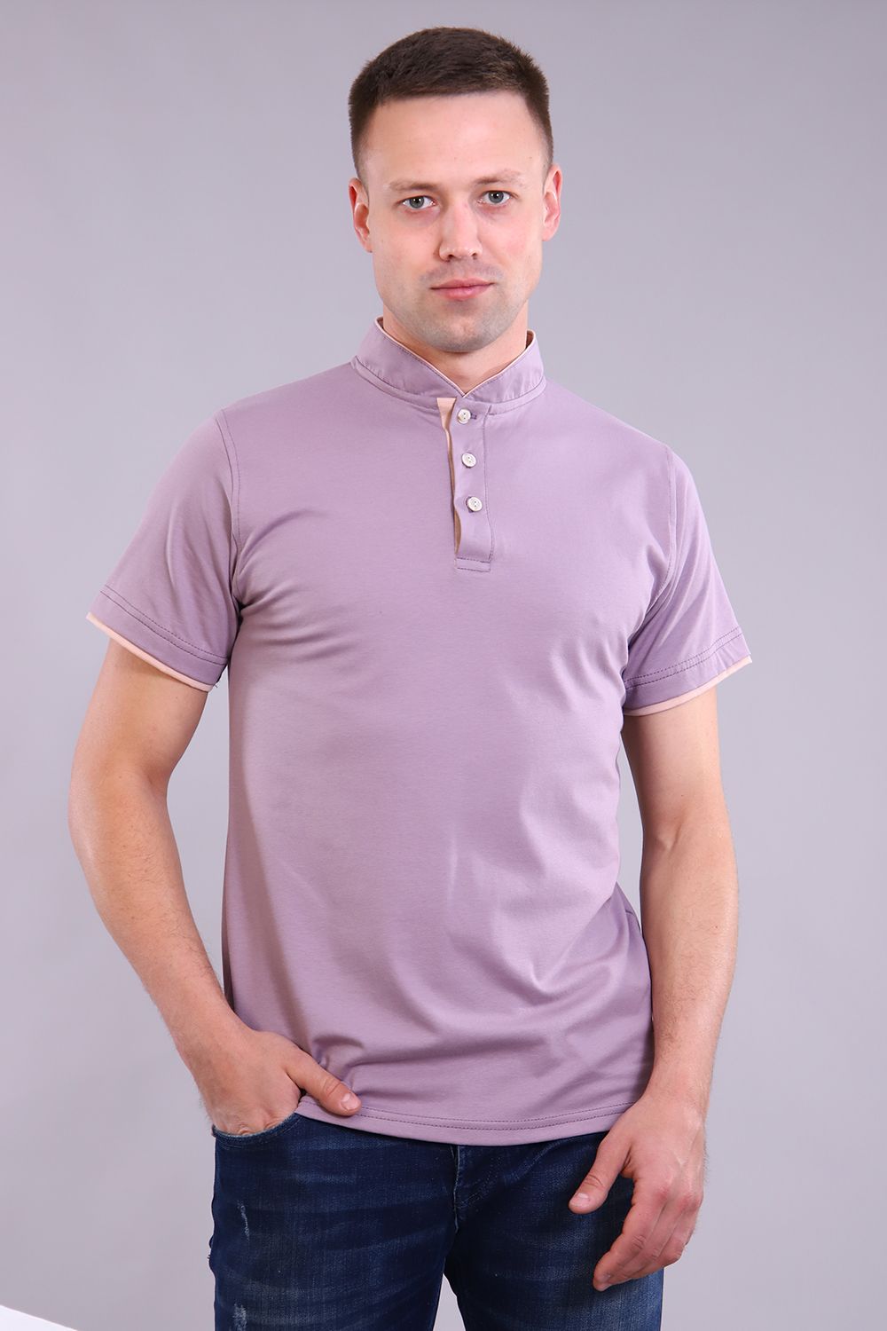 Футболка мужская из ткани кулирка с лайкрой качество пенье. Футболка с коротким рукавом, воротник стойка с контрастной отделкой на стойке и рукаве, планка на трех пуговицах. Модель комфортная, стильная и удобная. Не деформируется и не теряет цвет после стирки.