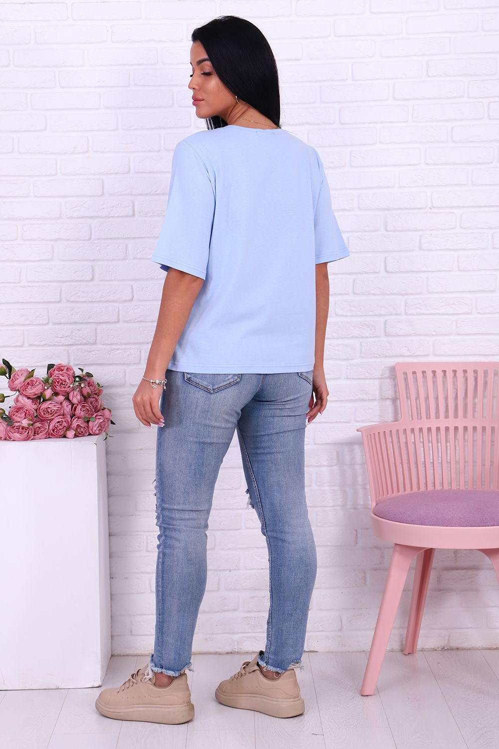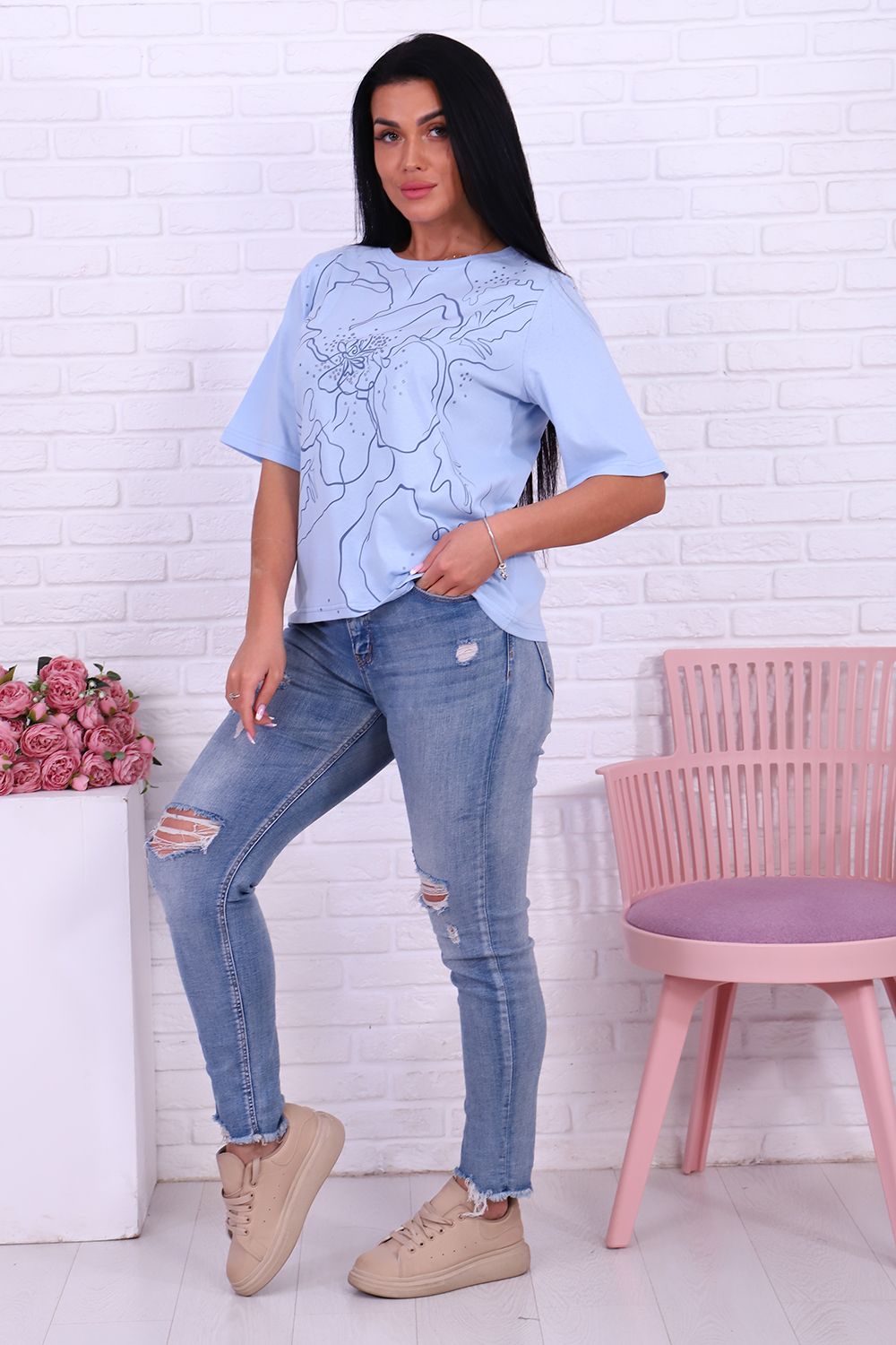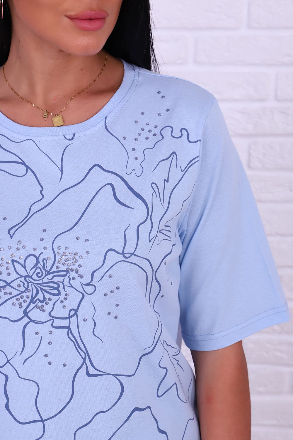 Футболка 4493 женская с нежным принтом во всю полочку понравится многим! Модель свободного кроя, линия плеча прямая, рукав удлиненный до локтя, горловина обработана обтачкой из основного материала, рукава и низ вподгибку.