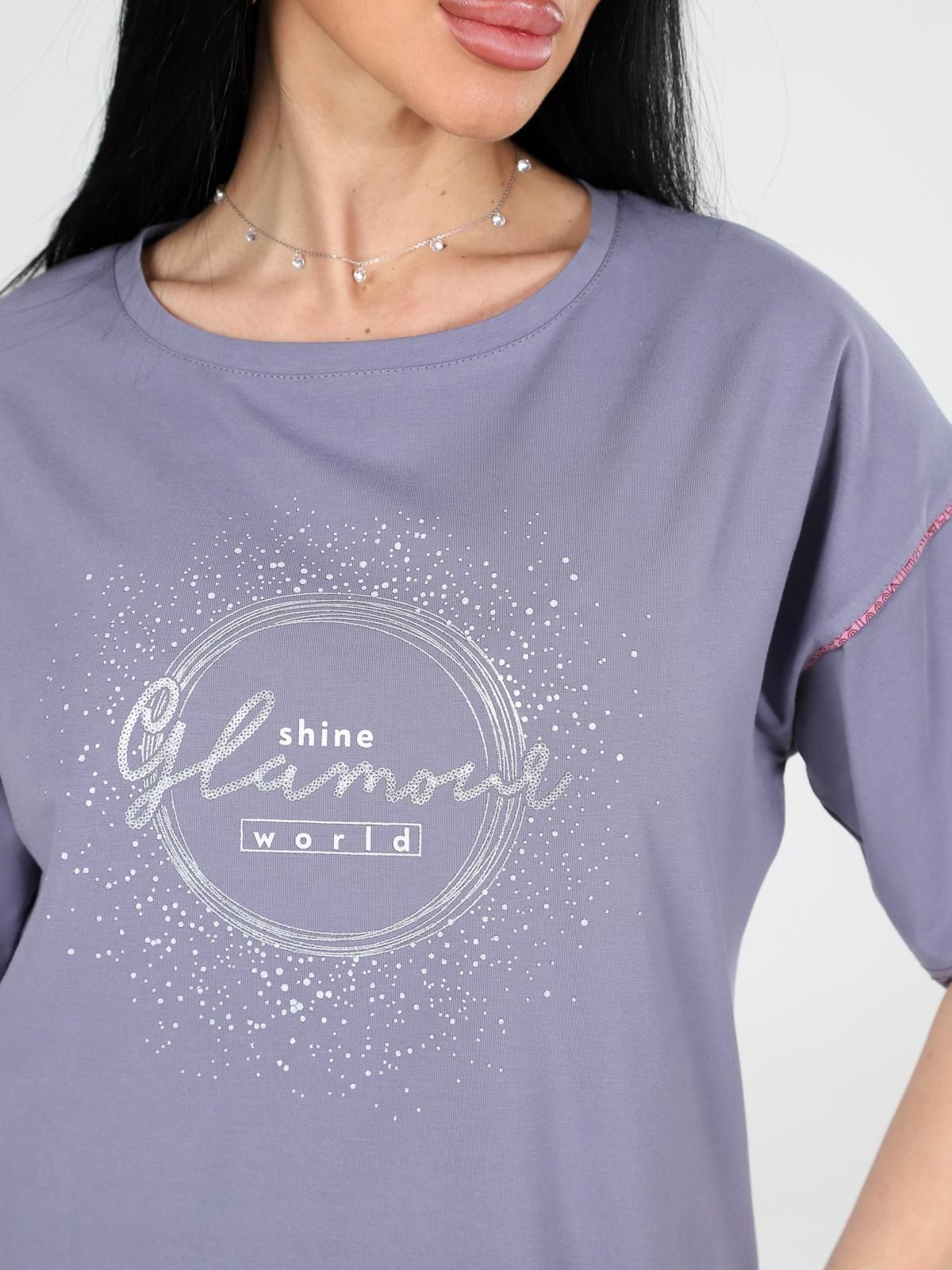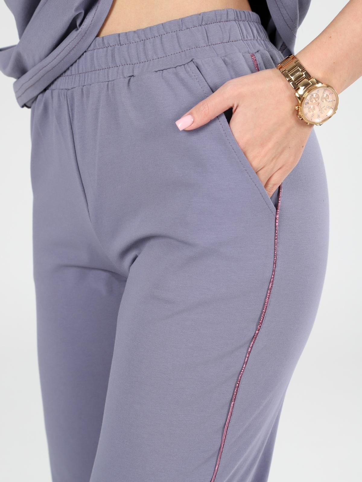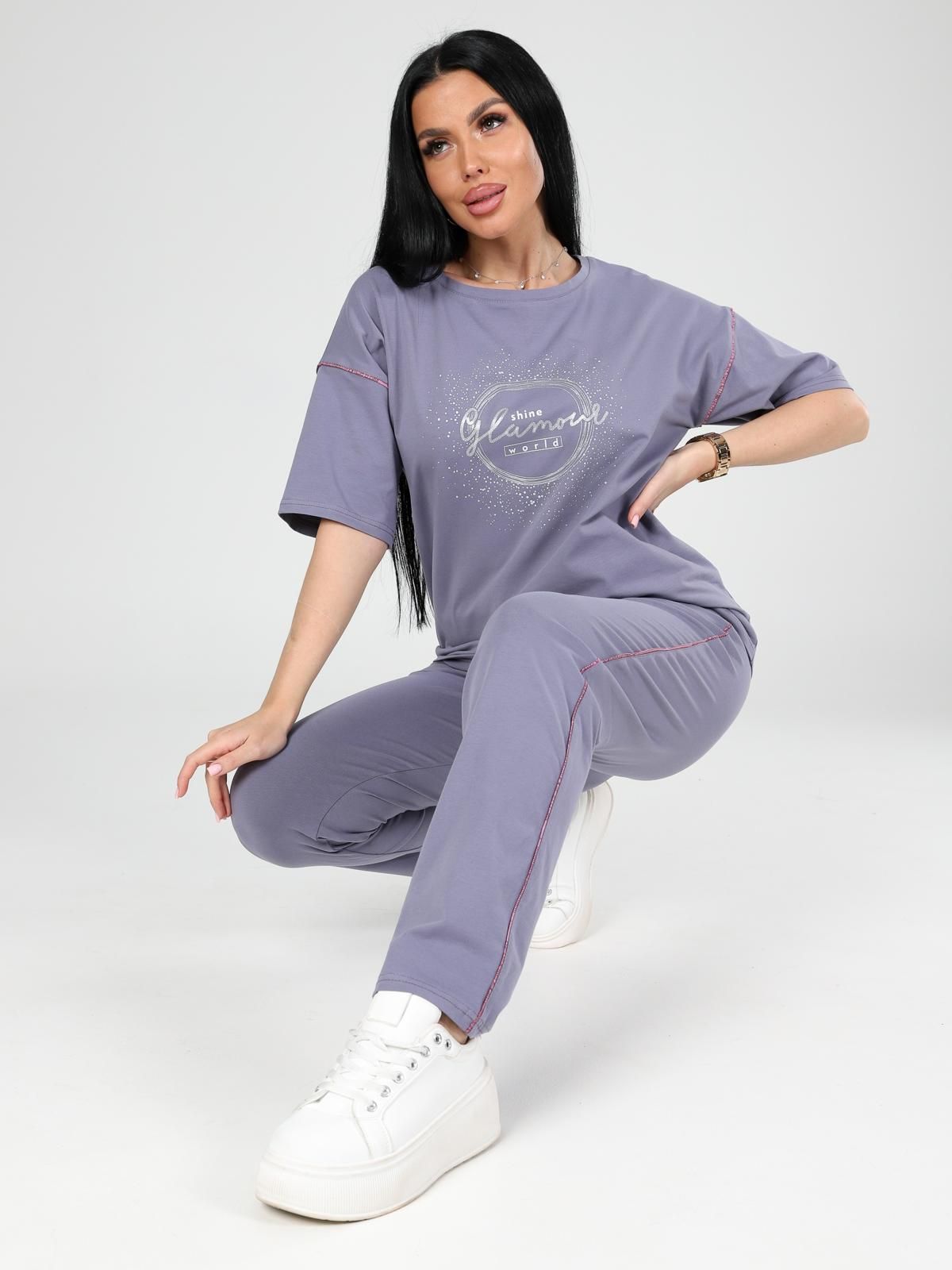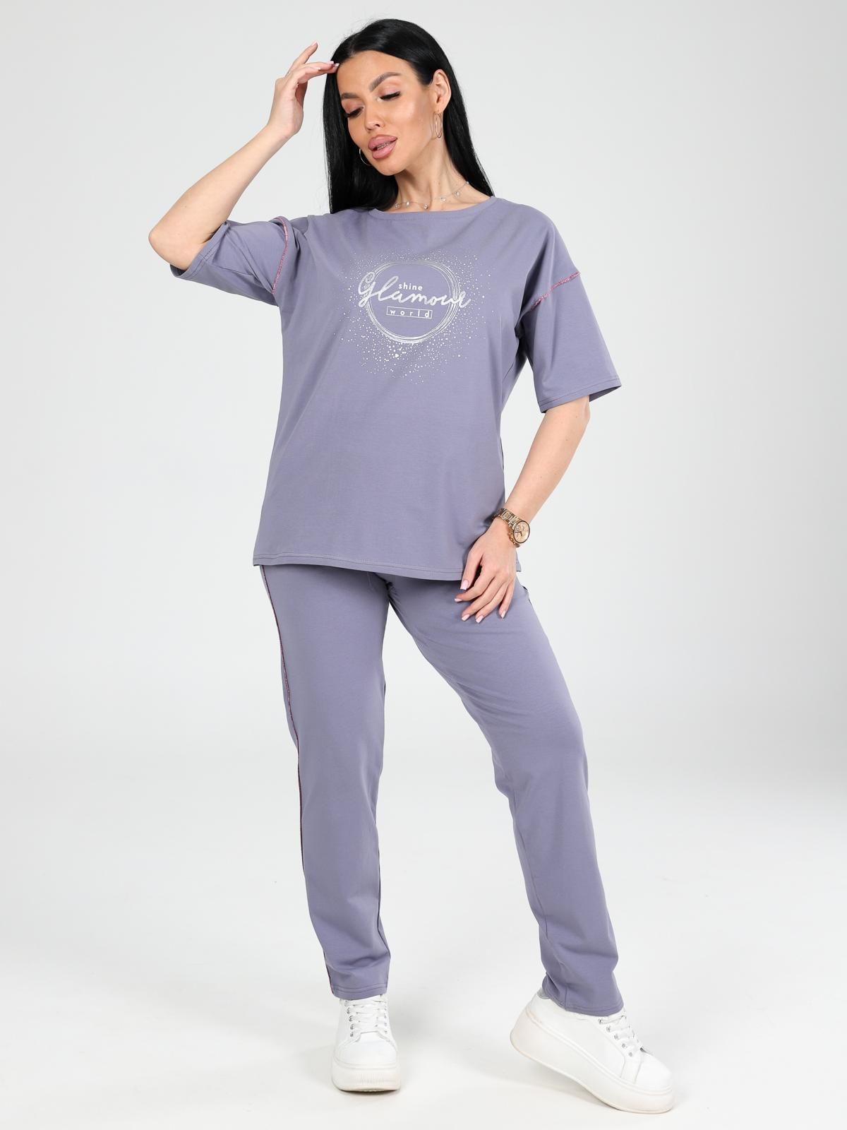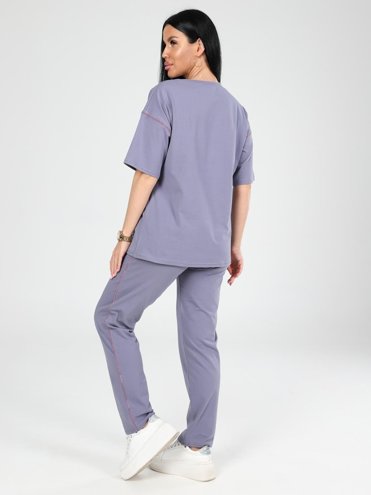 Костюм женский состоит из футболки и брюк. Футболка прямого силуэта со спущенной линией плеча. По шву втачивания рукава-кант из отделочной ткани. По центру полочки принт. Брюки с карманами и отделочным кантом в боковых швах.
