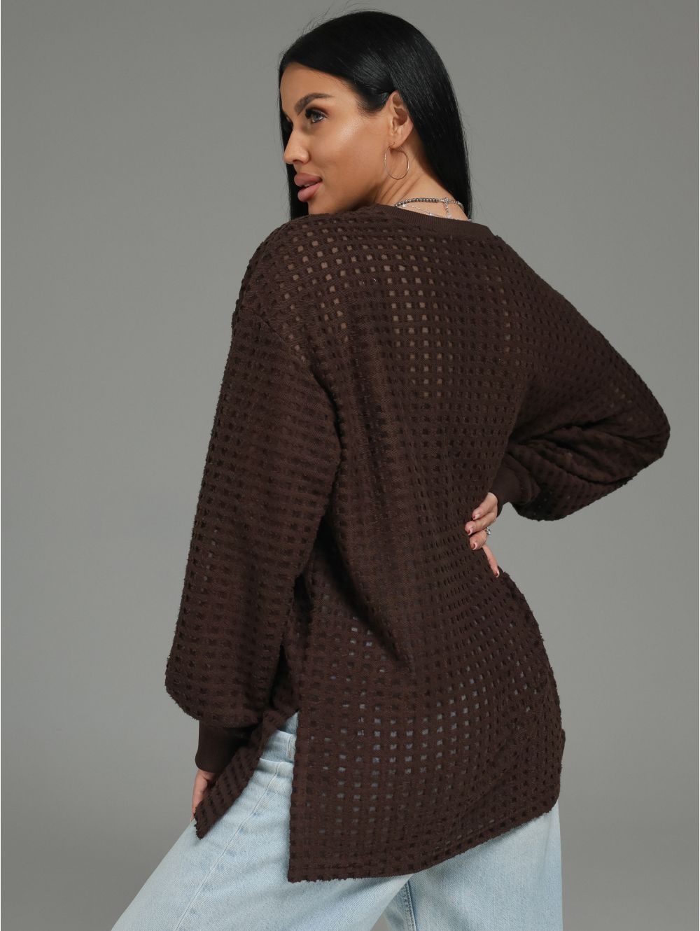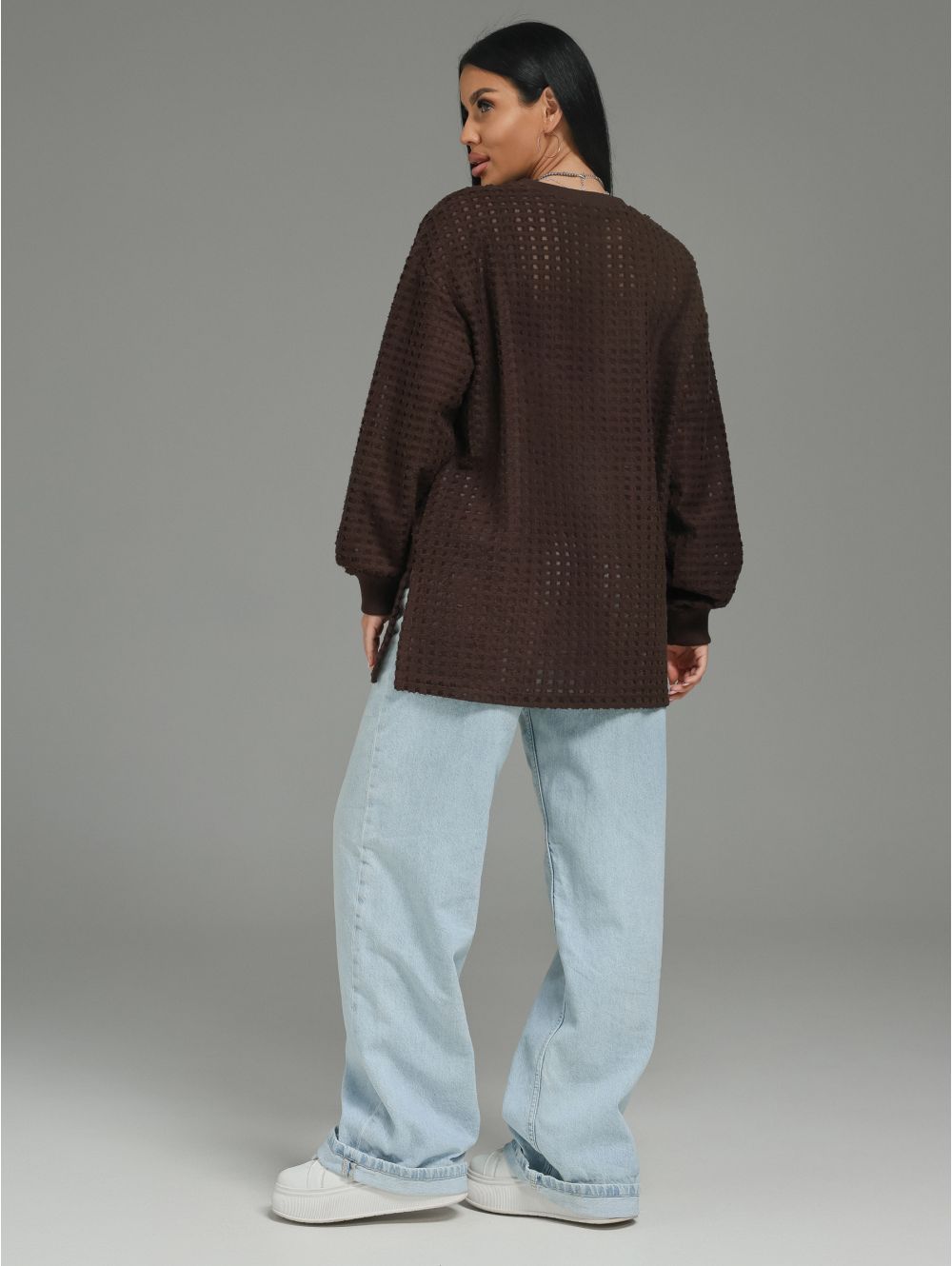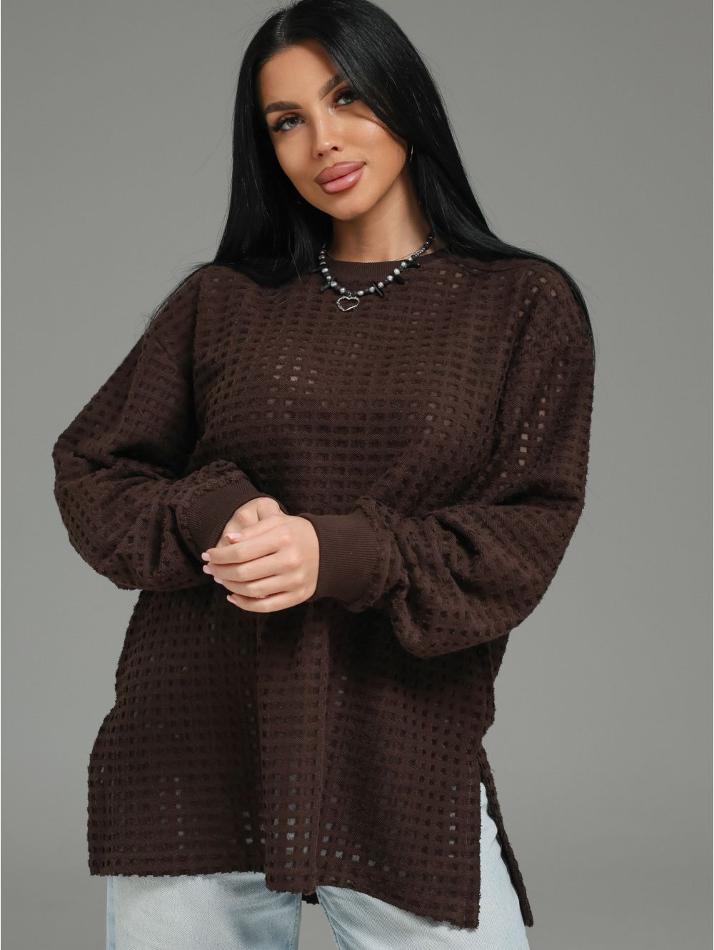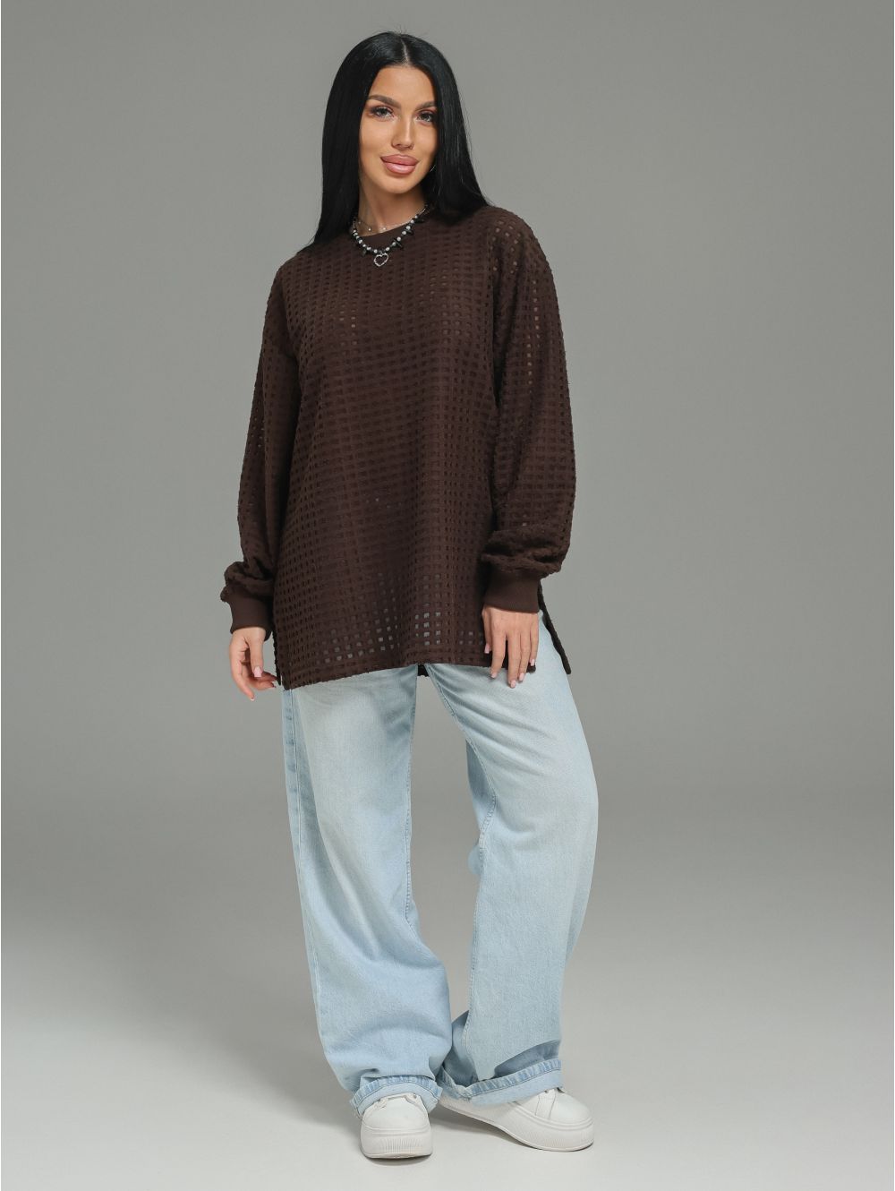 Деталь: Стильные вертикальные разрезы по боковым швам, аккуратно отстроченные П-образно. Они визуально вытягивают силуэт, добавляют динамики и легкости даже объемному крою.