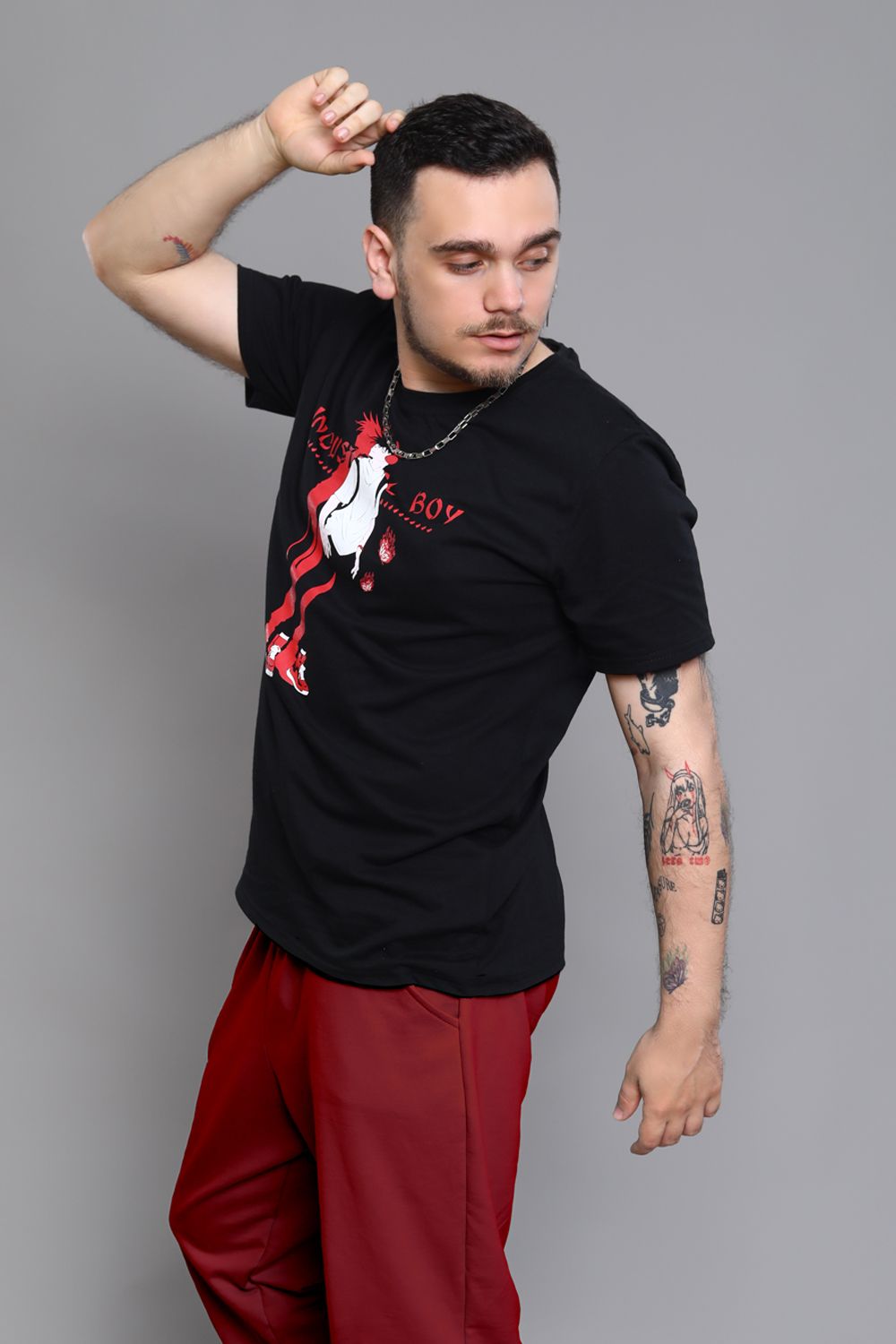 Футболка мужская с коротким рукавом. Данная модель выполнена из трикотажного полотна (кулирка). На полочке присутствует принт. Горловина обработана из эластичного трикотажного полотна (рибана). Отлично подходит для прогулок.