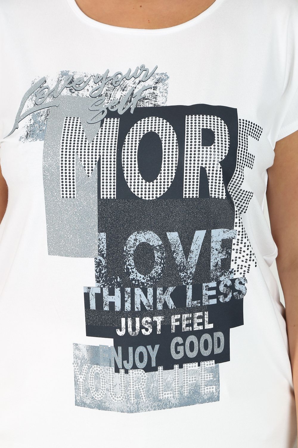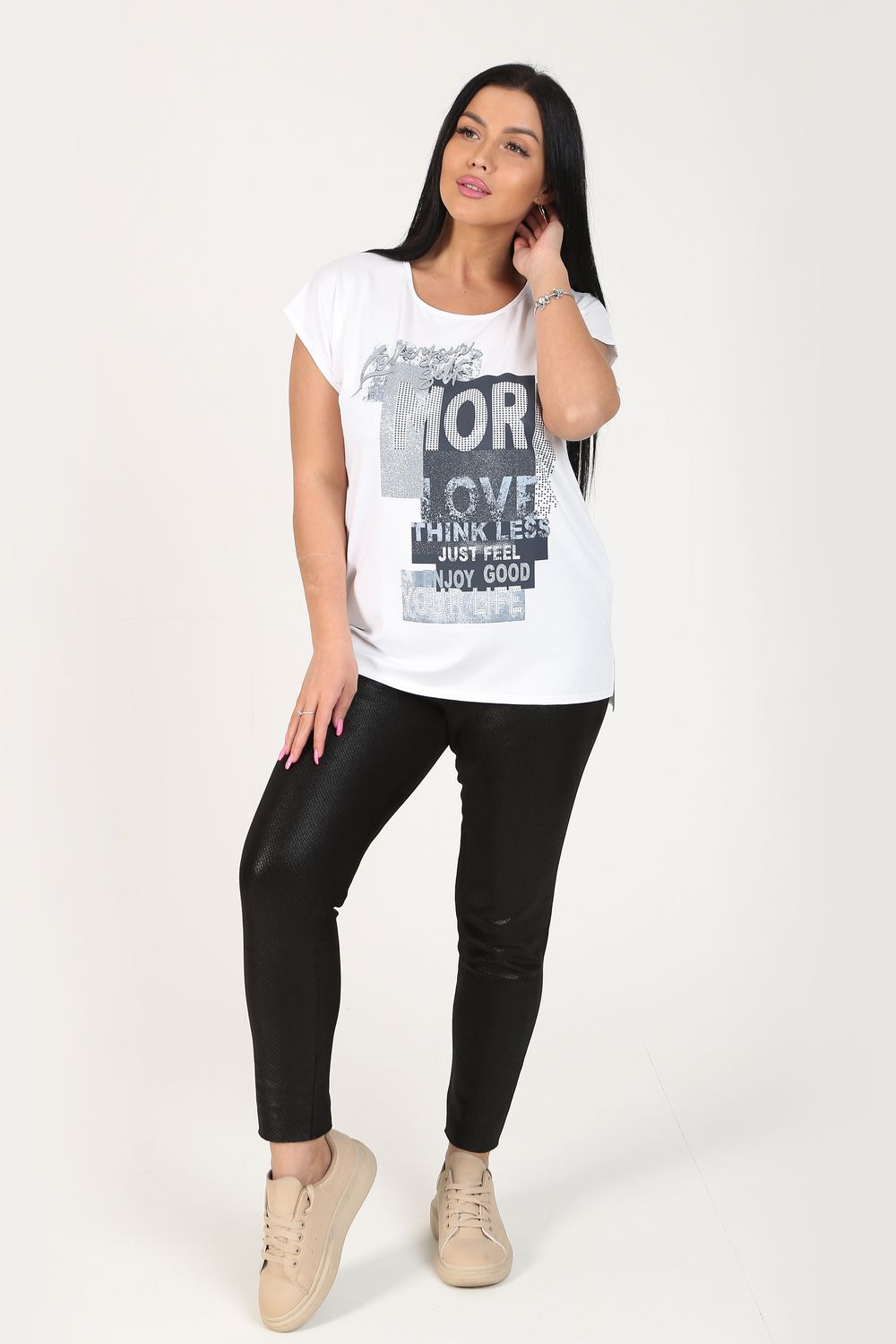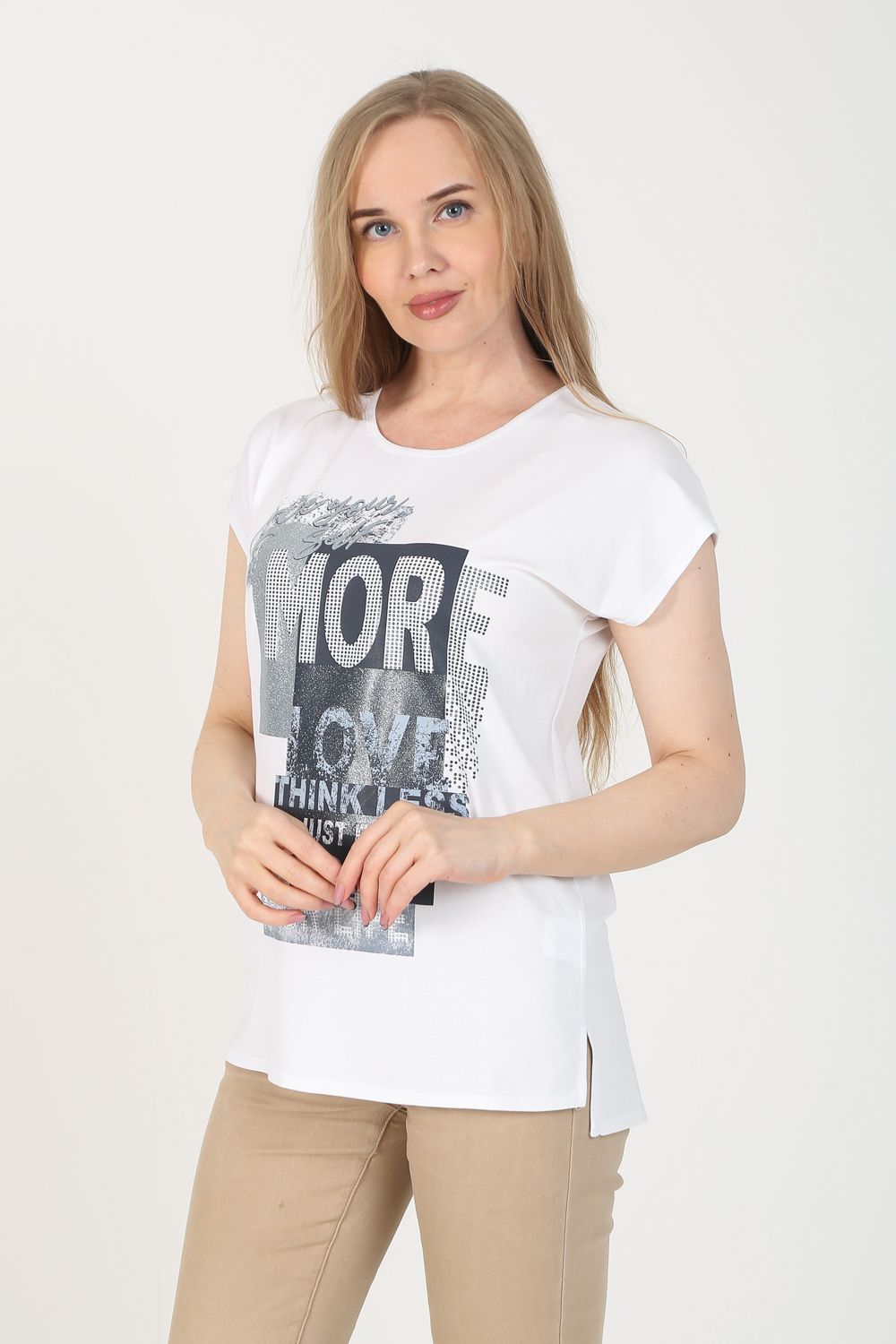 Модель свободного силуэта длиной до линии бёдер, со спущенной проймой. На передней части изделия нанесена стильная современная печать, боковой шов переходит в небольшой разрез, низ спереди чуть короче, чем спинка. Футболка изготовлена из приятной и комфортной вискозы, сочетается с любой одеждой.
