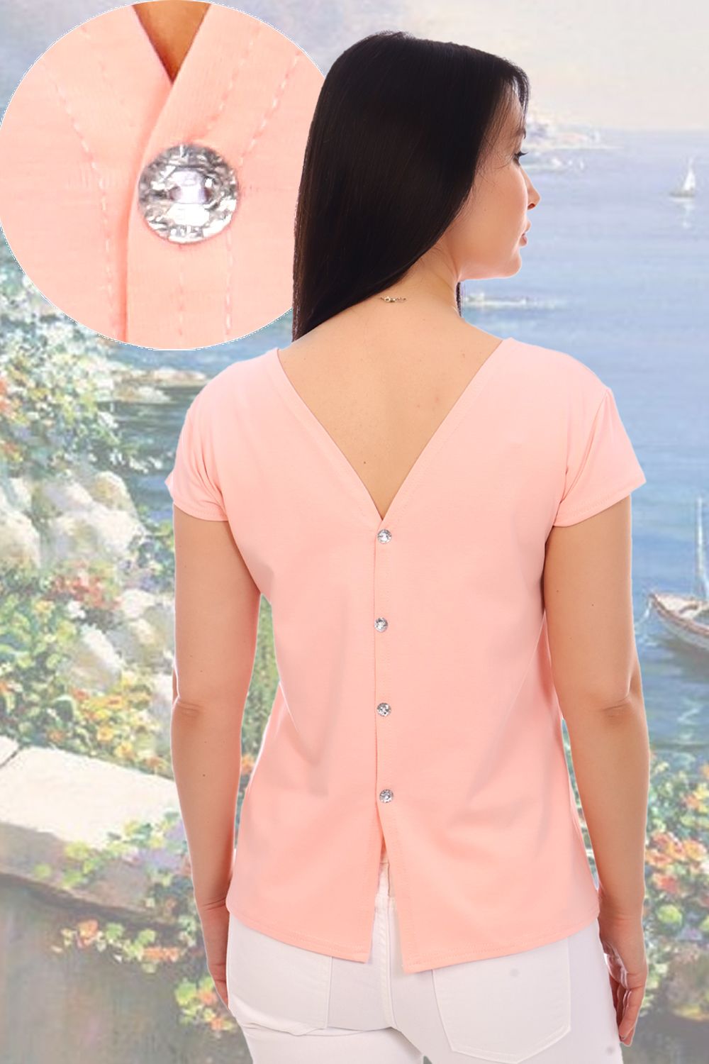 Футболка молодёжная с мерцающим принтом на груди, из эластичного, высококачественного, приятного к телу трикотажа. Горловина круглая, короткий рукав, слегка расклешенная к низу. Имитация распашной спинки украшена декоративными пуговицами, что придаёт футболке некую изюминку. Модель интересная, универсальная, её можно носить с брюками или джинсами, а также с юбкой. Подойдёт как для работы в офисе, так и для повседневного гардероба.