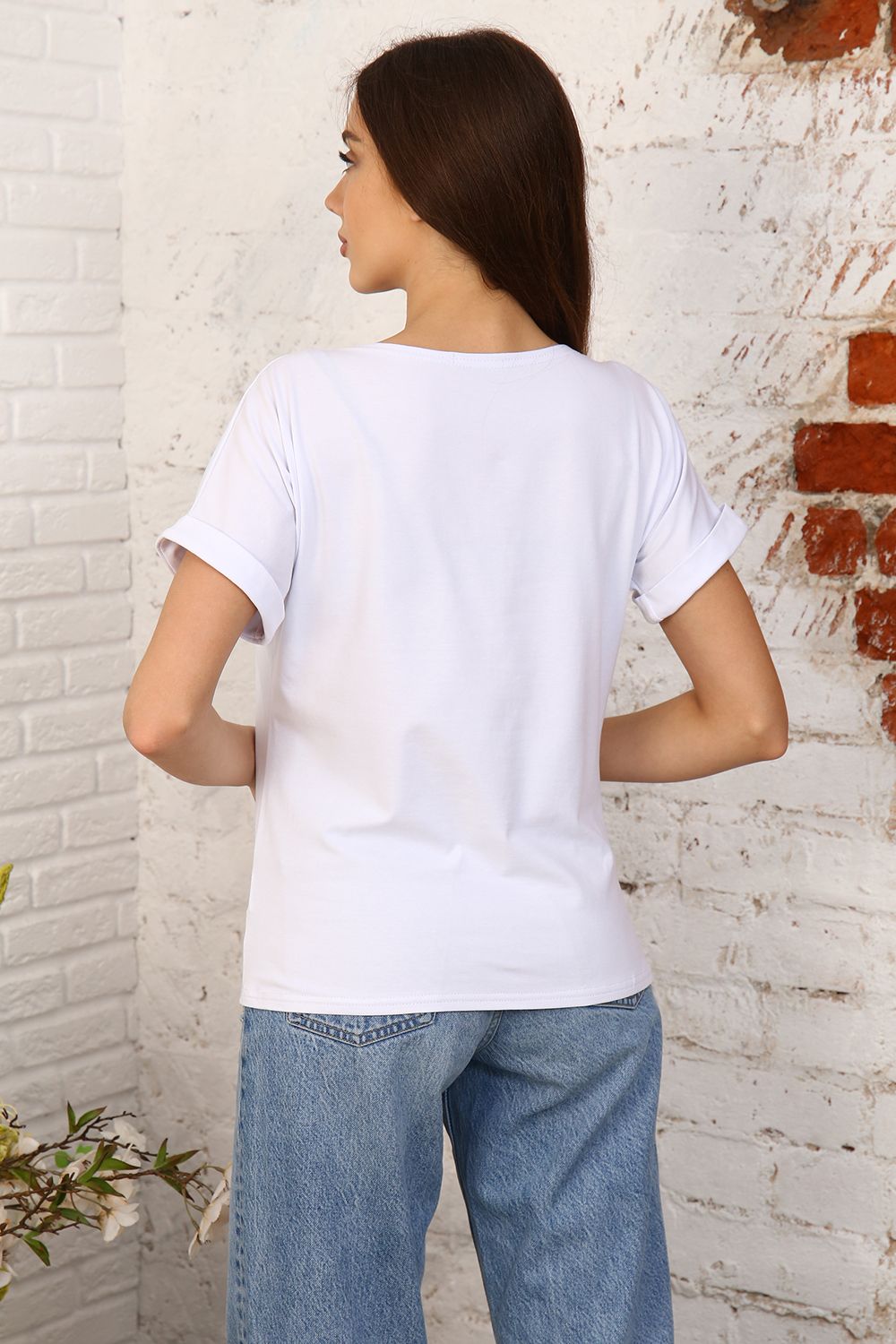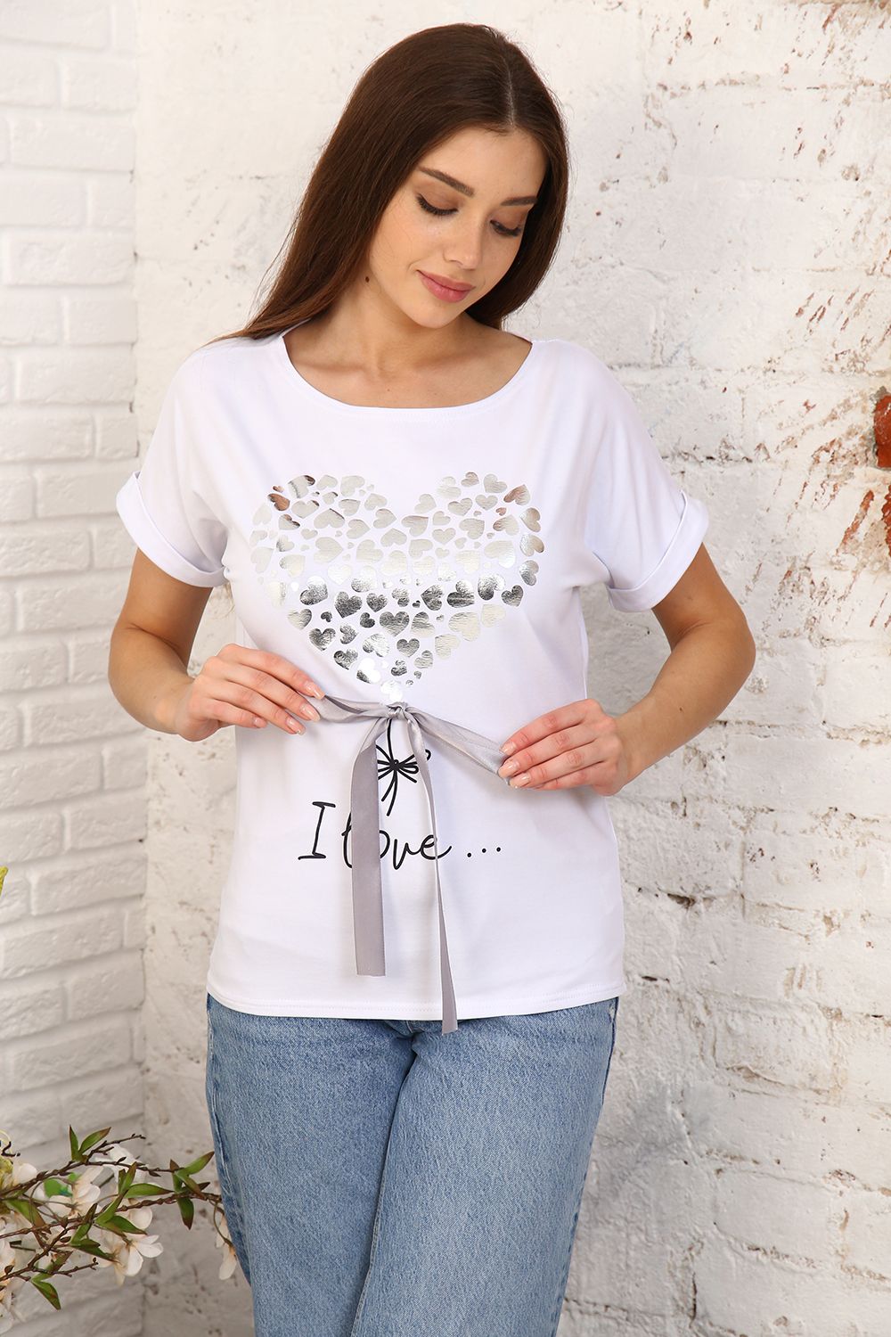 Футболка женская с современным принтом и бантом из атласной ленты, из кулирки с лайкрой высокого качества ПЕНЬЕ. Модель свободного покроя, вырез горловины в виде "лодочки", короткий цельнокроеный рукав обработан манжетом с отворотом. Футболка комфортная, отлично будет сочетаться с любым элементом гардероба, создаст уникальный и неповторимый образ модницы.
