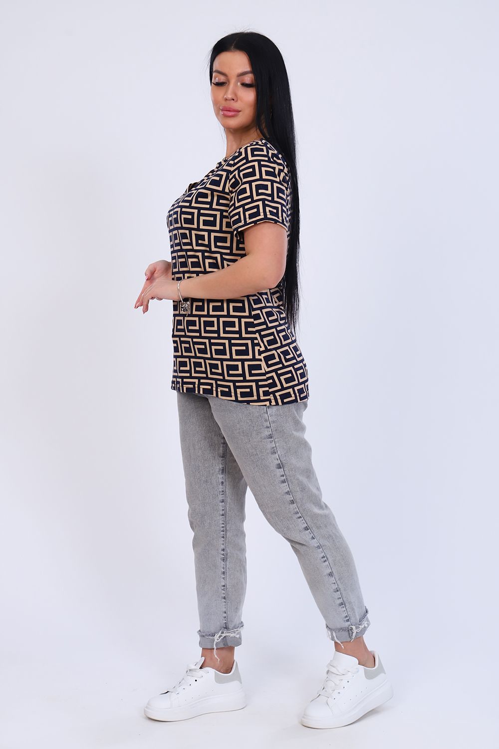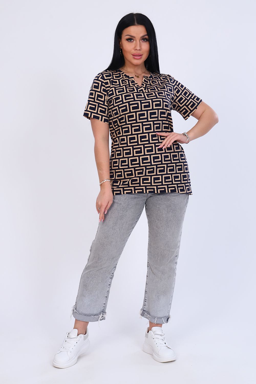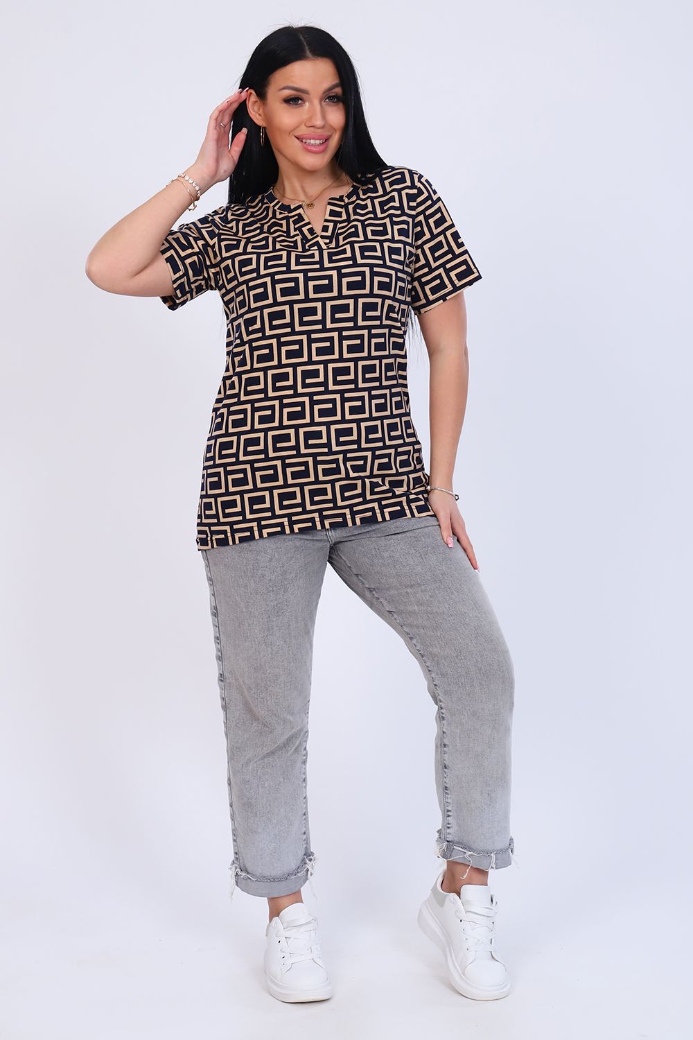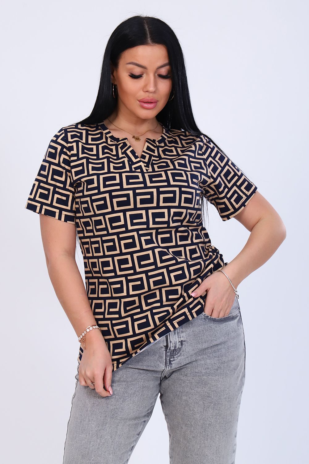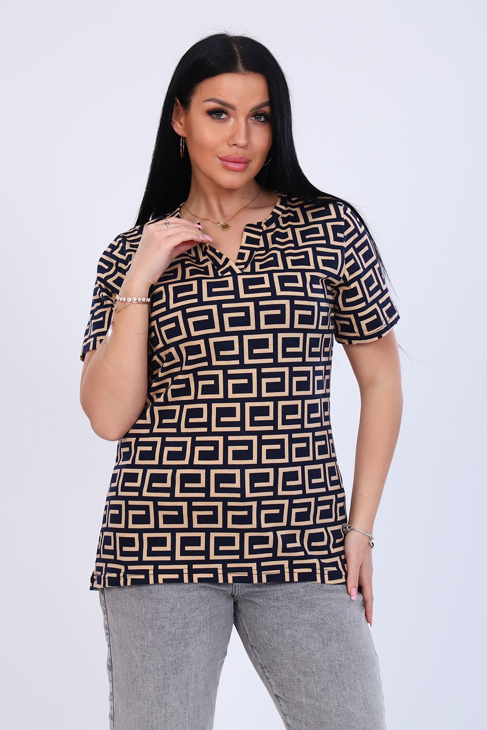 Футболка женская с коротким рукавом. Горловина с планкой без пуговиц. Низ изделия ассиметричен.