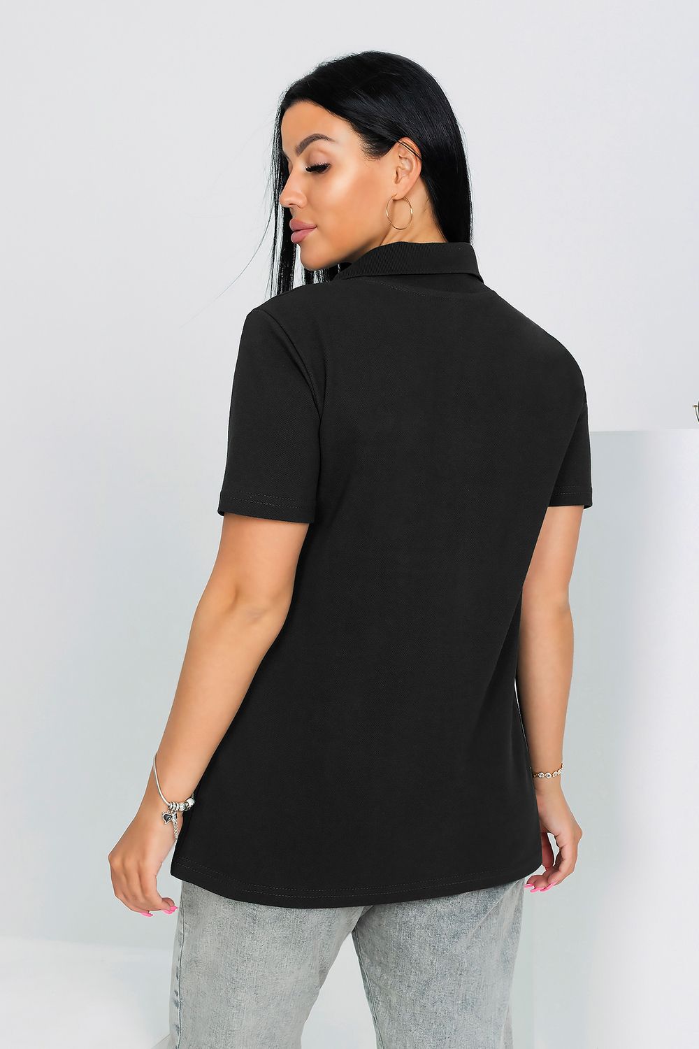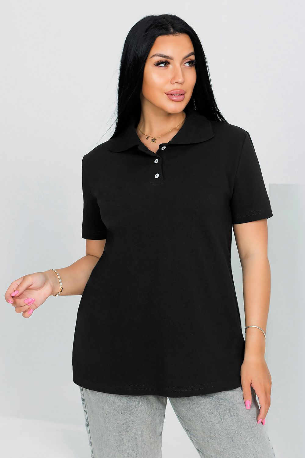 Футболка поло женская полуприлегающего силуэта с коротким рукавом (длина рукава указана с длиной плеча) выполнена из плотной ткани пике 100% хлопок. Воротник отложной рибана, застежка на пуговицах.