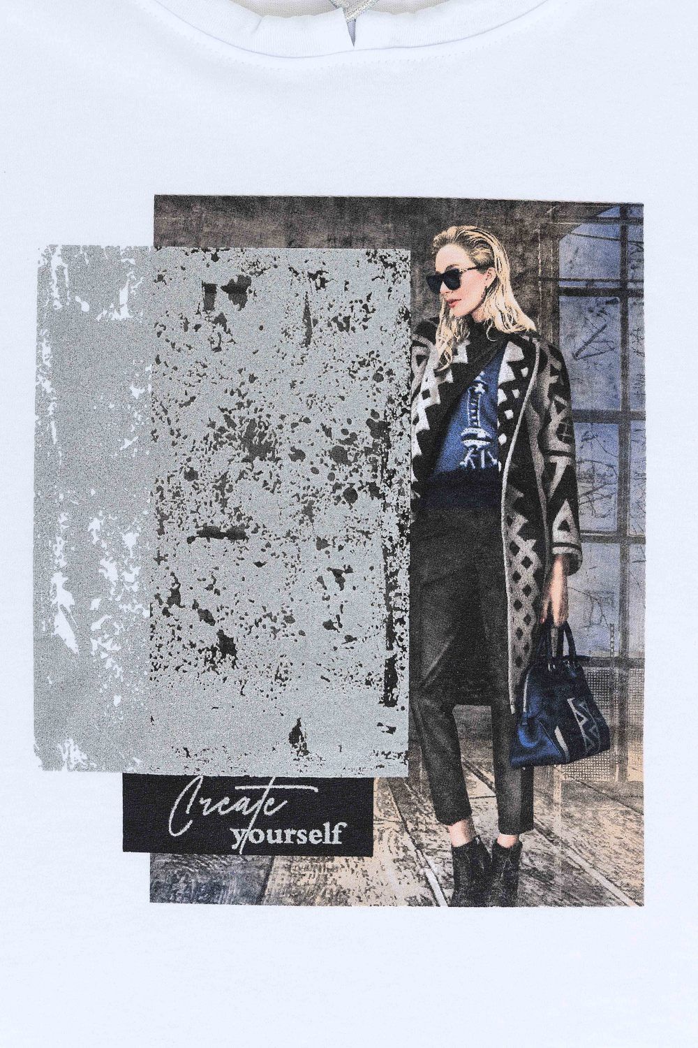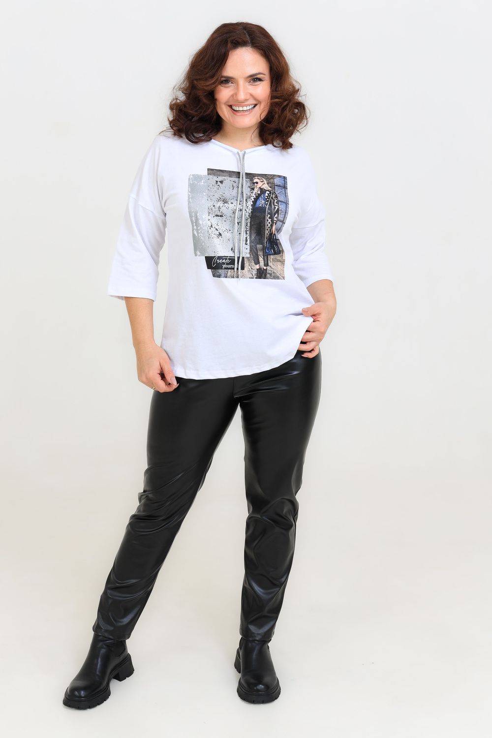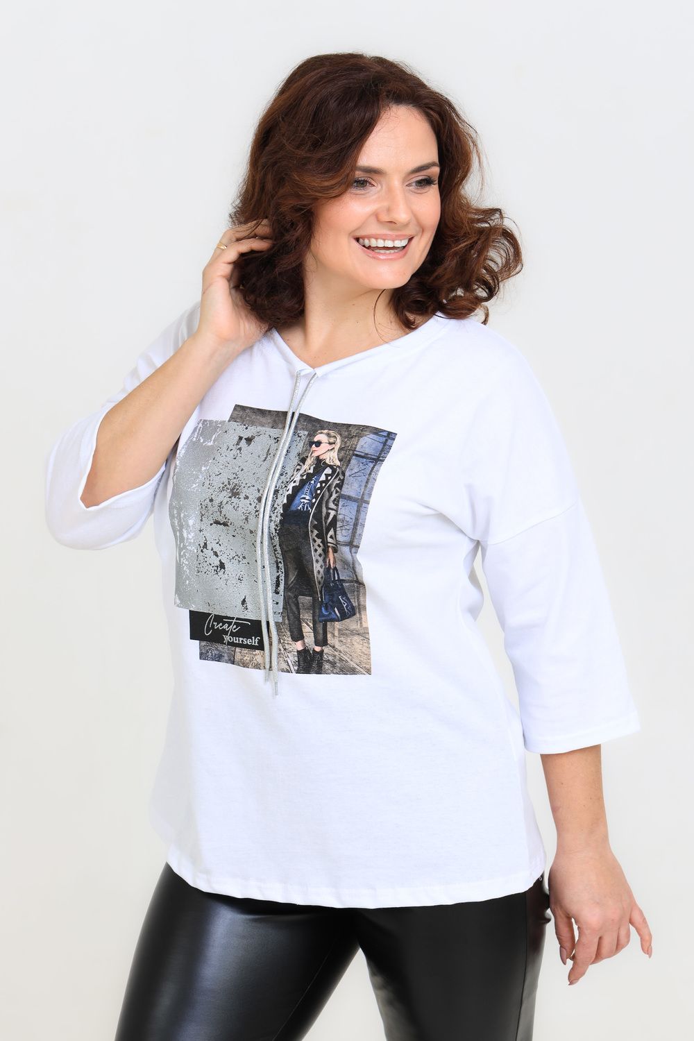 Женская футболка из мягкой, натуральной ткани. Благодаря свободному крою безупречно садится по фигуре. Горловина обработана широким кантом и дополнена серебристым шнуром, который гармонично перекликается с принтом на футболке. Рост модели на фото 169см, параметры 98-86-105