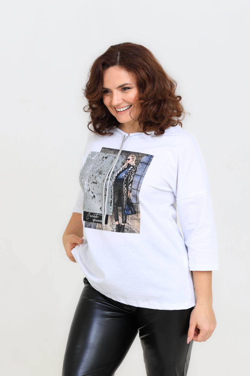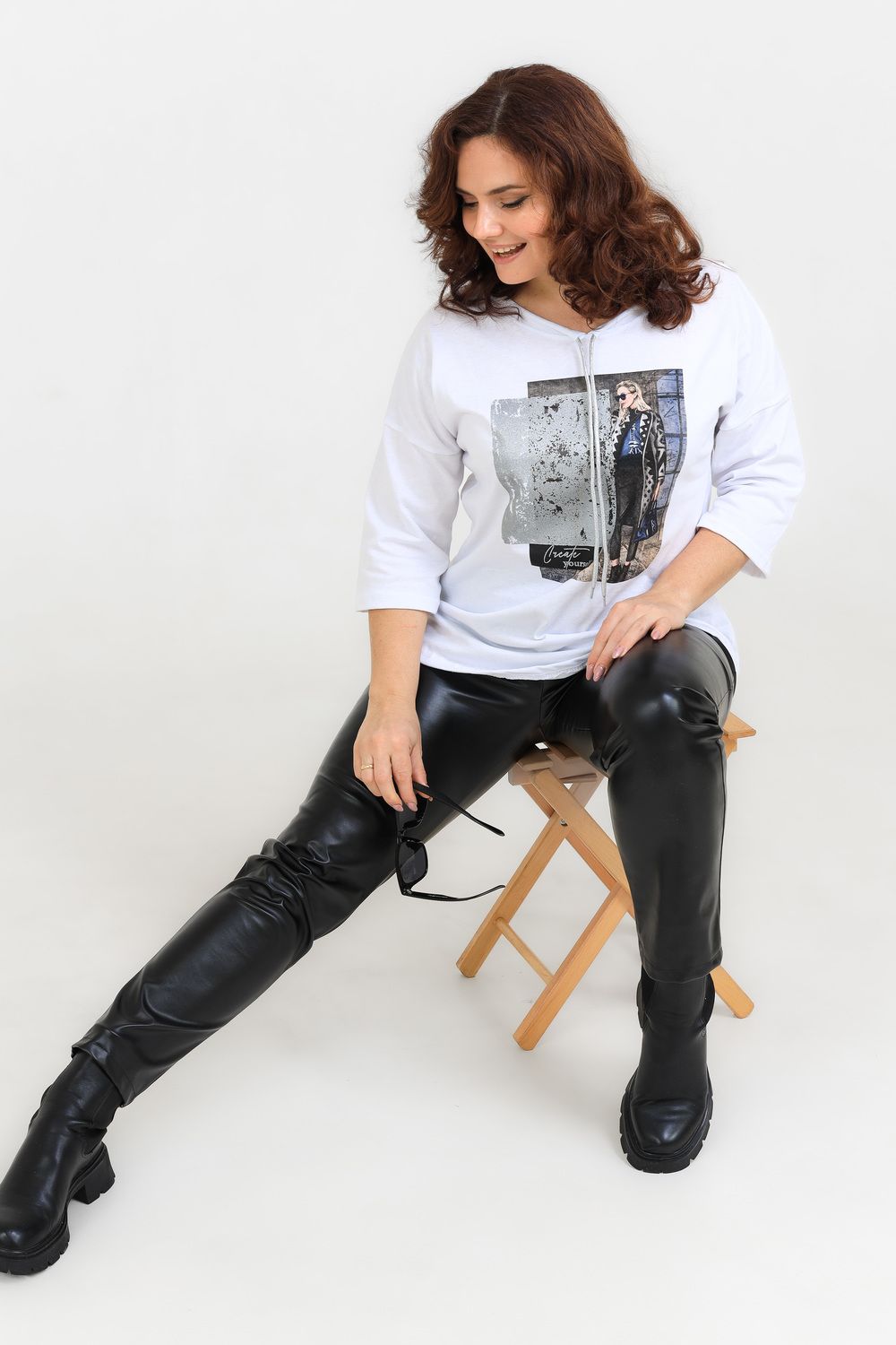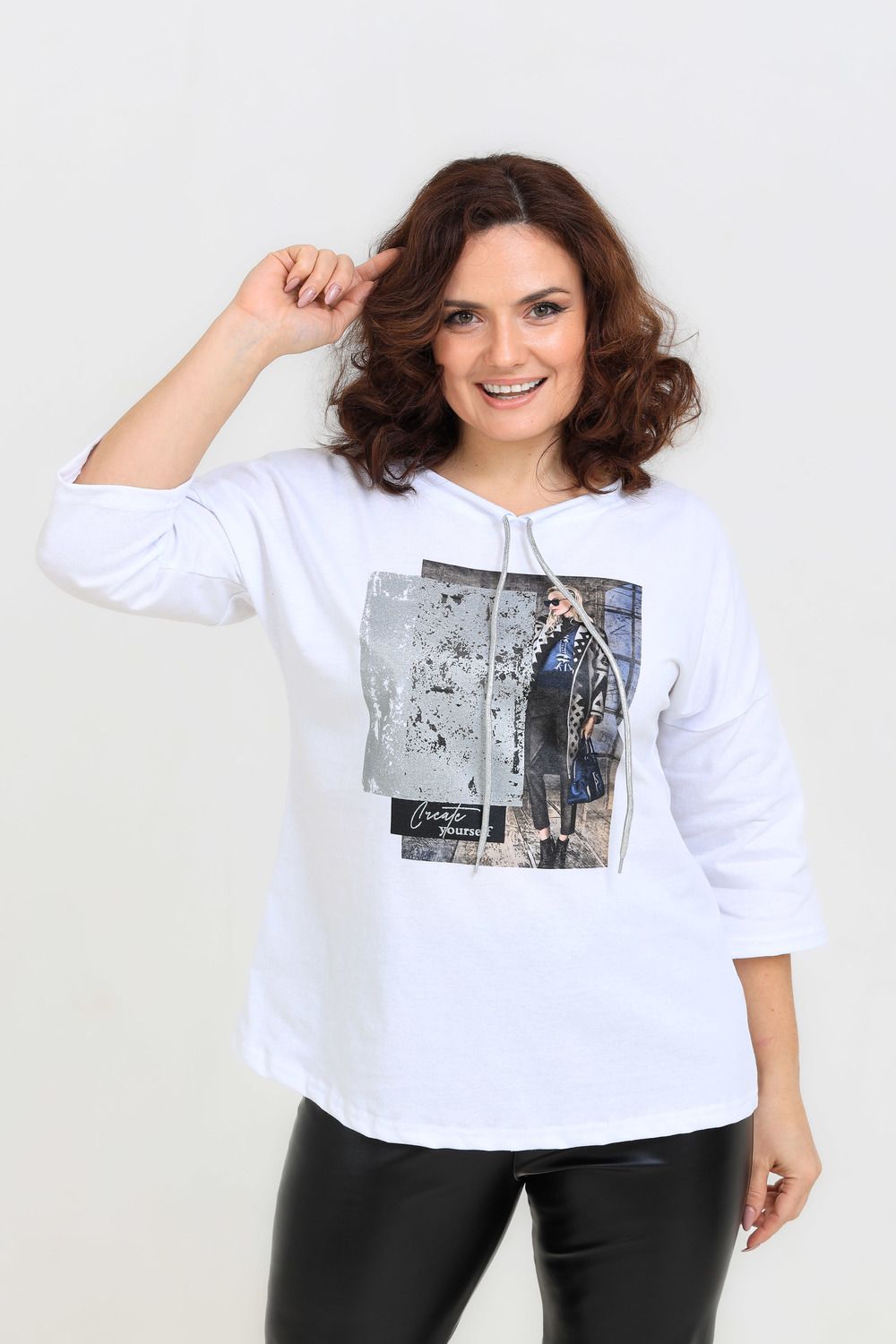 Женская футболка из мягкой, натуральной ткани. Благодаря свободному крою безупречно садится по фигуре. Горловина обработана широким кантом и дополнена серебристым шнуром, который гармонично перекликается с принтом на футболке. Рост модели на фото 169см, параметры 98-86-105