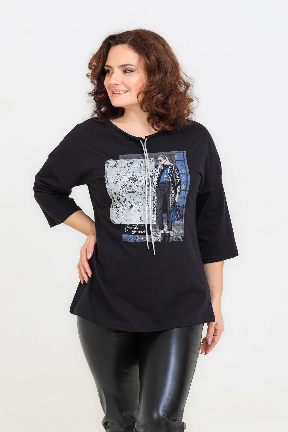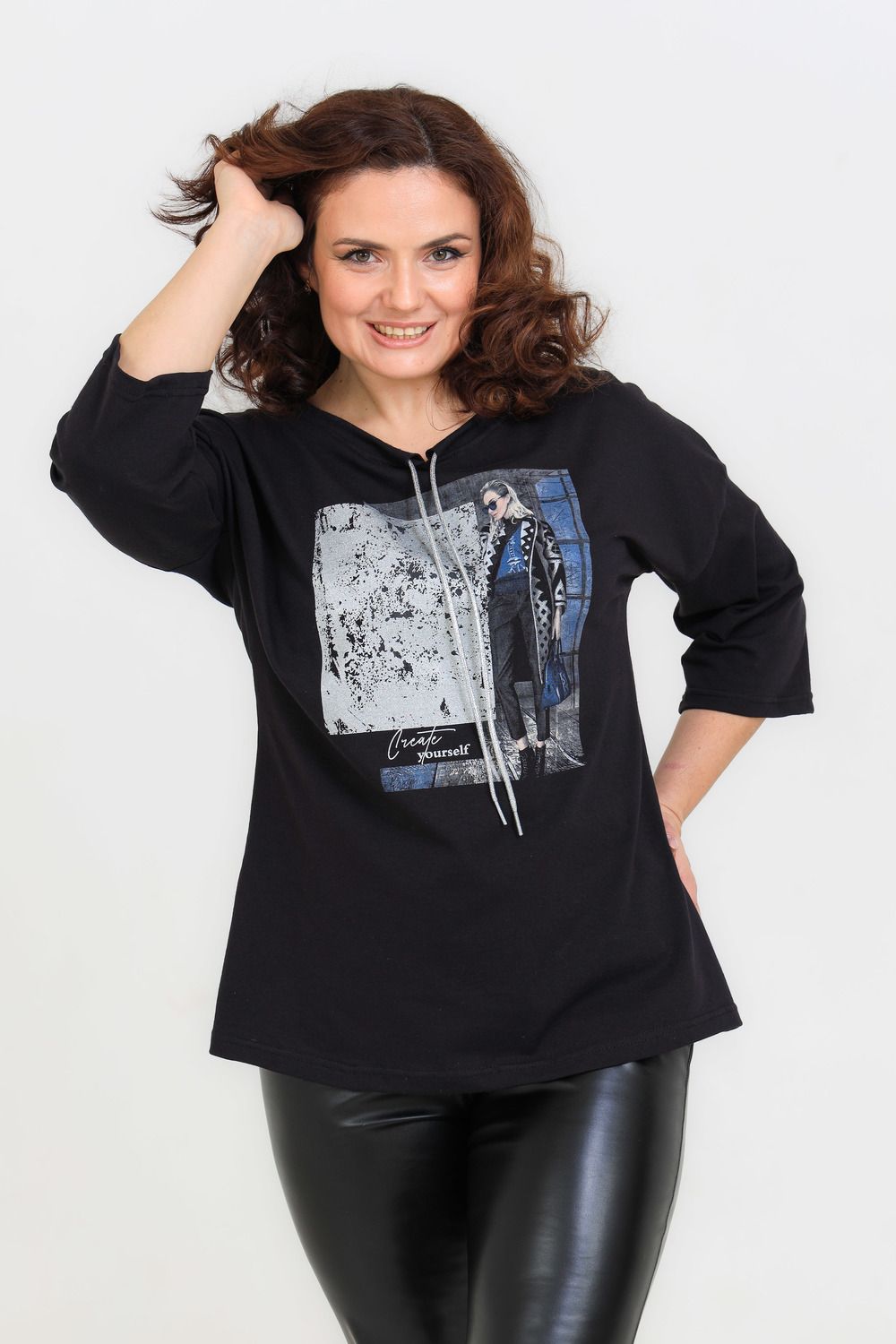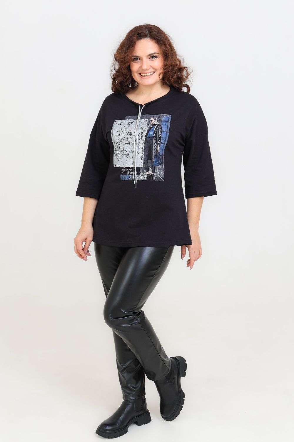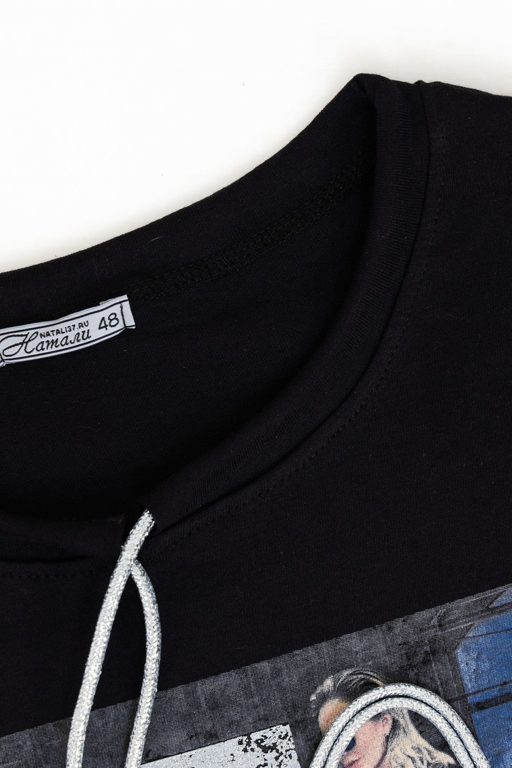 Женская футболка из мягкой, натуральной ткани. Благодаря свободному крою безупречно садится по фигуре. Горловина обработана широким кантом и дополнена серебристым шнуром, который гармонично перекликается с принтом на футболке. Рост модели на фото 169см, параметры 98-86-105