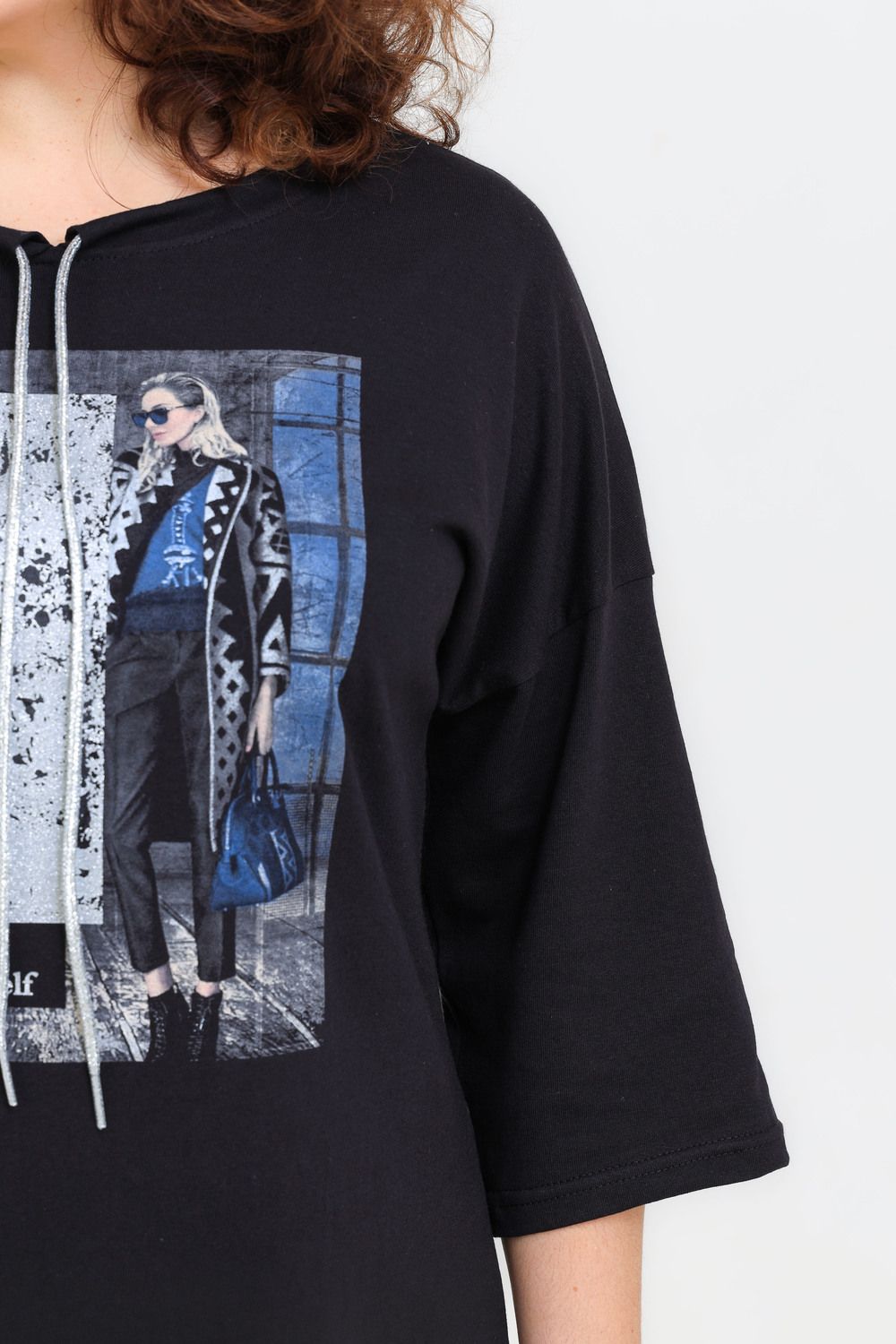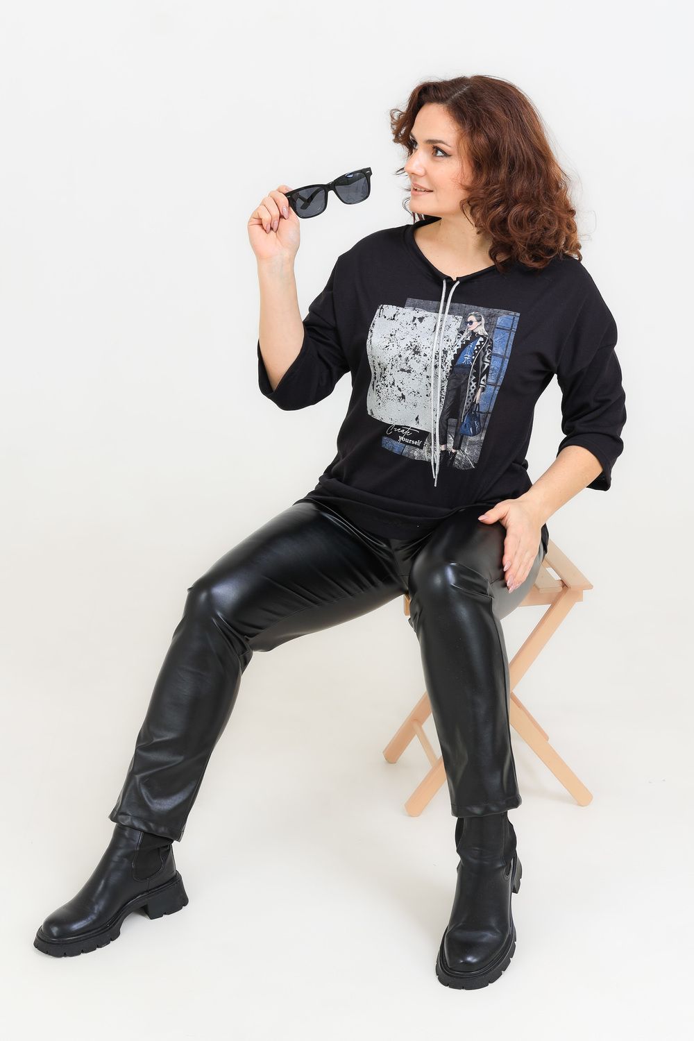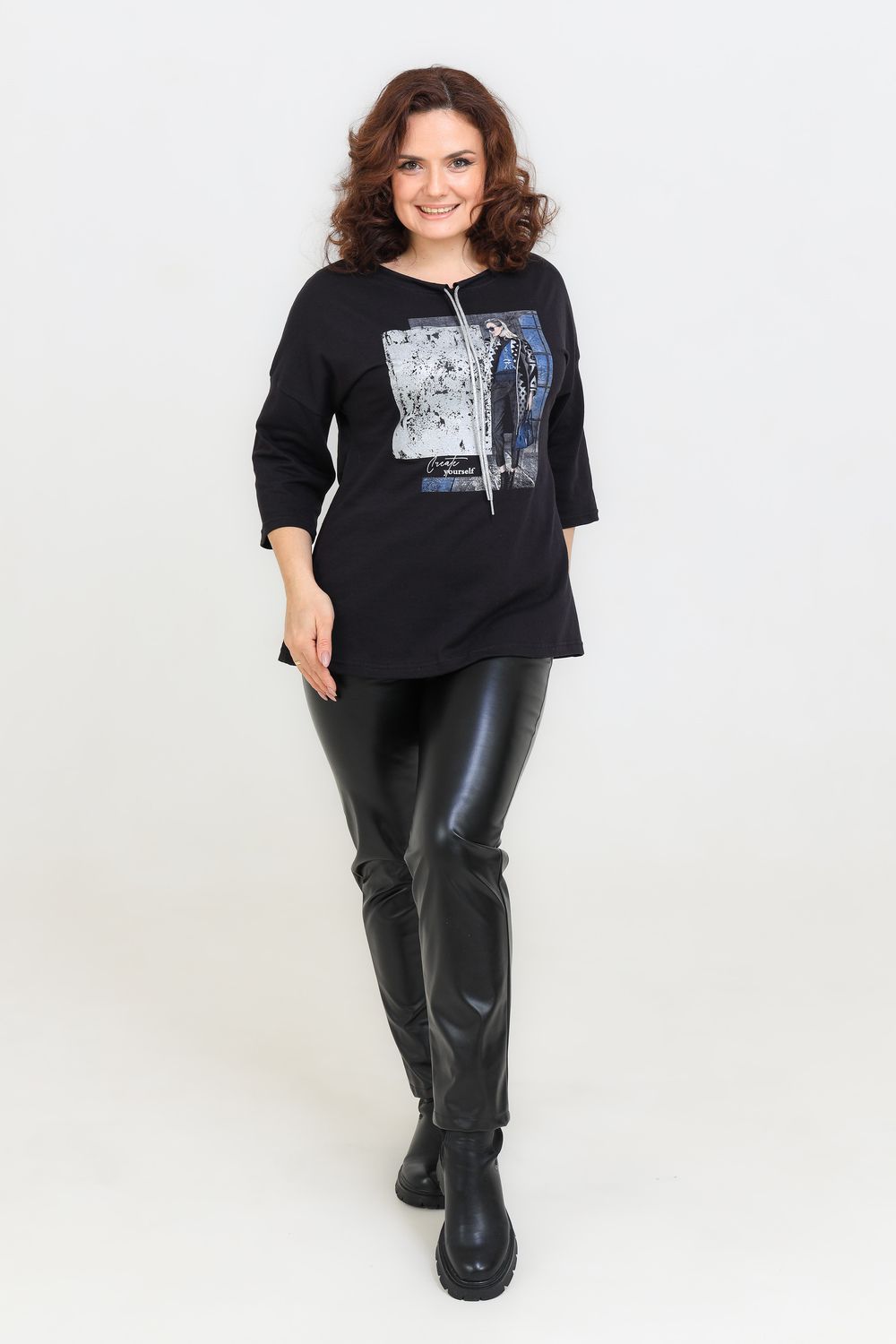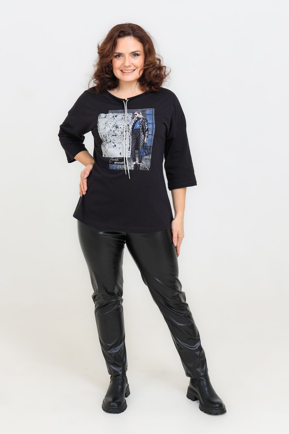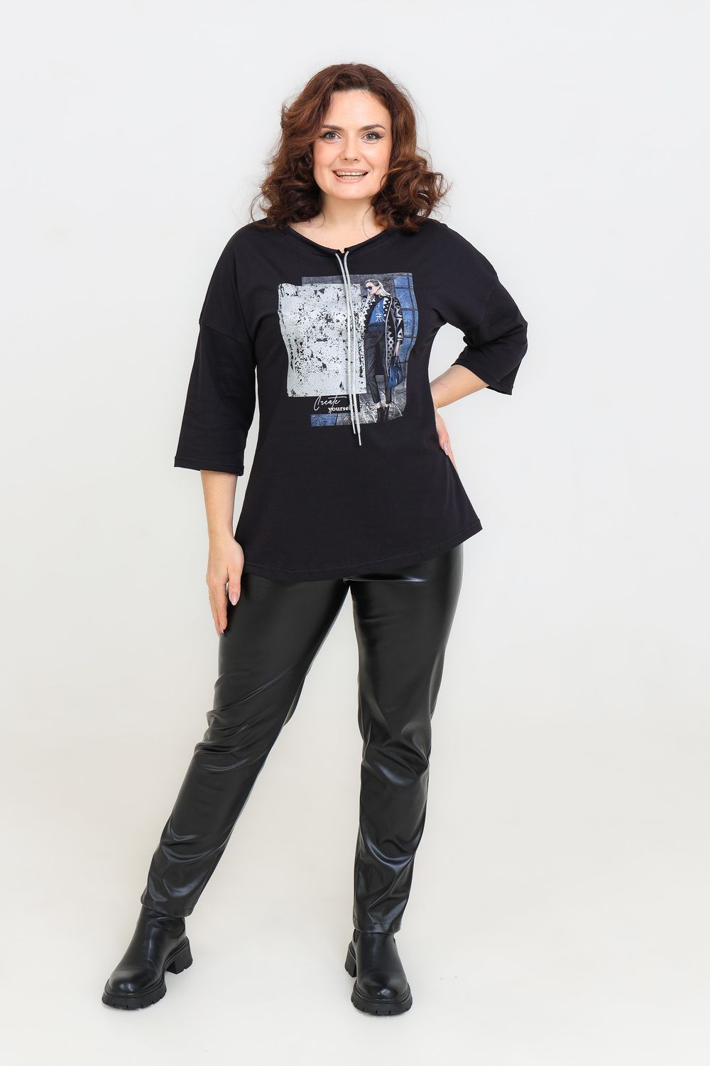 Женская футболка из мягкой, натуральной ткани. Благодаря свободному крою безупречно садится по фигуре. Горловина обработана широким кантом и дополнена серебристым шнуром, который гармонично перекликается с принтом на футболке. Рост модели на фото 169см, параметры 98-86-105
