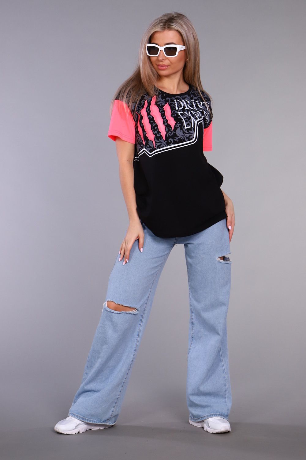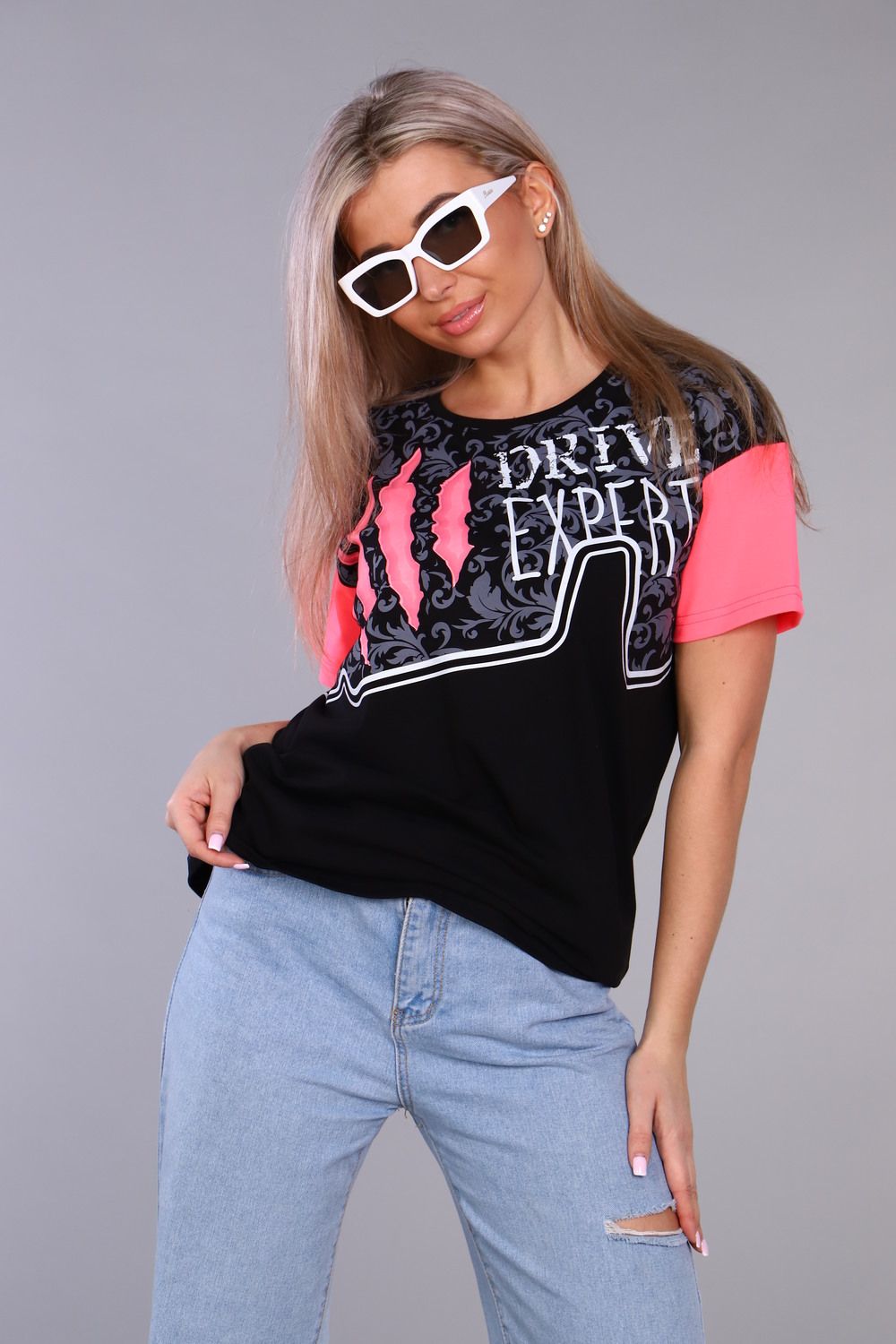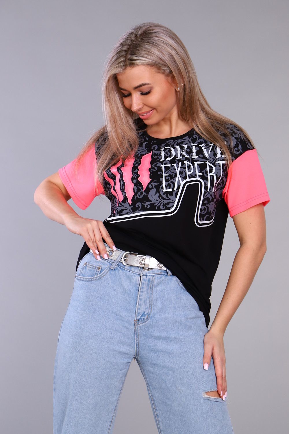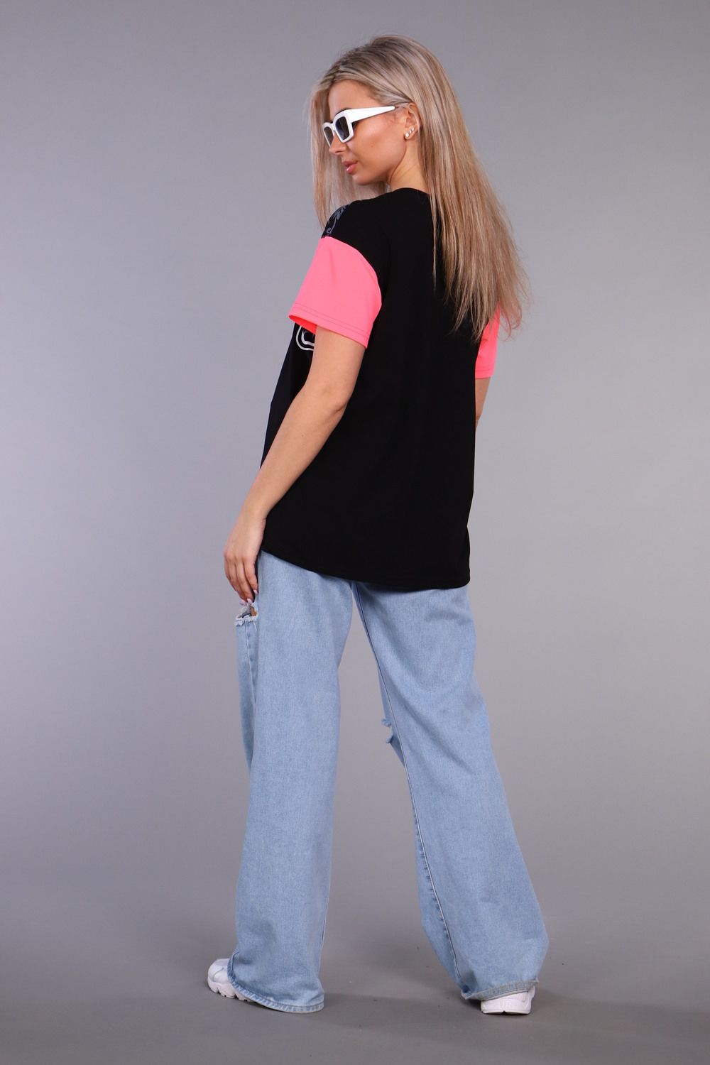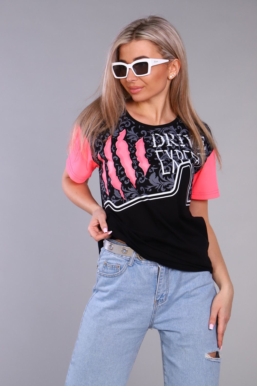 Футболка женская классическая прямого покроя, основной цвет черный, рукава 2 цветов - розового и зеленого. Оригинальный принт на полочке.