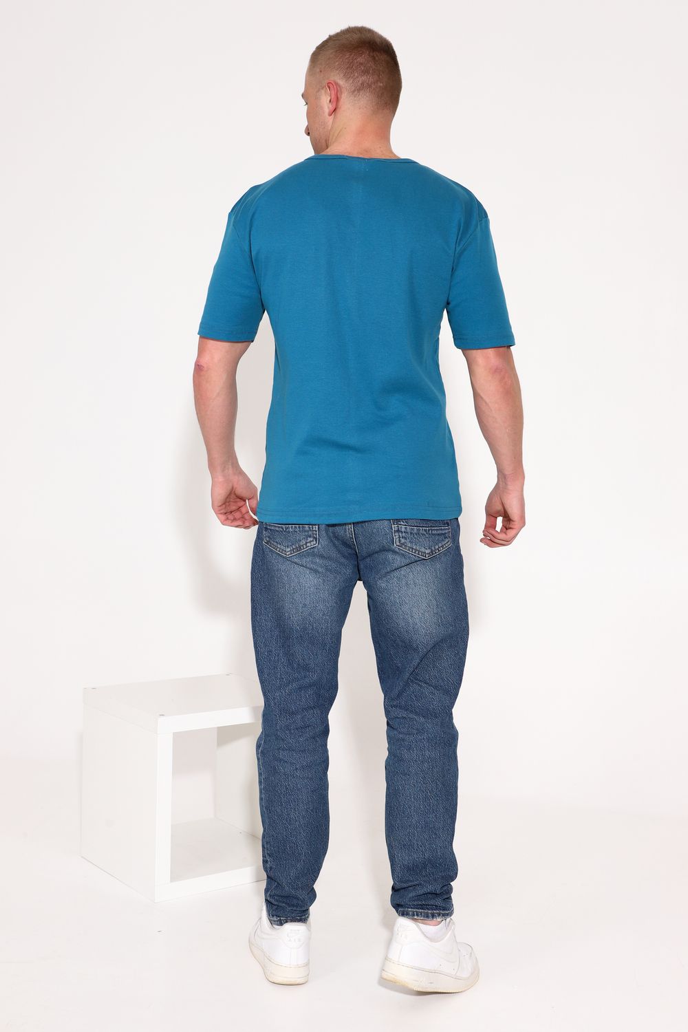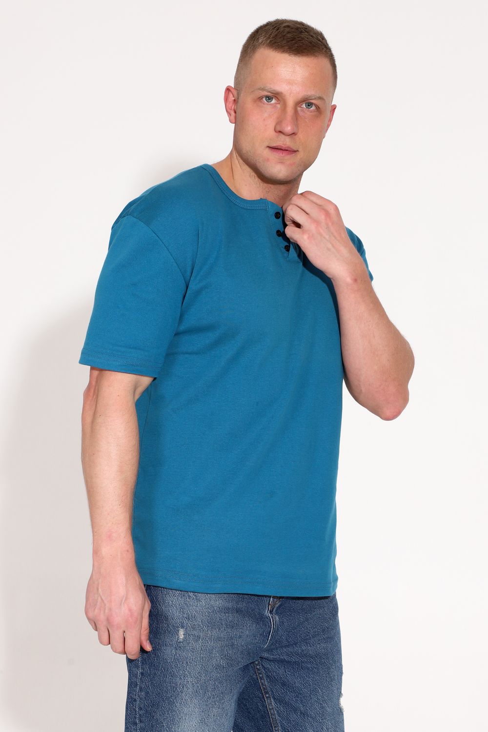 Мужская футболка прямого силуэта. Горловина декорирована треугольным вырезом со вставкой, украшена пуговицами.