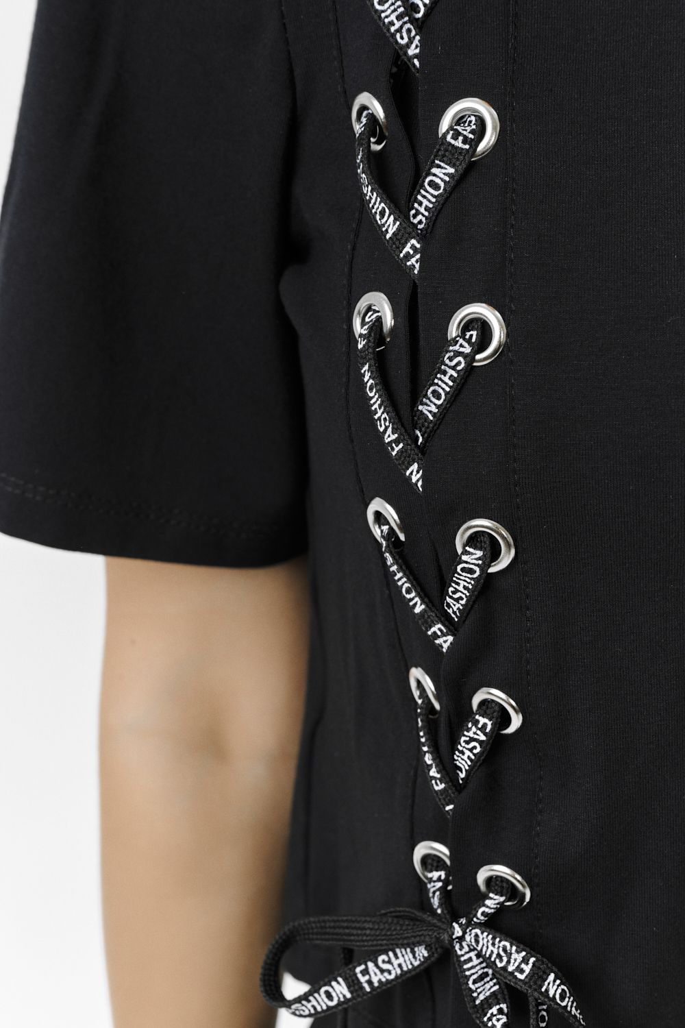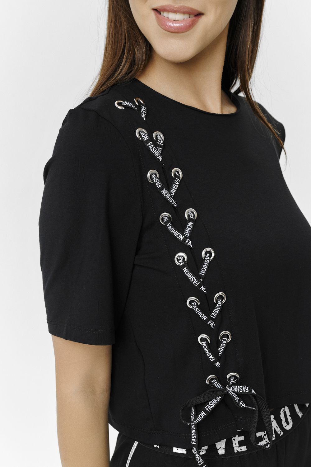Футболка женская укороченная, свободного силуэта с коротким рукавом, полочка оформлена декоративным элементом: люверсами со шнурком.