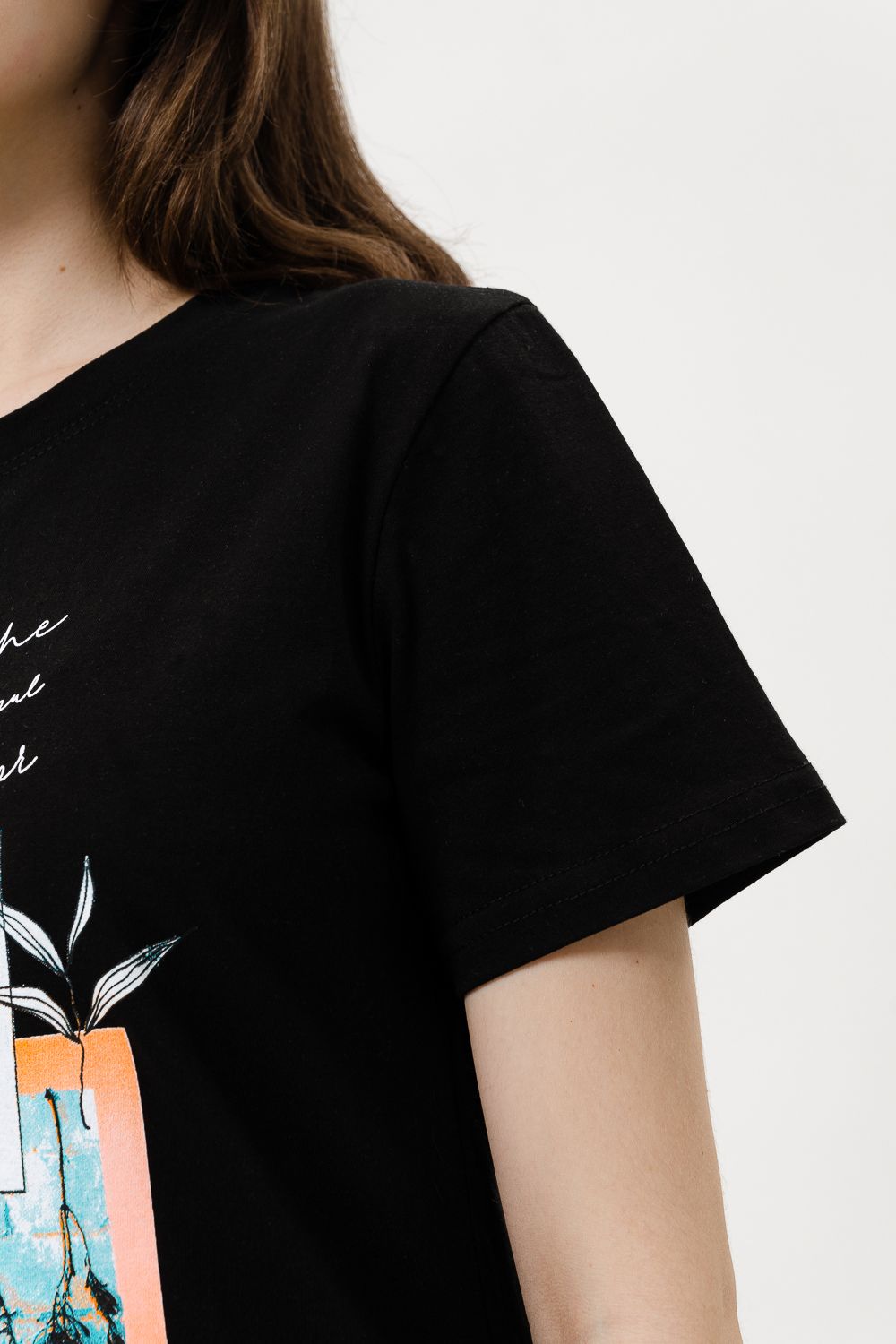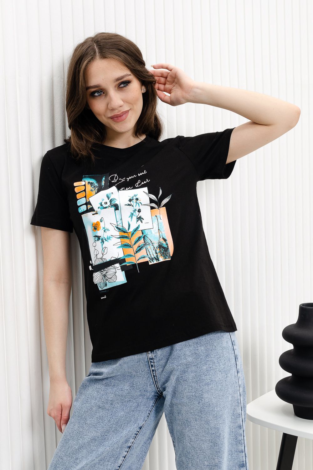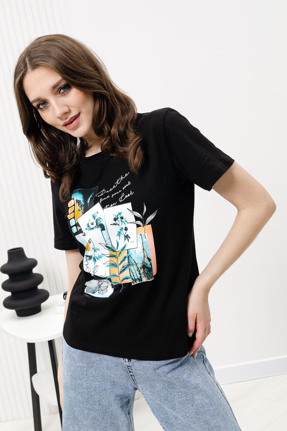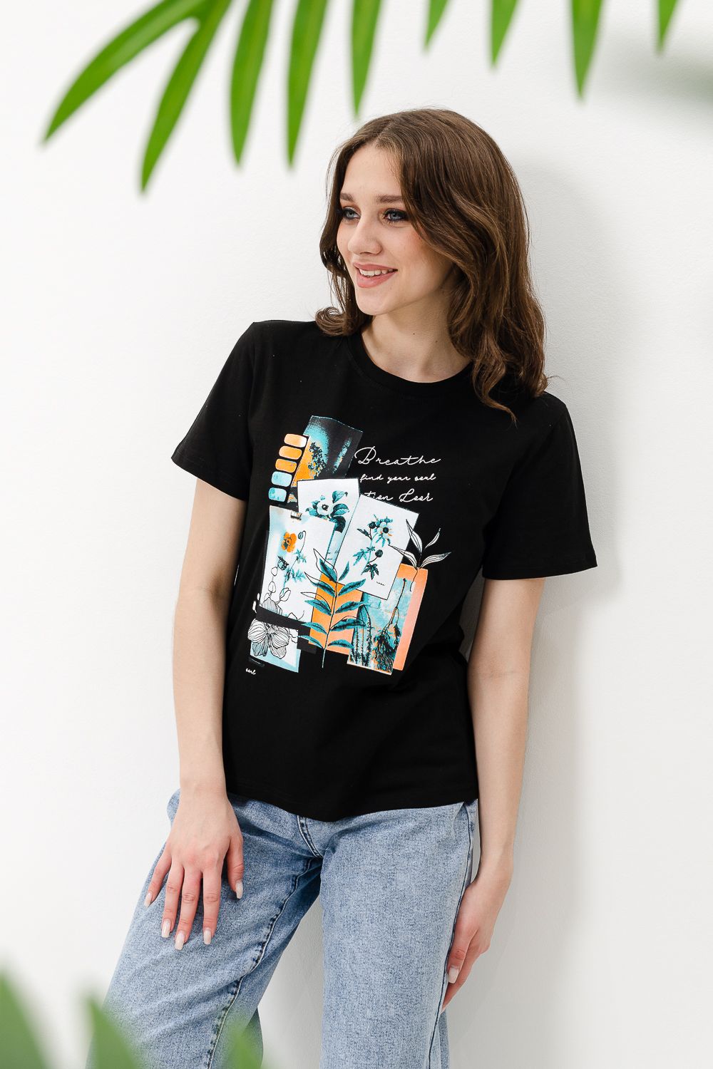 Футболка женская - это классика женского гардероба любой девушки. Это базовая модель с ярким принтом отлично смотрится с джинсами, юбками, брюками. Прямой силуэт, втачной рукав, горловина округлой формы обработана обтачкой из основного полотна.
