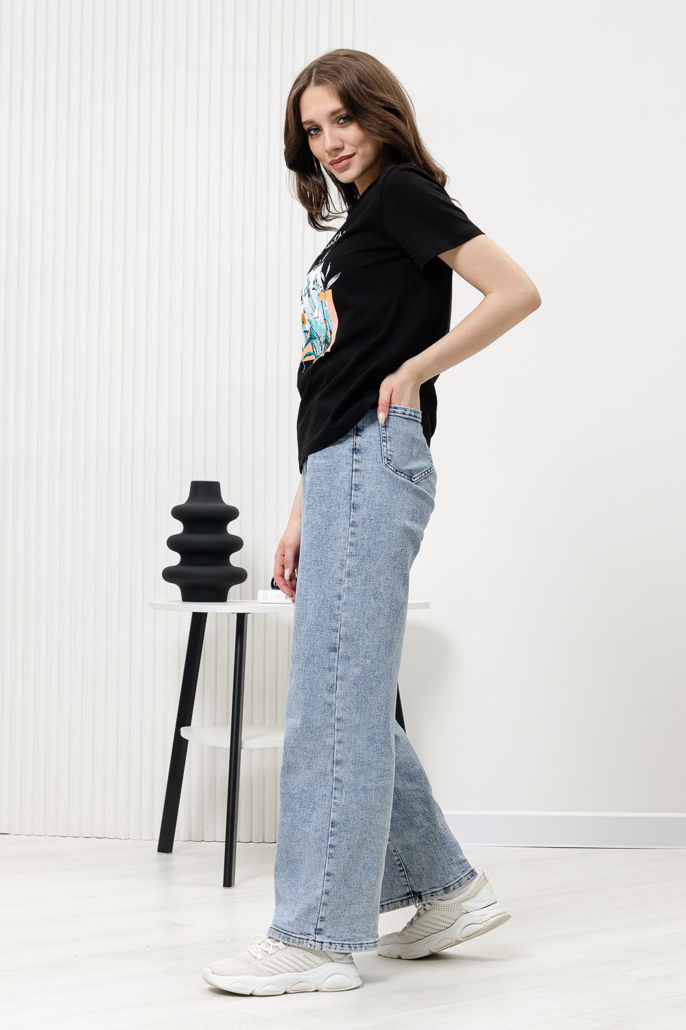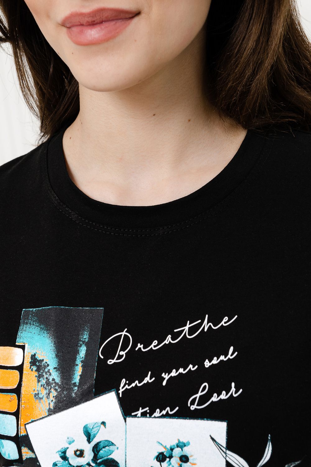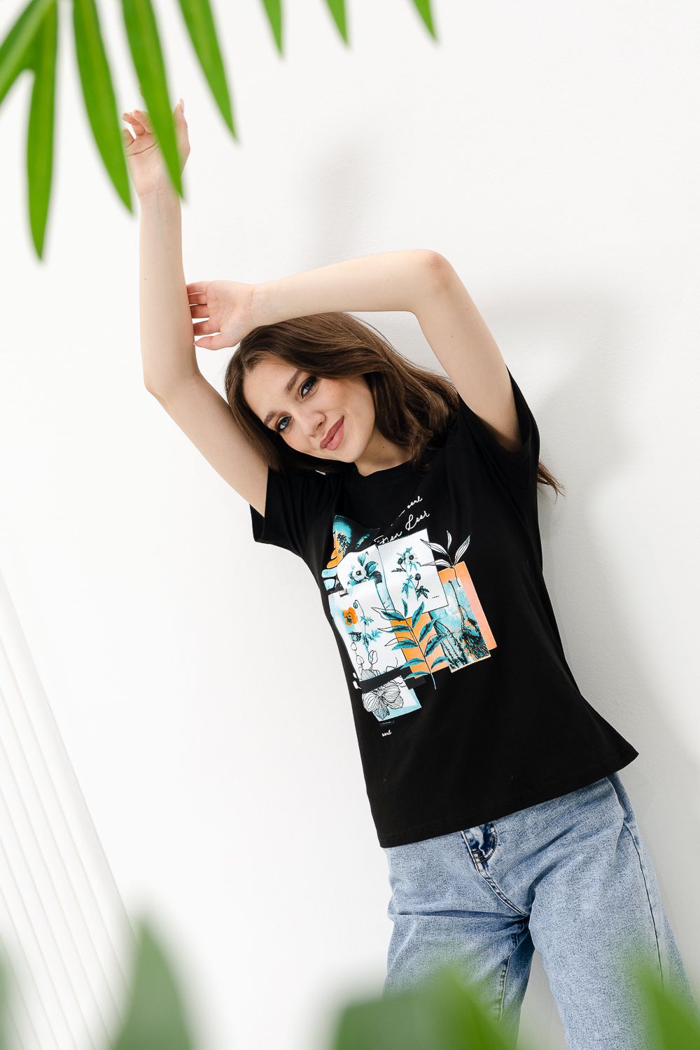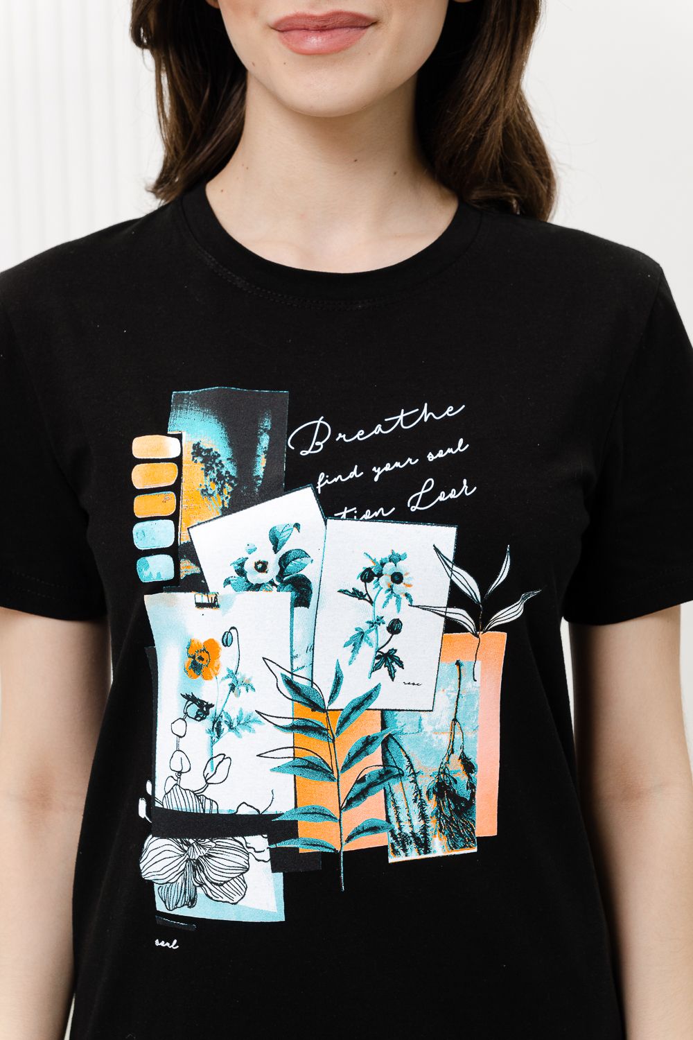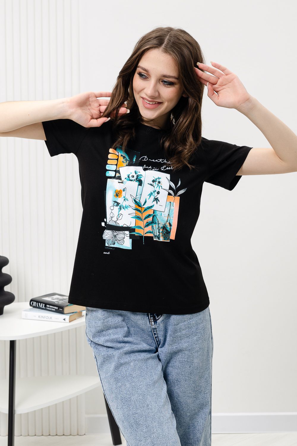 Футболка женская - это классика женского гардероба любой девушки. Это базовая модель с ярким принтом отлично смотрится с джинсами, юбками, брюками. Прямой силуэт, втачной рукав, горловина округлой формы обработана обтачкой из основного полотна.