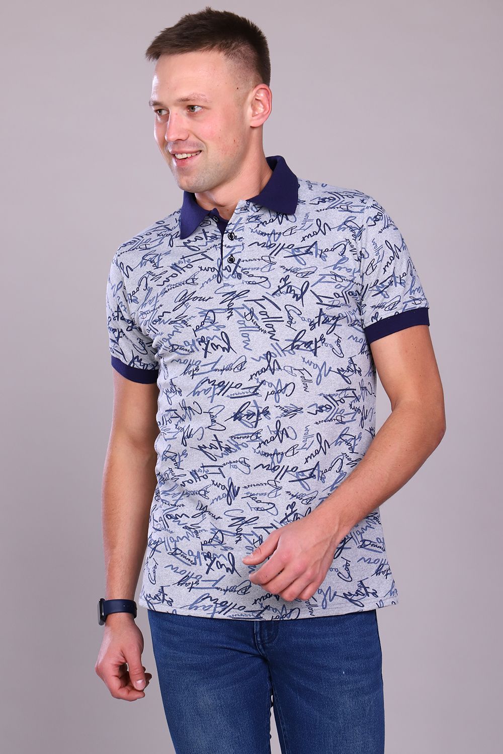 Футболка поло ткань пике лакост с рисунком в виде надписей. Воротник и манжеты вязаные, темно-синего или черного цвета. Планка на трех пуговицах. Для дома, отдыха, прогулок и спорта. Сохраняет цвет и форму после стирки.