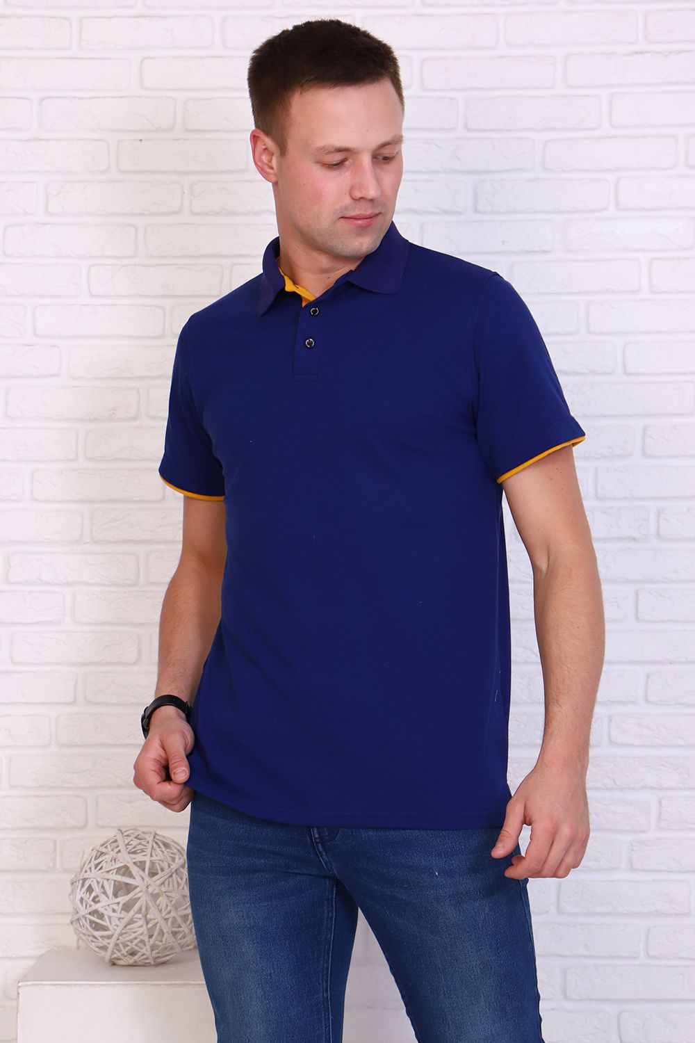 Футболка поло мужская из ткани лакост пенье 100% хлопок насыщенного синего цвета. Воротник вязаный в цвет футболки, отделка на рукаве и планка яркого контрастного цвета, по бокам разрезы. Планка застегивается на 3 пуговицы. Футболка удобная и комфортная, подойдет для повседневной носки, прогулок и отдыха, после стирки сохраняет цвет и форму.