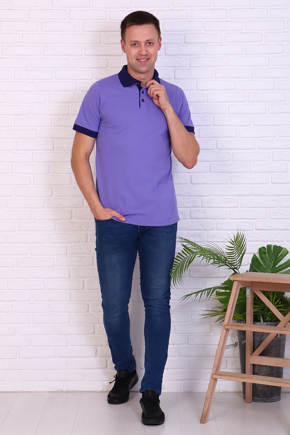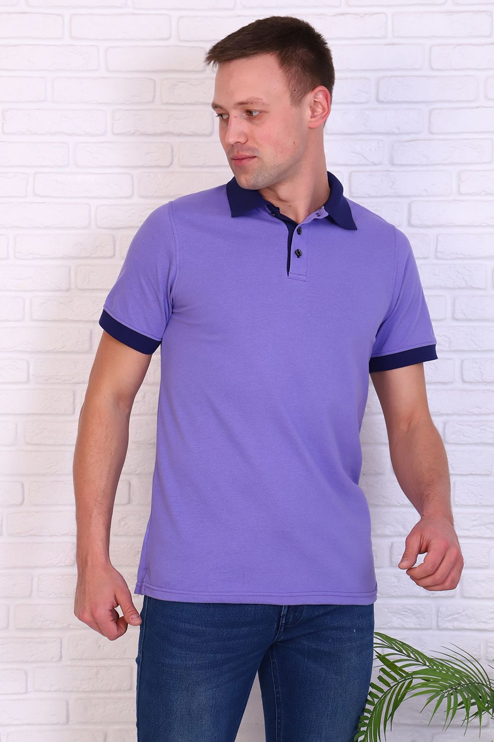 Футболка поло мужская из ткани лакост пенье 100% хлопок. Вязаные воротник и манжеты, планка на 3 пуговицы контрастного синего цвета, по бокам разрезы. Футболка удобная и комфортная, подойдет для повседневной носки, прогулок и отдыха, после стирки сохраняет цвет и форму.