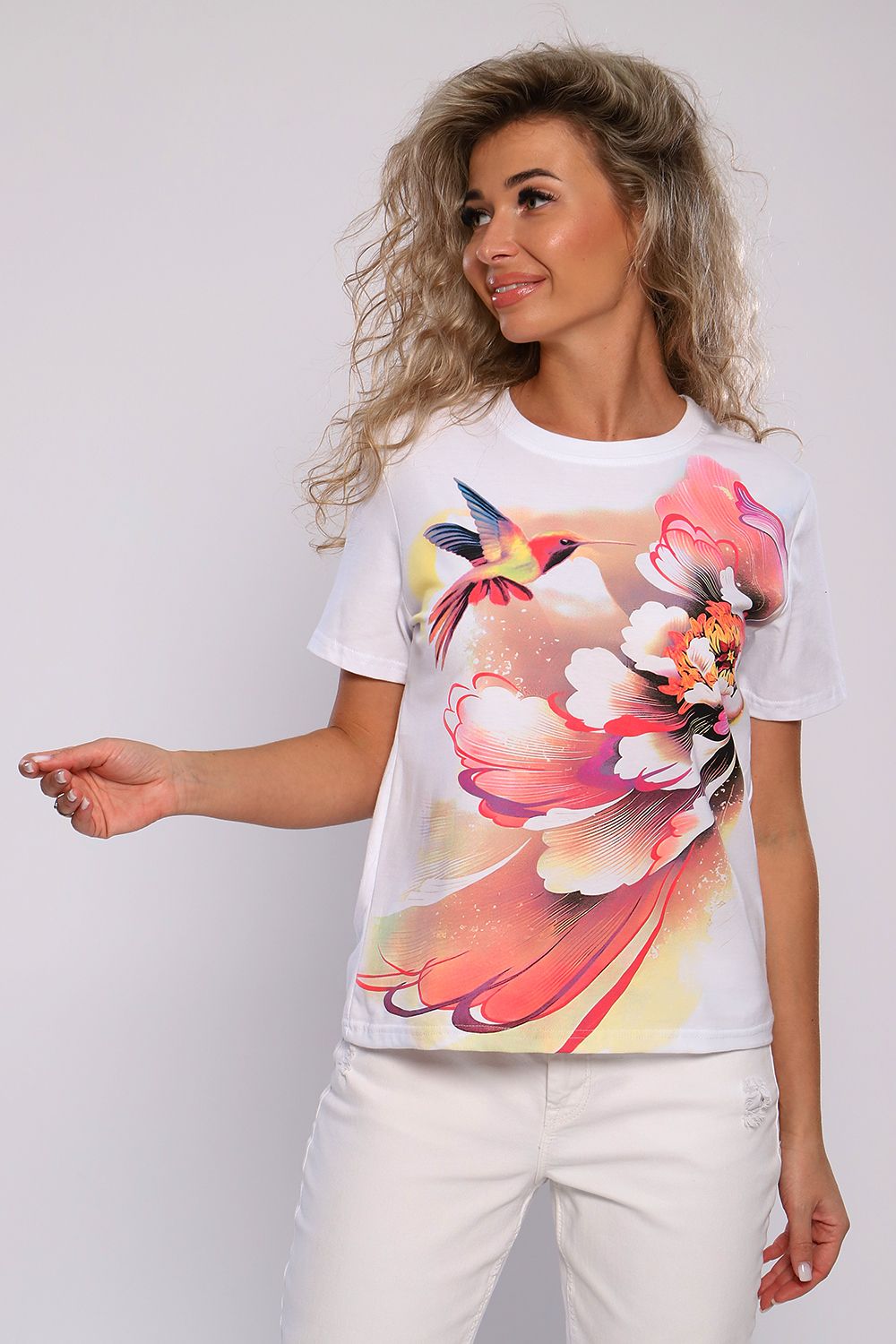 Футболка классического фасона, прямого кроя, с коротким рукавом и округлым вырезом. Декорирована принтом. Универсальная модель футболки отлично подойдет для любого образа и станет необходимой вещью в вашем гардеробе