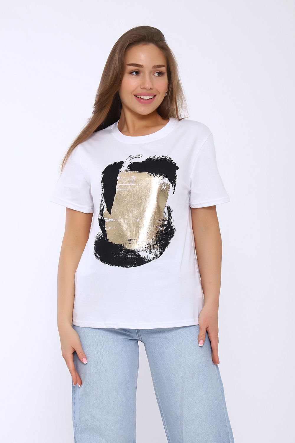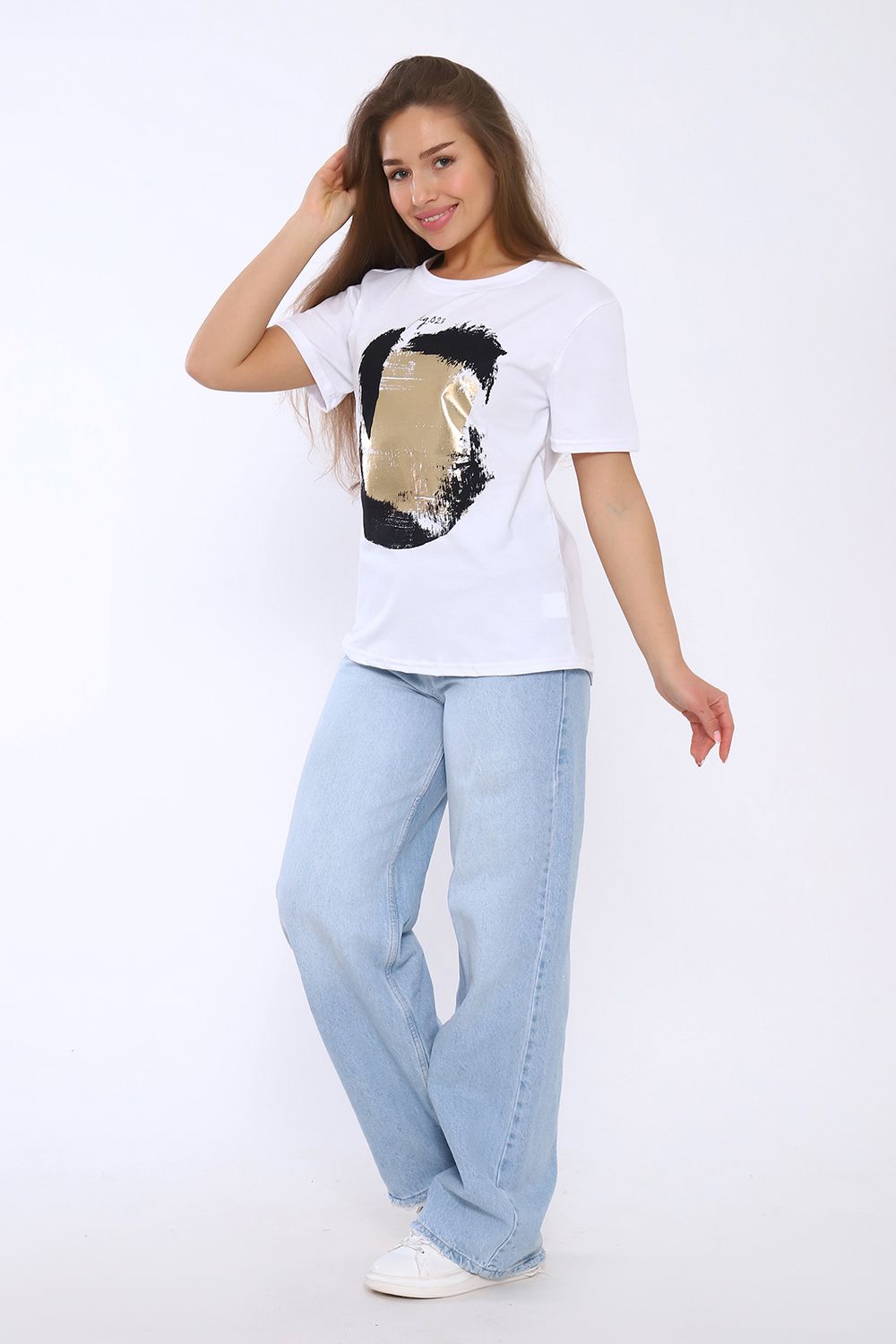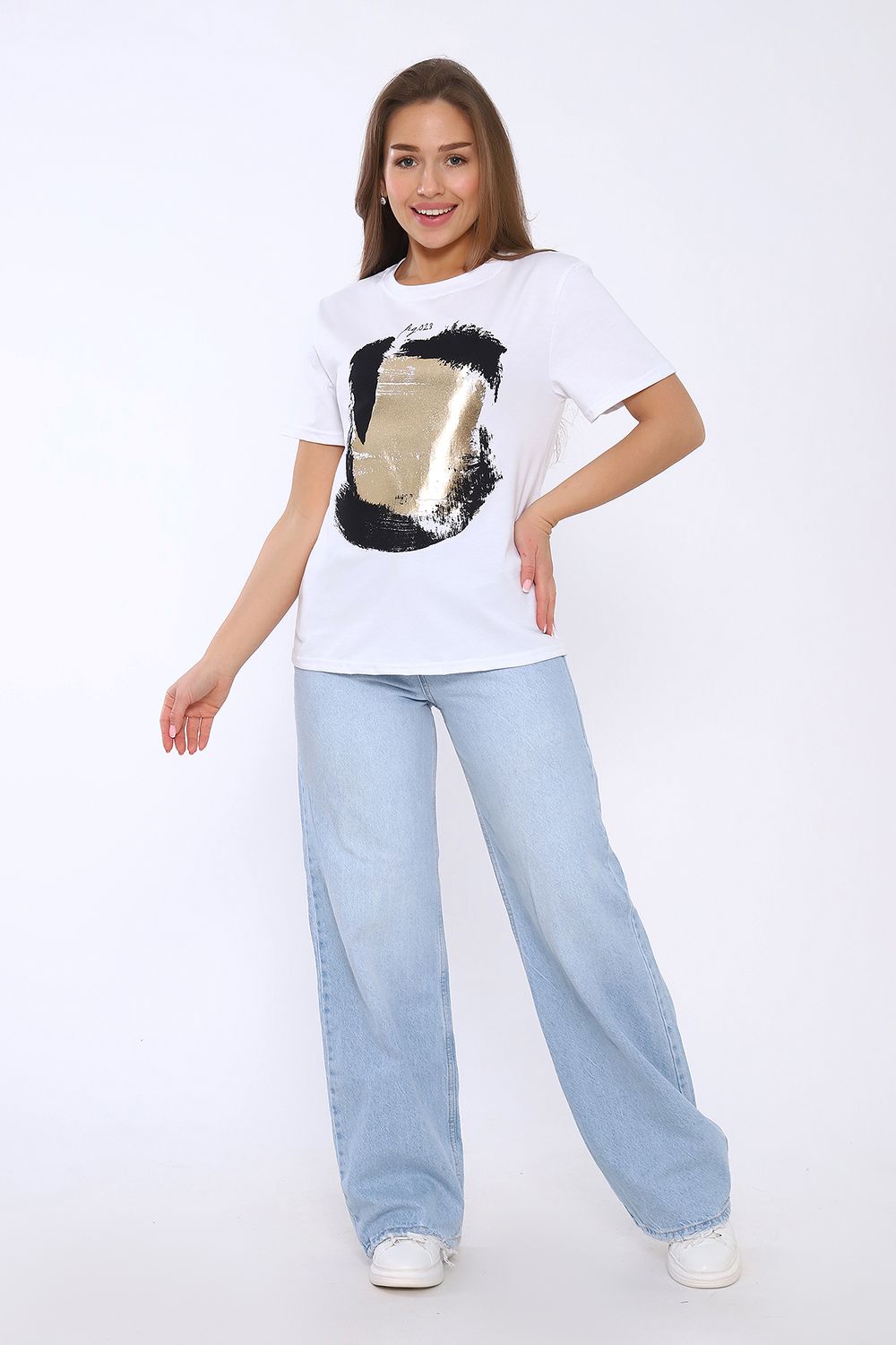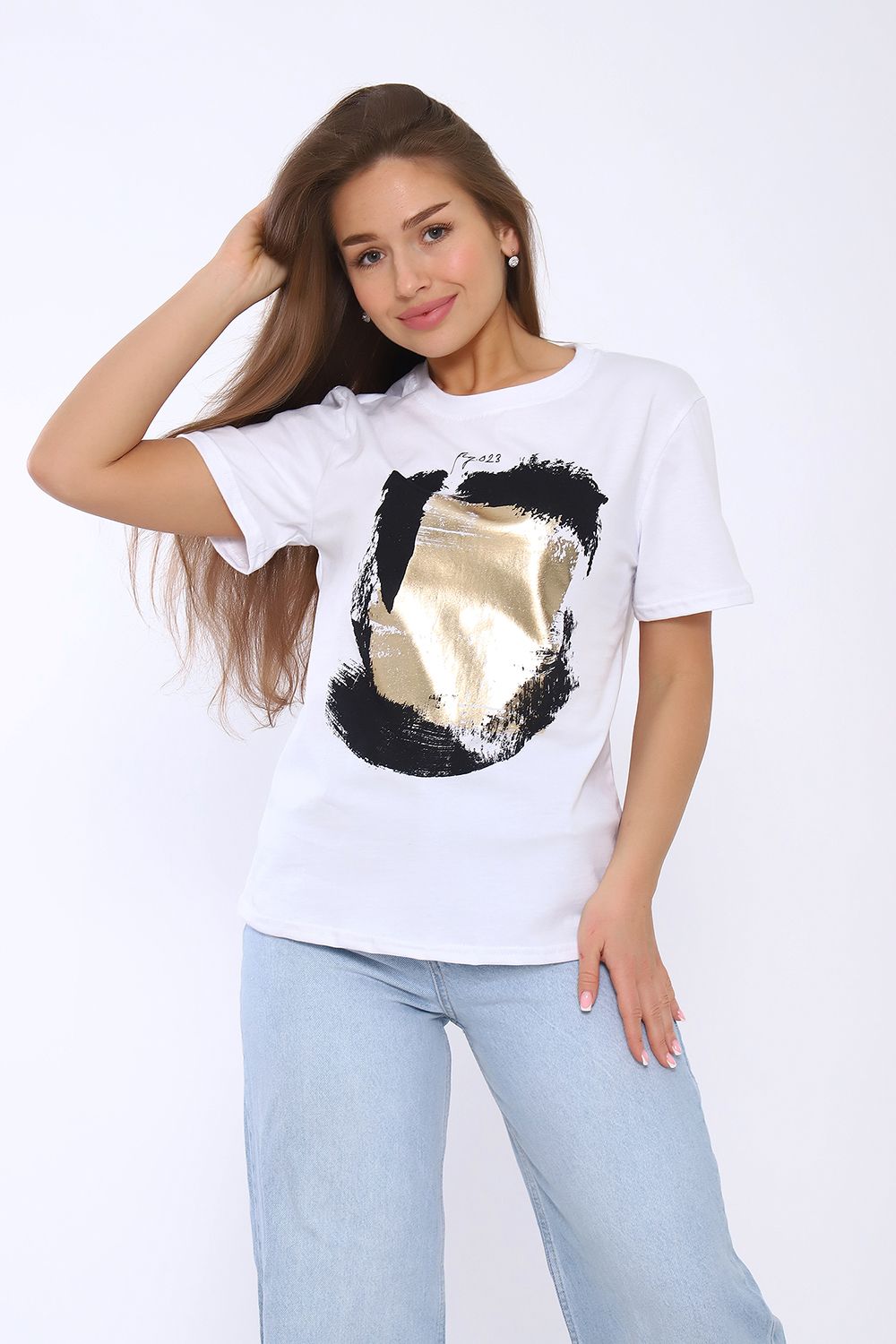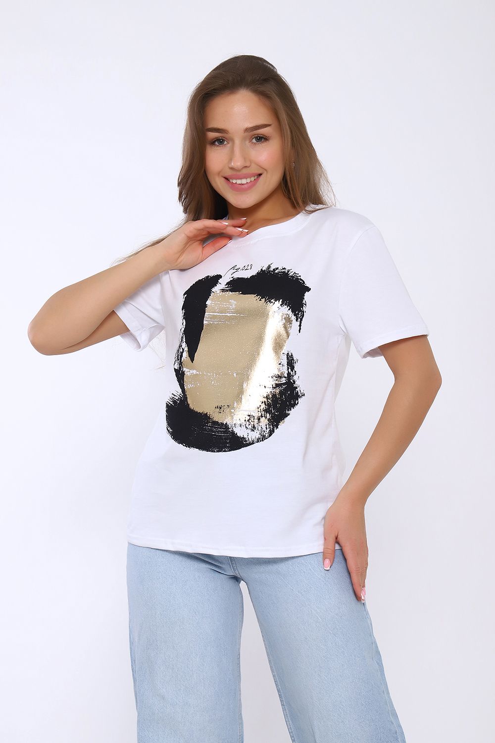 Футболка классического фасона, прямого кроя, с коротким рукавом и округлым вырезом. Декорирована принтом. Универсальная модель футболки отлично подойдет для любого образа и станет необходимой вещью в вашем гардеробе. Ткань кулирка пенье, плотность 160 г.