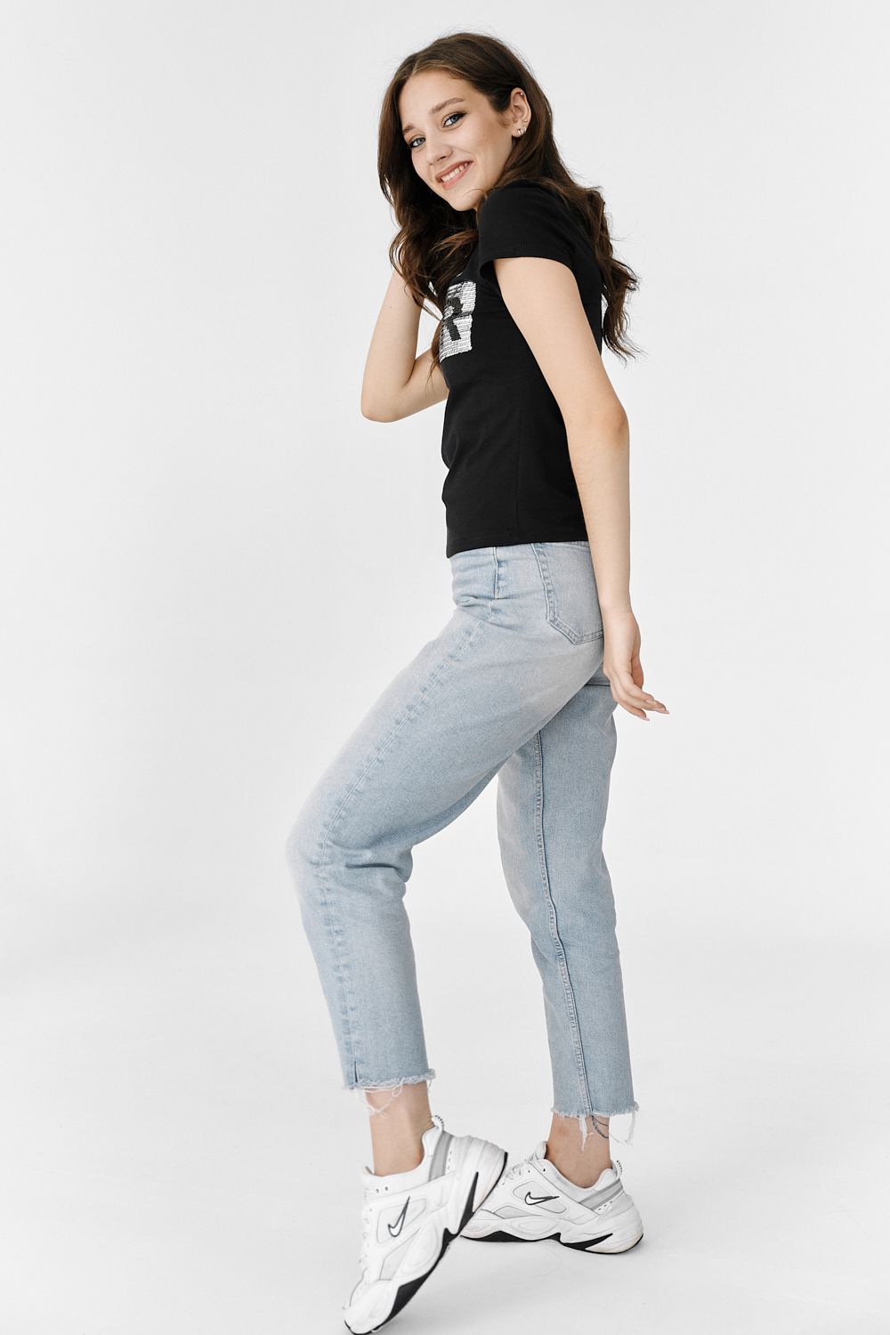 Футболка полуприлегающего силуэта, с округлой горловиной, длиной до середины бедра. Рукав втачной короткий. Горловина обработана бейкой из основного полотна. Пайетки двусторонние