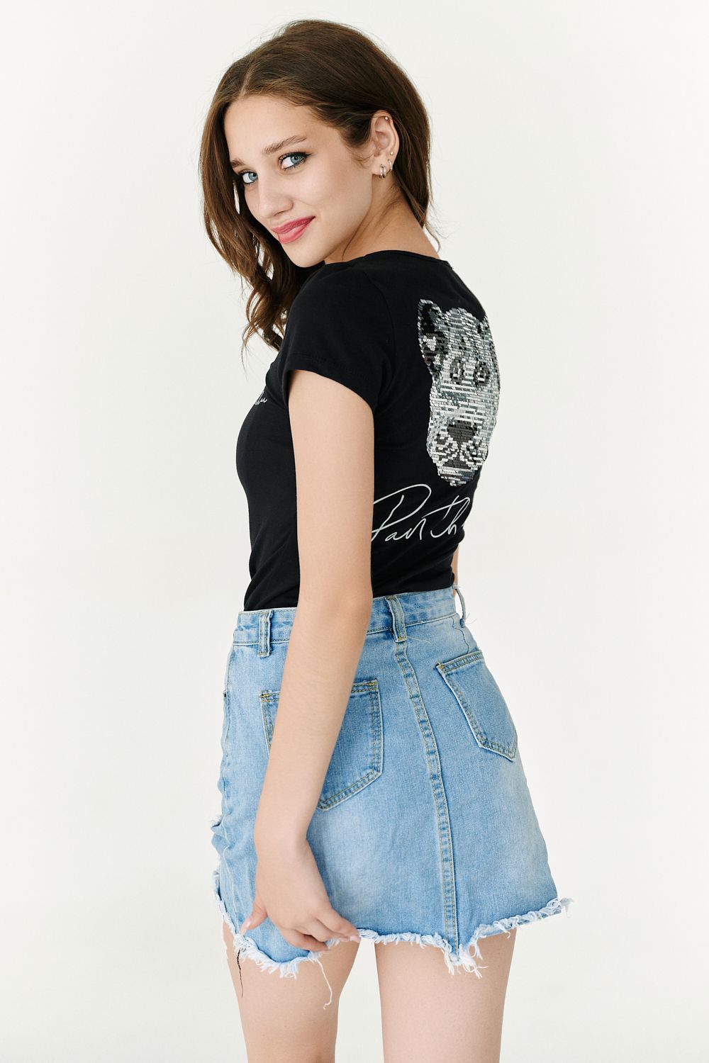 Футболка полуприлегающего силуэта, с округлой горловиной, длиной до середины бедра. Рукав втачной короткий. Горловина обработана бейкой из основного полотна. На спине большая аппликация из пайеток в виде головы пантеры и печать-надпись серебряным глиттером. На передней полочке небольшая печать.