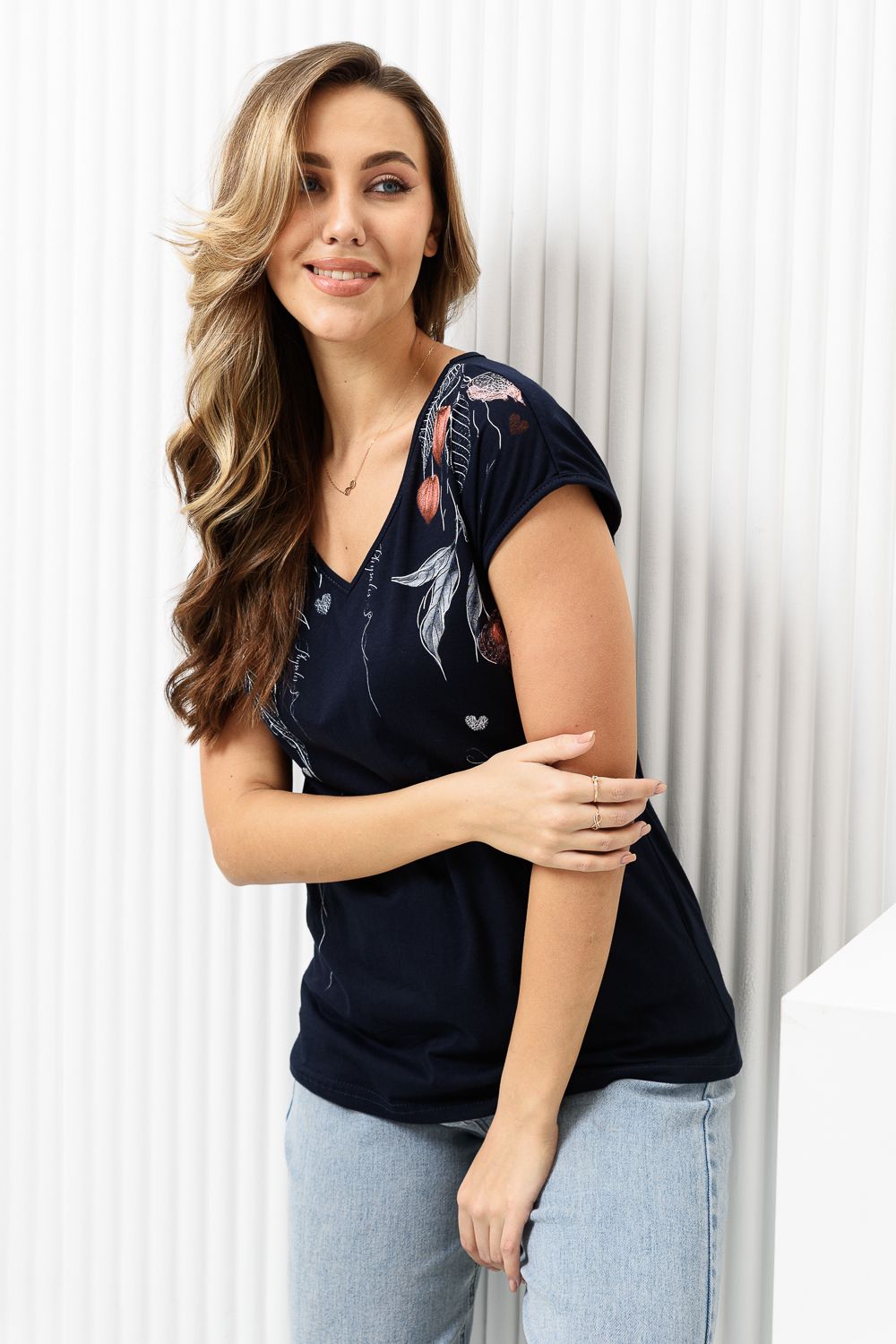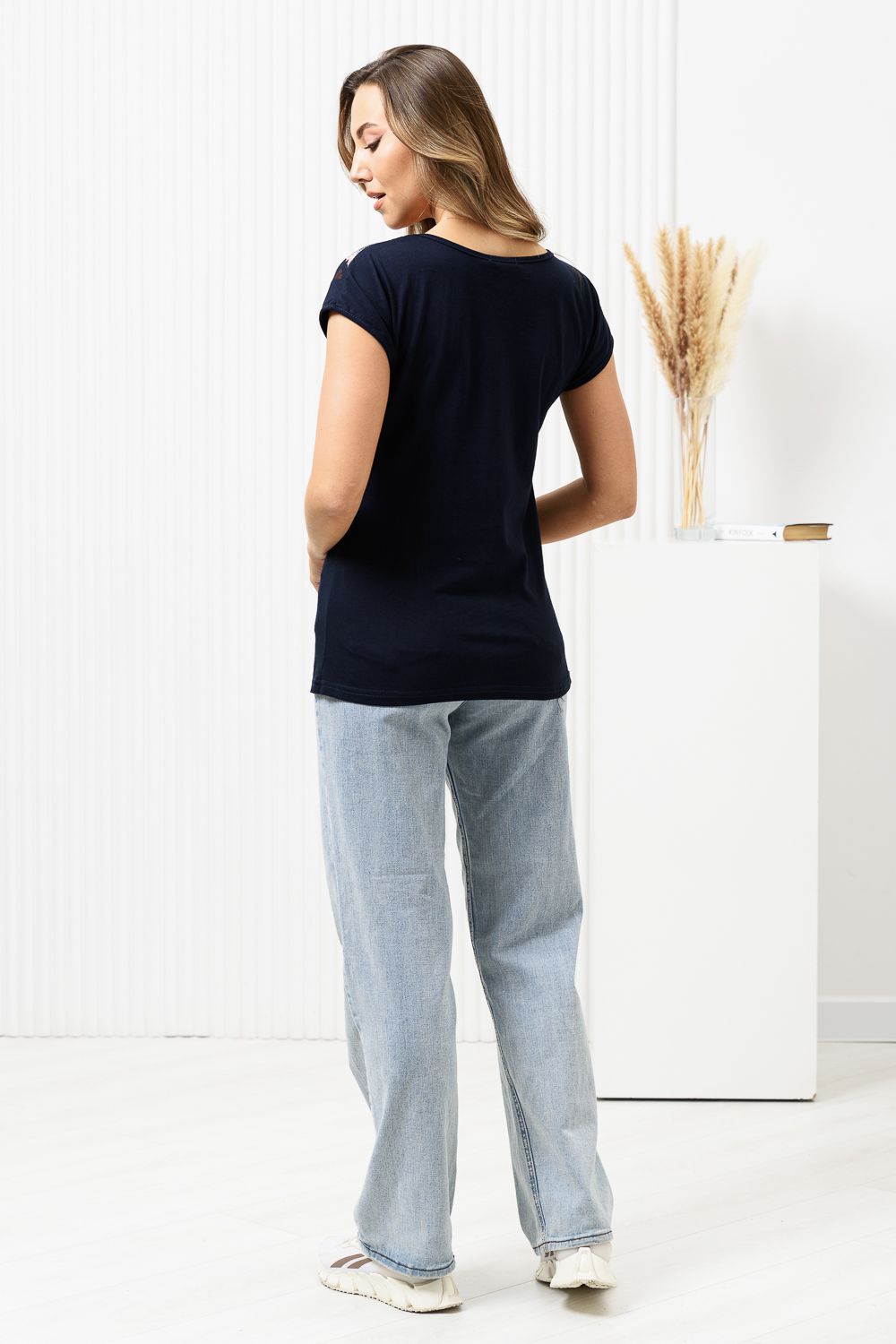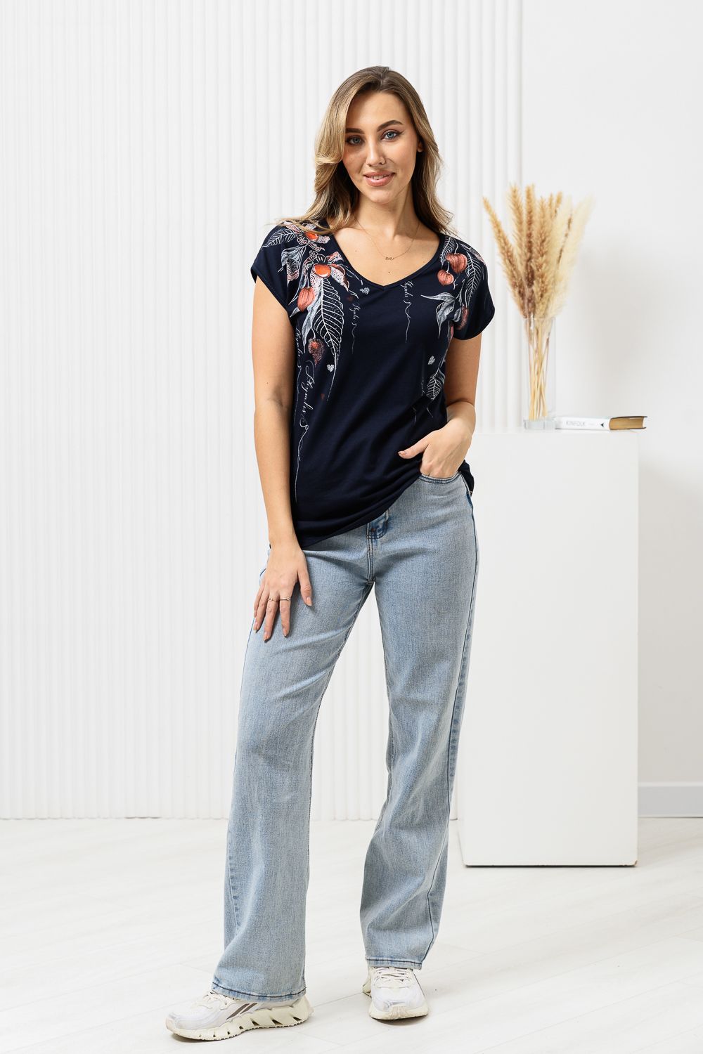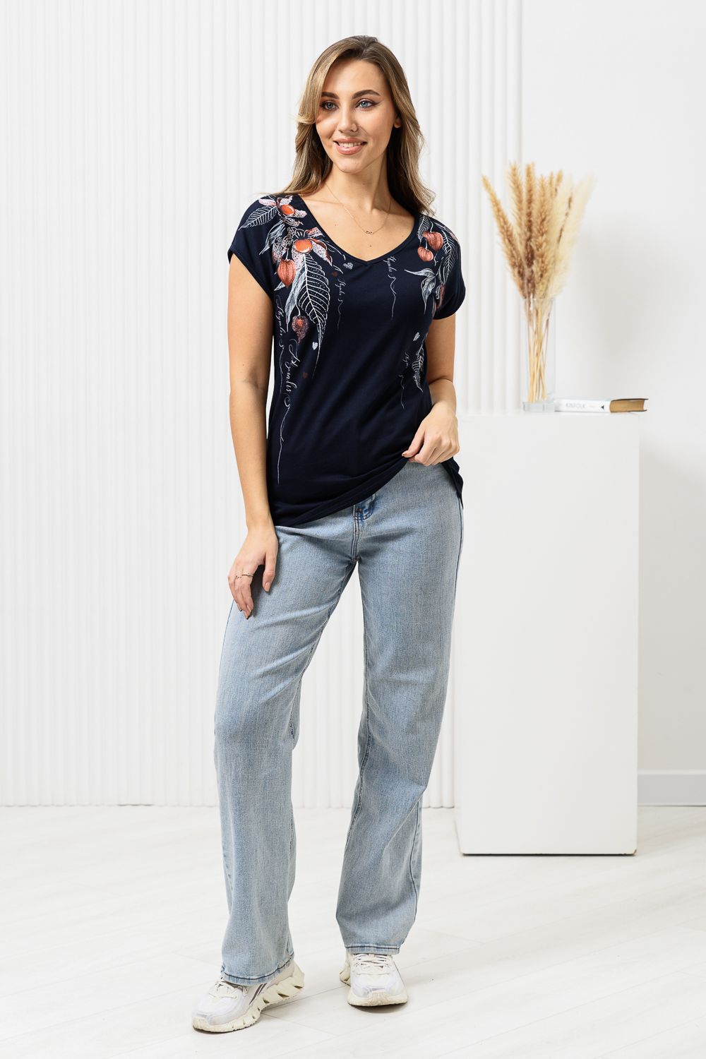Футболка полуприлегающего силуэта, средней длины, с V-образной горловиной. Рукав цельнокроеный, короткий. Горловина и пройма обработаны бейкой из основного полотна. допустимо различие в цвете от представленного на фото.
