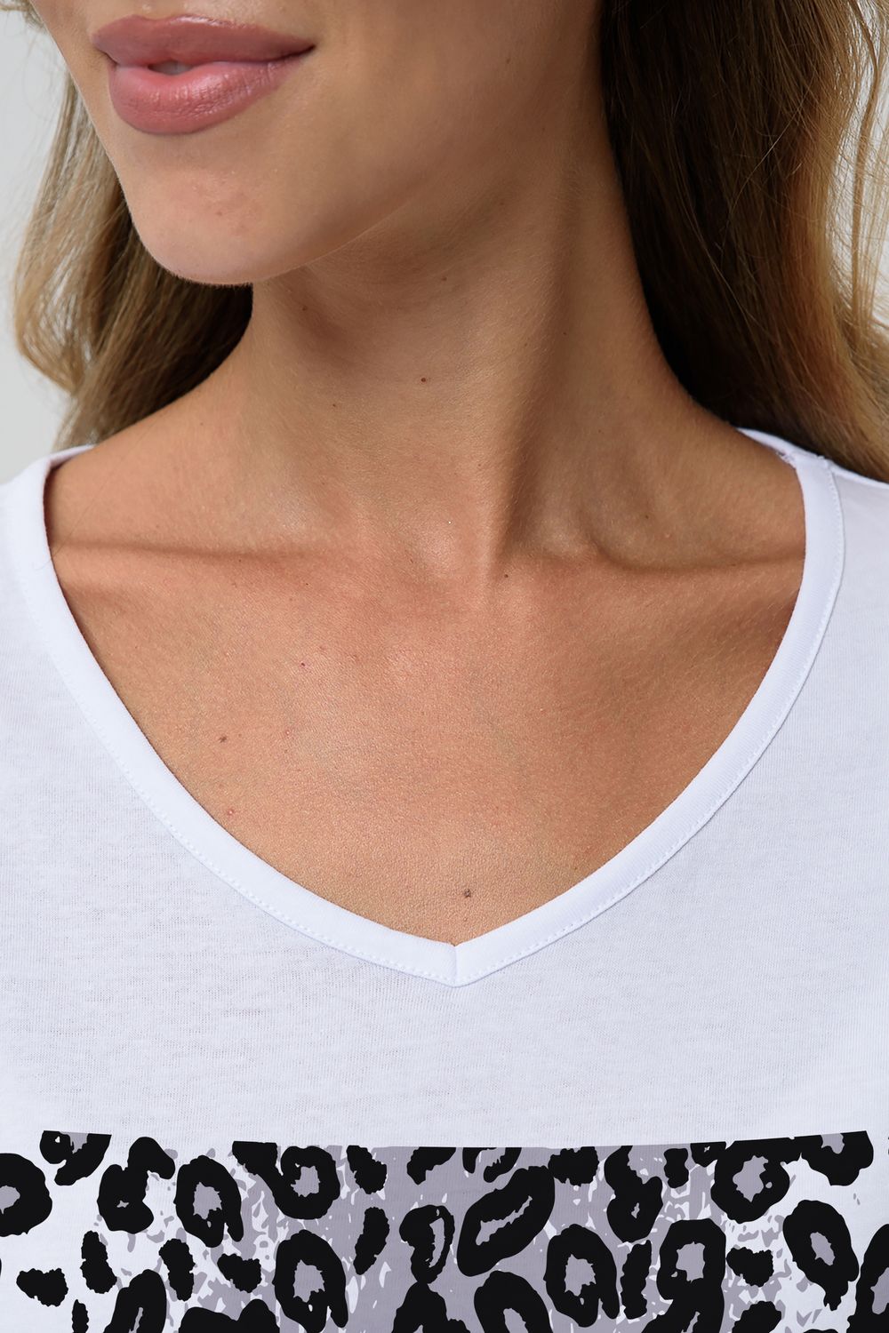 Футболка полуприлегающего силуэта, средней длины, с V-образной горловиной. Рукав цельнокроеный, короткий. Горловина и пройма обработаны бейкой из основного полотна. допустимо различие в цвете от представленного на фото.