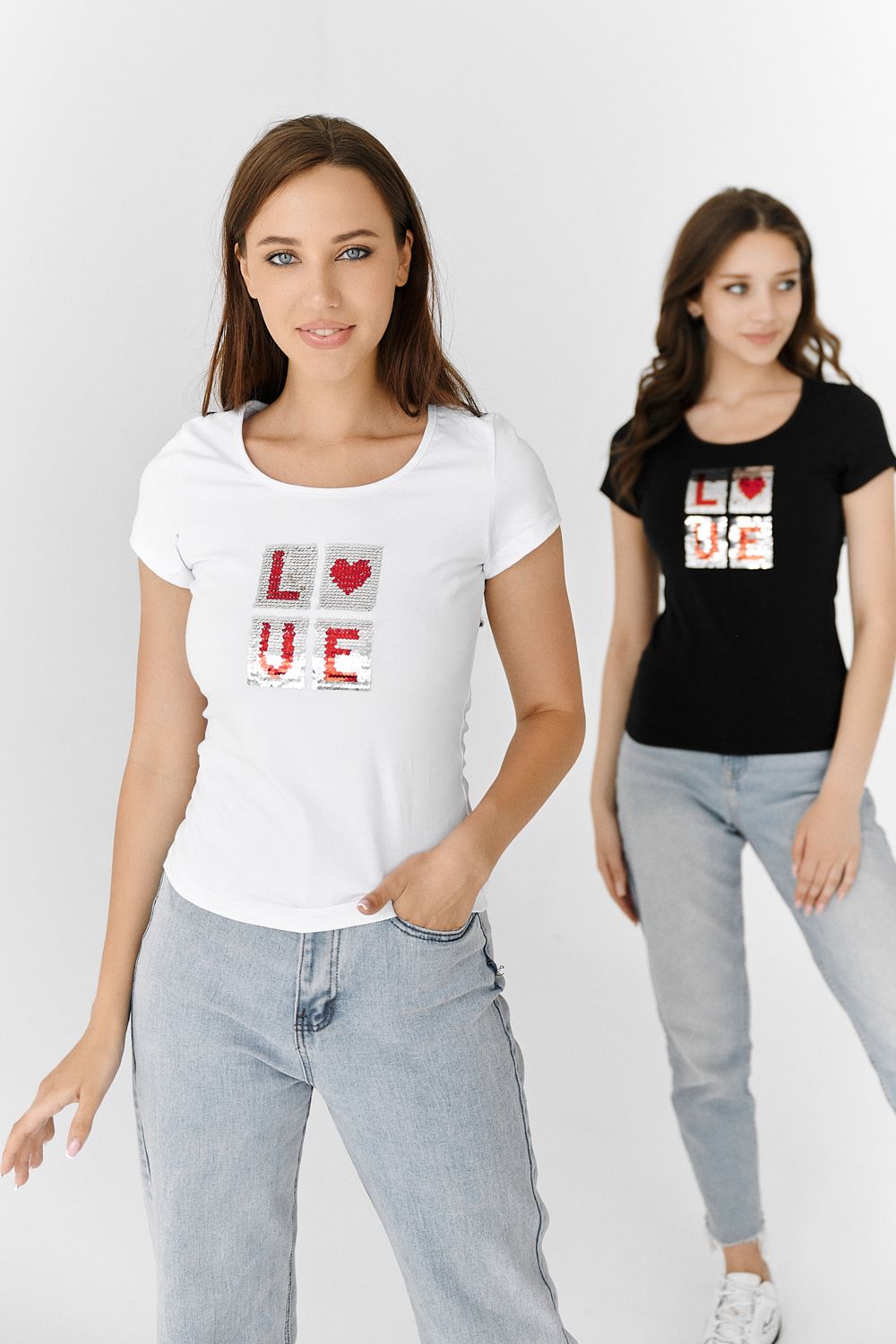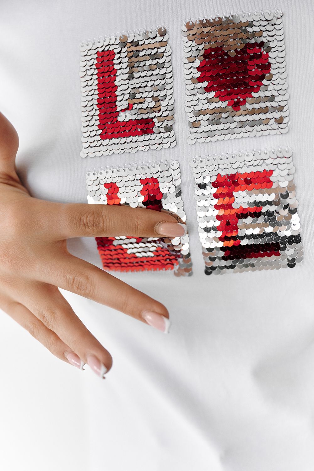 Футболка полуприлегающего силуэта, с округлой горловиной, длиной до середины бедра. Рукав втачной короткий. Горловина обработана бейкой из основного полотна. На полочке аппликация из пайеток