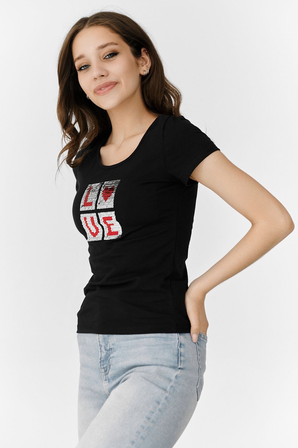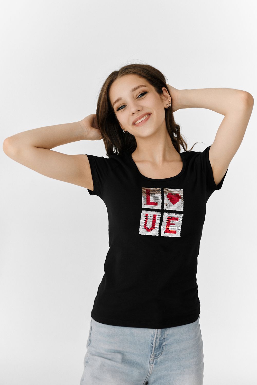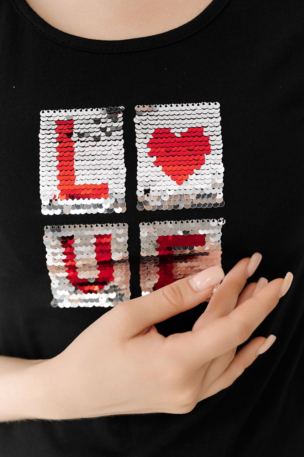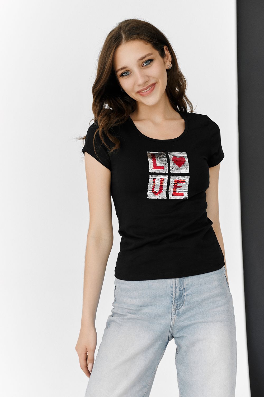 Футболка полуприлегающего силуэта, с округлой горловиной, длиной до середины бедра. Рукав втачной короткий. Горловина обработана бейкой из основного полотна. На полочке аппликация из пайеток