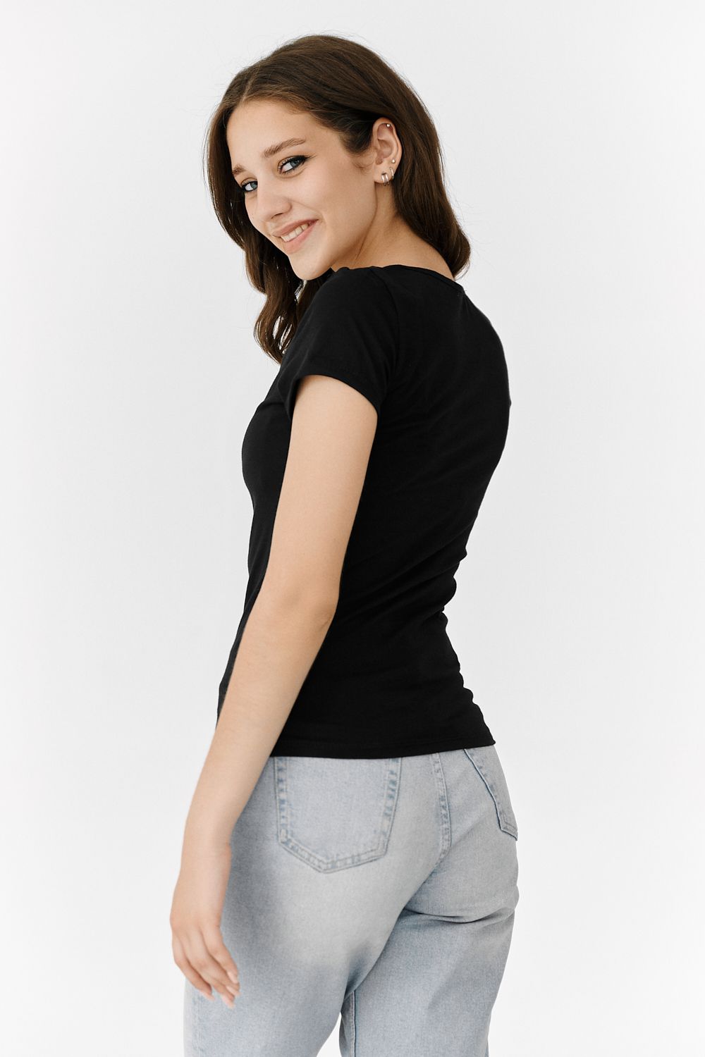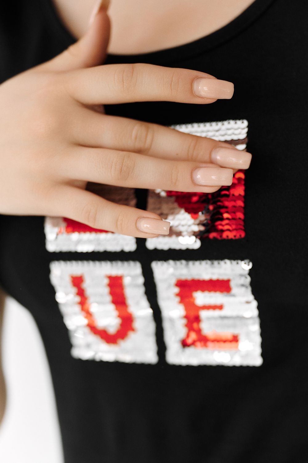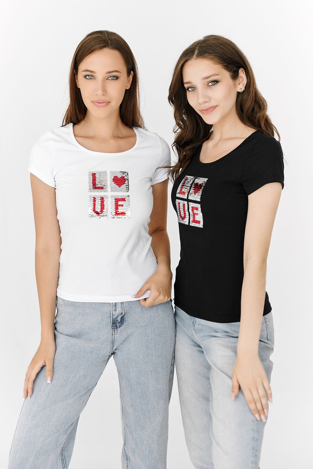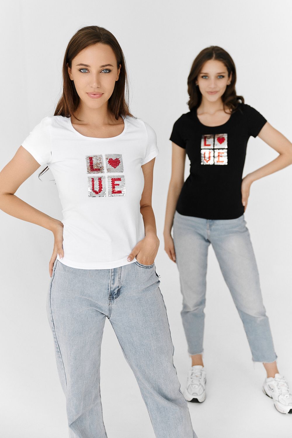 Футболка полуприлегающего силуэта, с округлой горловиной, длиной до середины бедра. Рукав втачной короткий. Горловина обработана бейкой из основного полотна. На полочке аппликация из пайеток