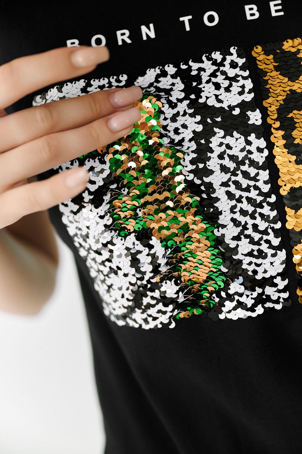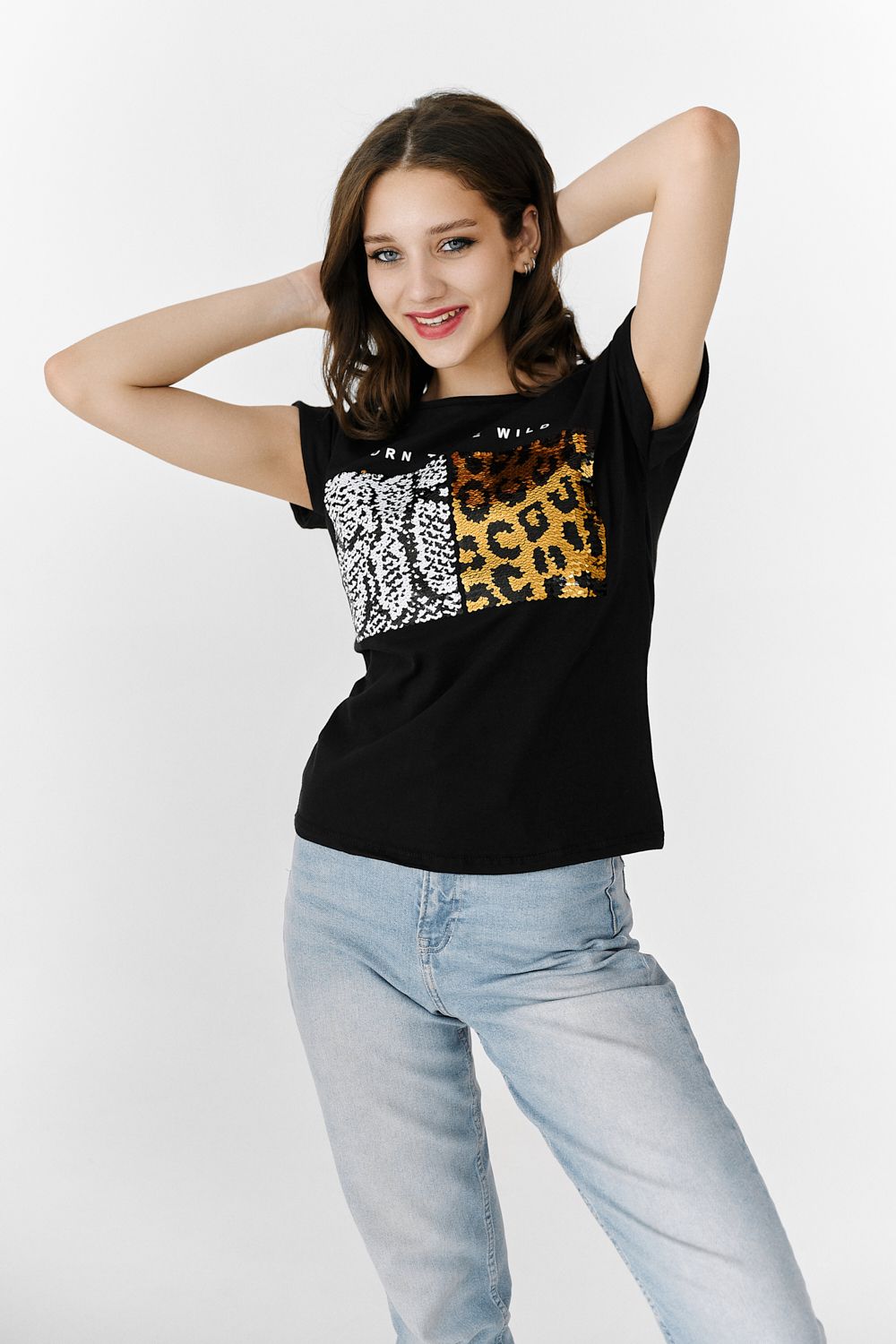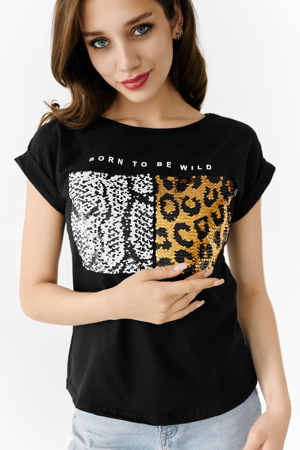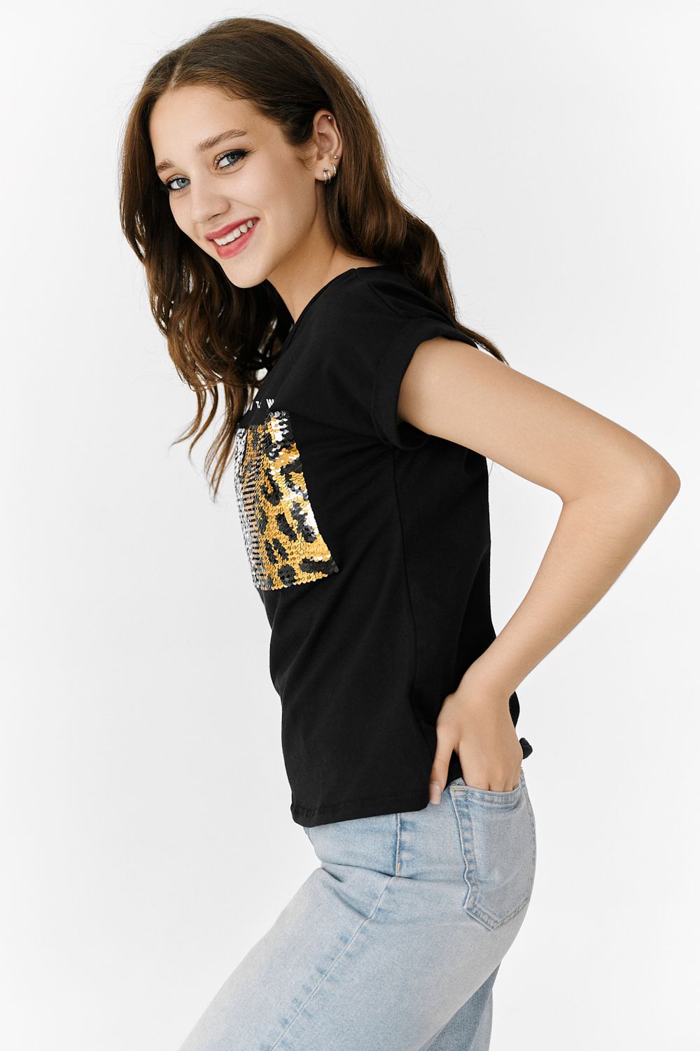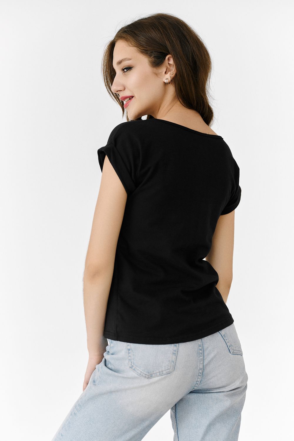 Футболка полуприлегающего силуэта, средней длины, с округлой горловиной. Рукав цельнокроеный, короткий, на манжете с отворотом.