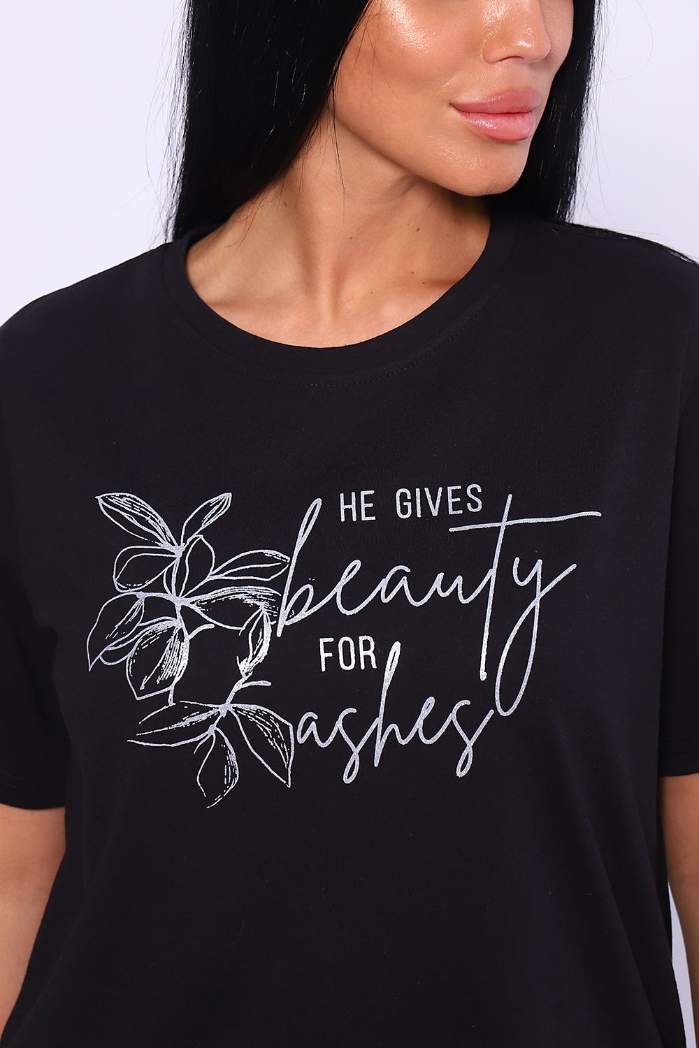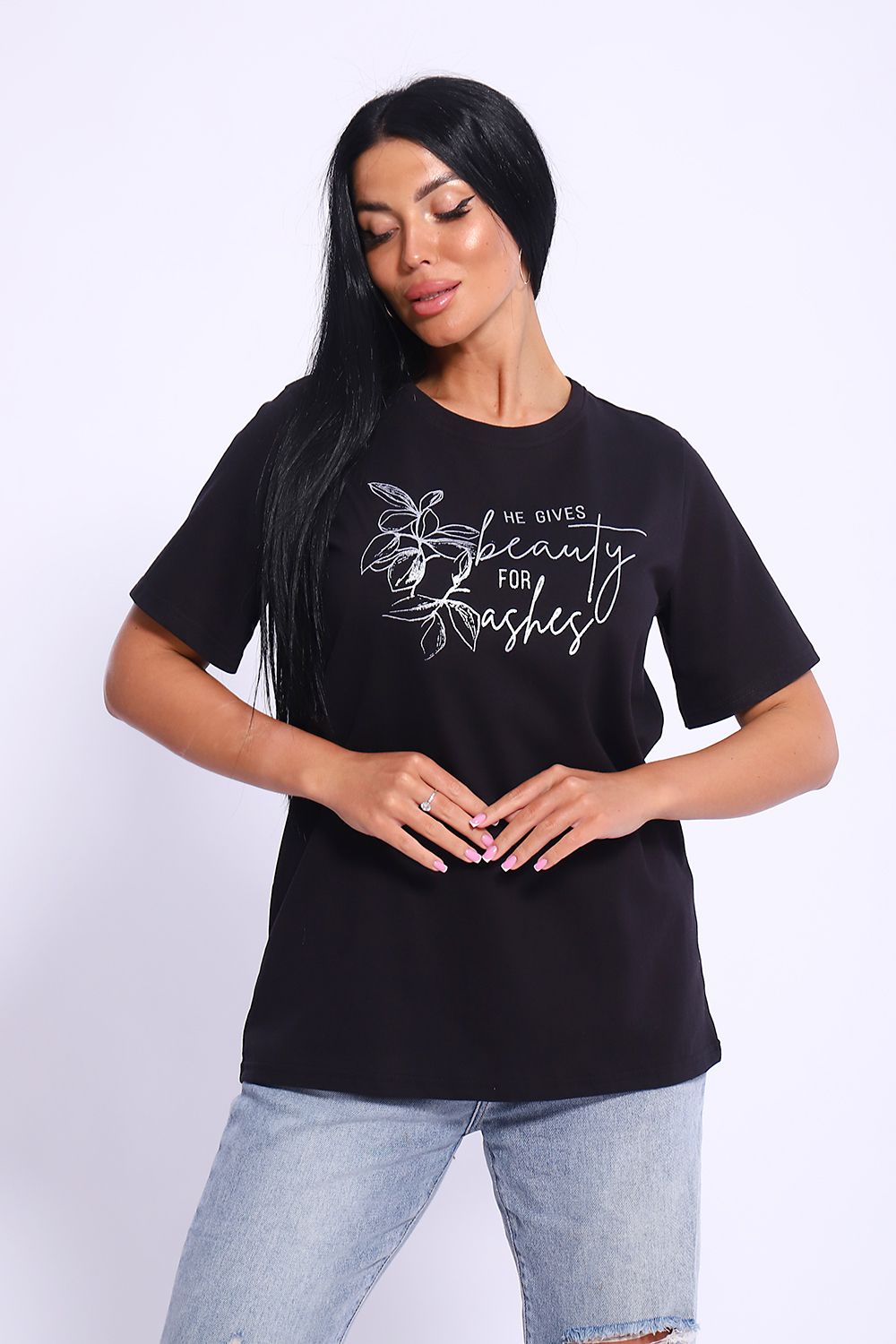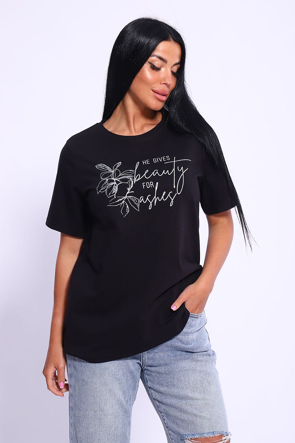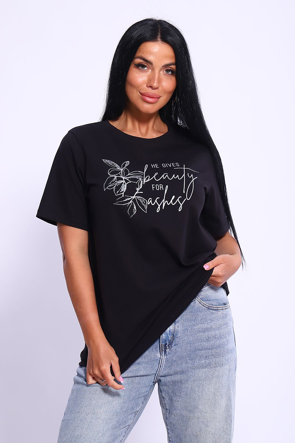 Футболка с оригинальным принтом изготовлена из мягкого 100% хлопка. Горловина обработана обтачкой с последующей отстрочкой. Рукава и низ в подгибку.