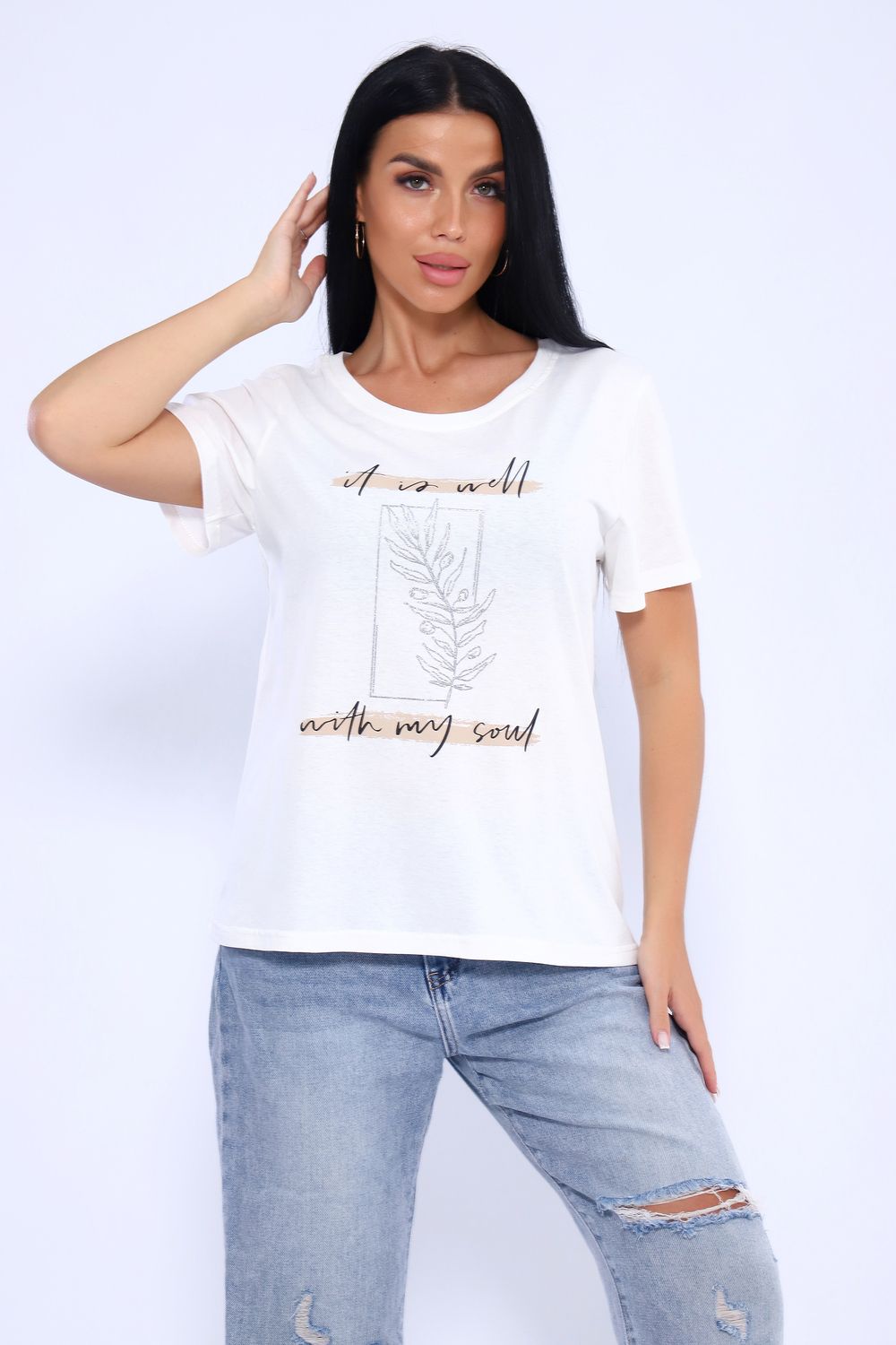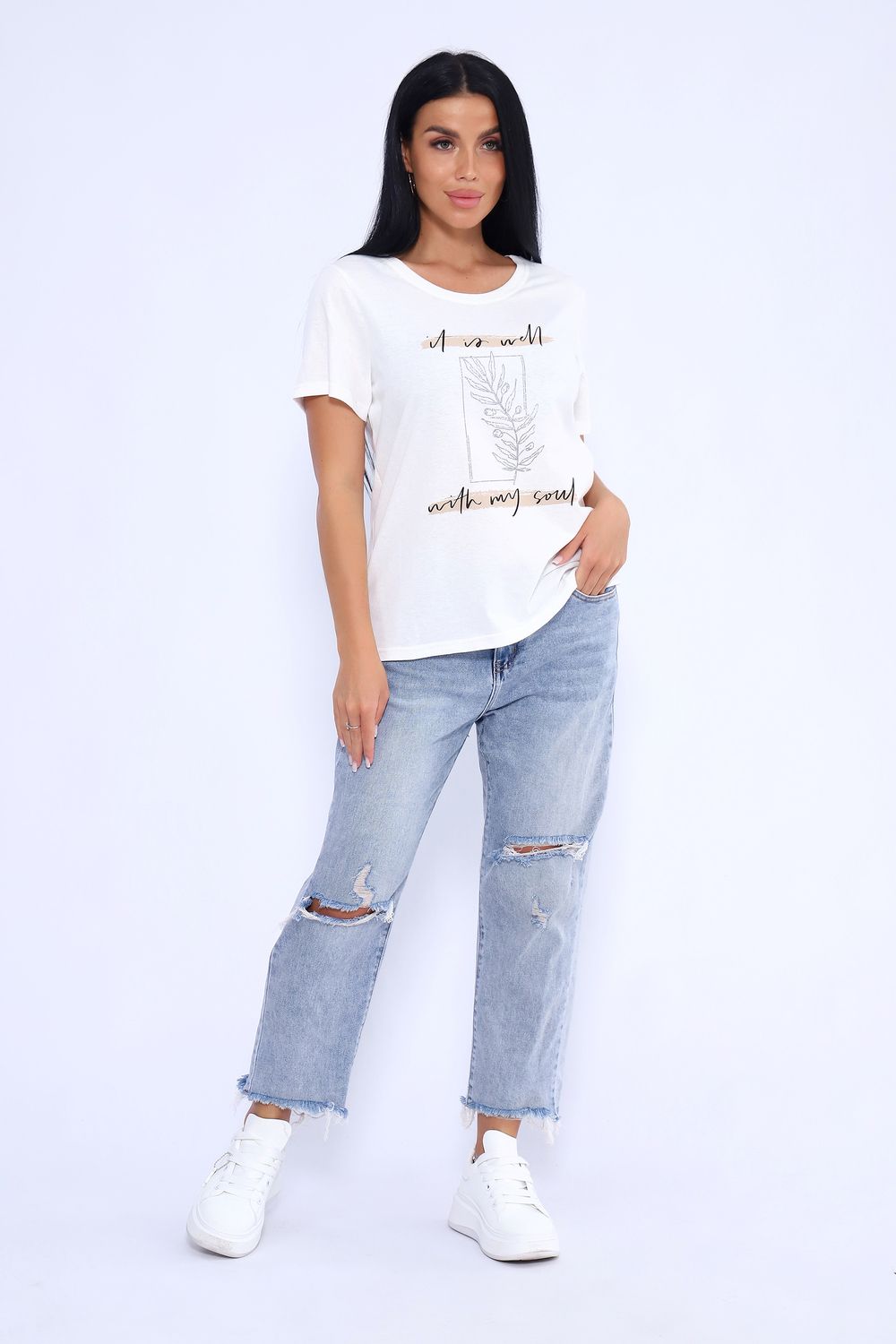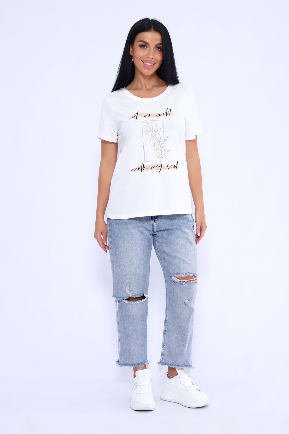 Прекрасный вариант для летнего отдыха и комфортного "лука" на каждый день! Нежные, пастельные расцветки и принт с "французским блеском" придают стиль и шарм. Футболка изготовлена из мягкого 100% хлопка. Фасон приталенный. Горловина обработана обтачкой с последующей отстрочкой. Рукава и низ изделия в подгибку.
