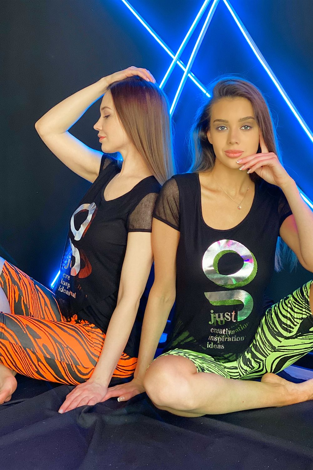 Футболка полуприлегающего силуэта, с округлой горловиной, длиной до середины бедра, с фигурным низом. Рукав втачной короткий, из сетки. Полочка выполнена из двух полотен, наложенных одно на другое. Верхнее полотно из сетки с принтом. Горловина обработана бейкой из основного полотна.