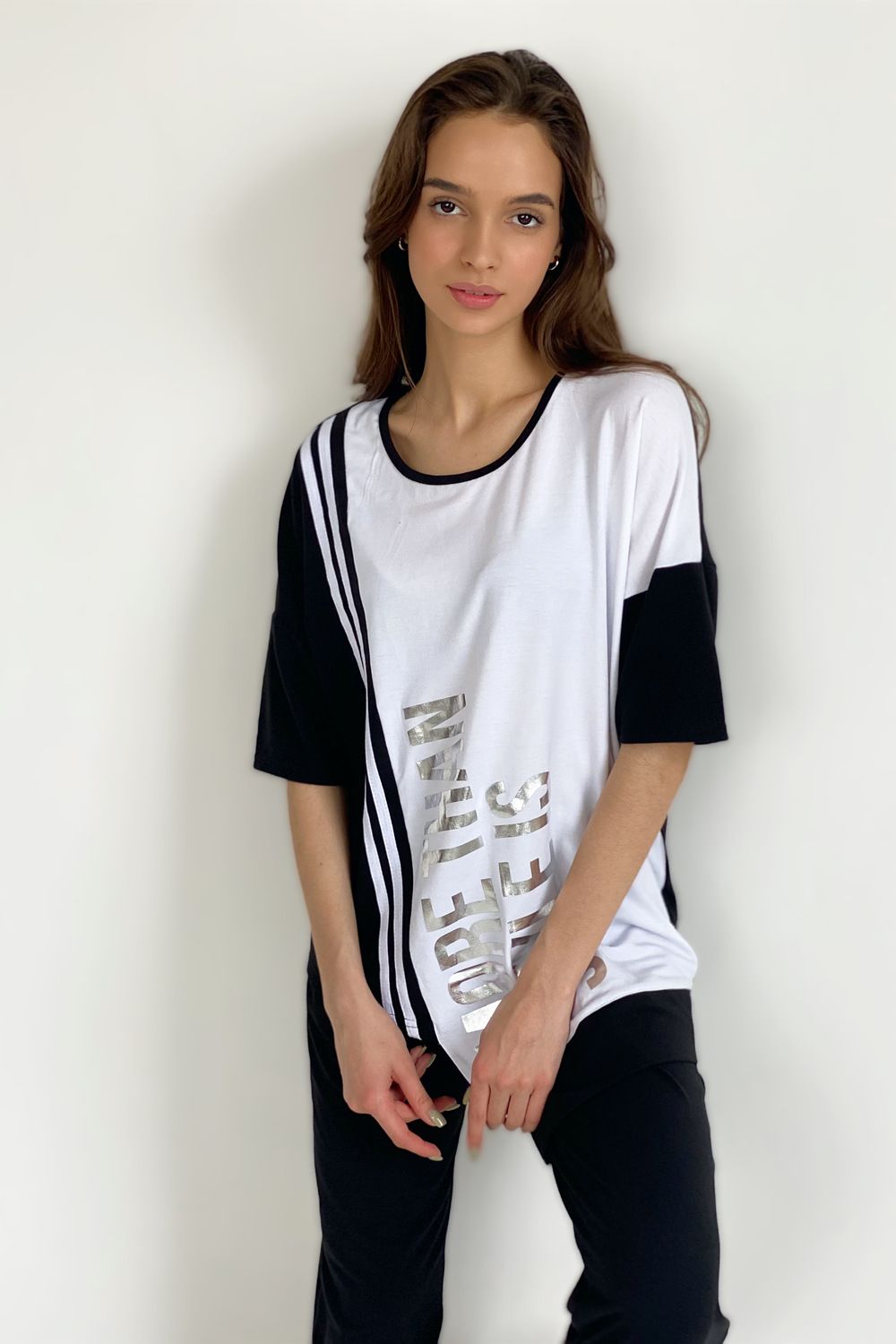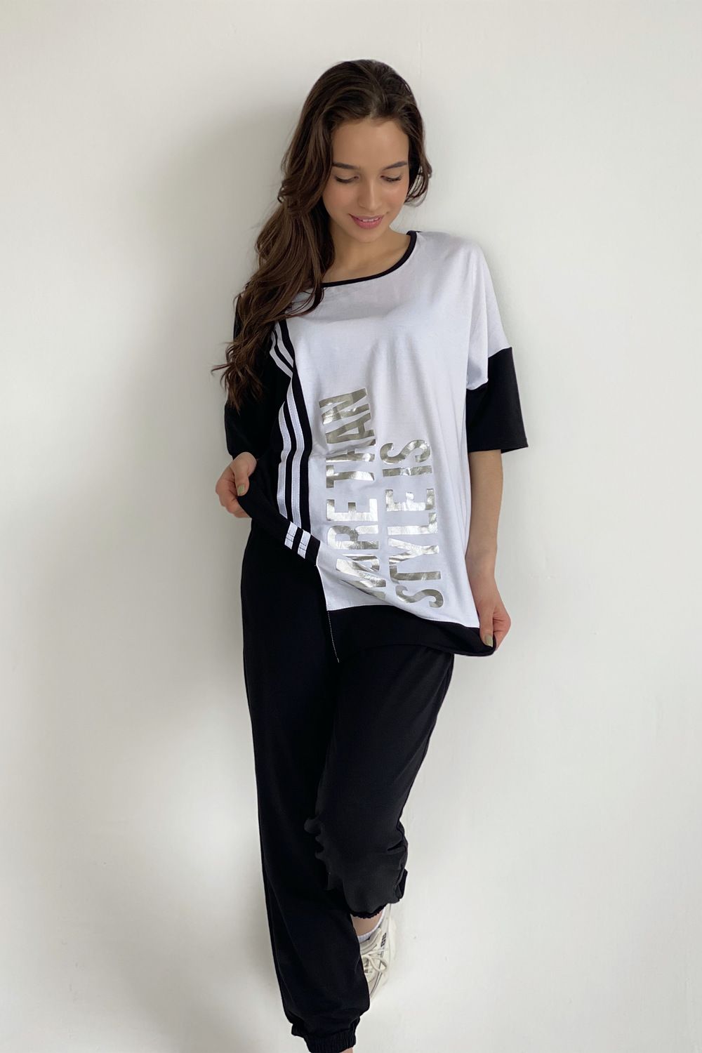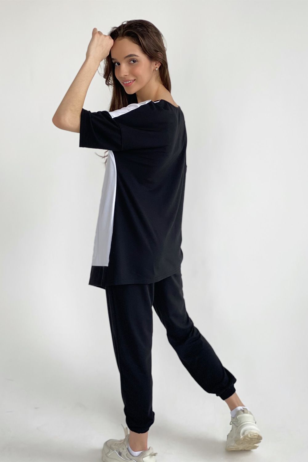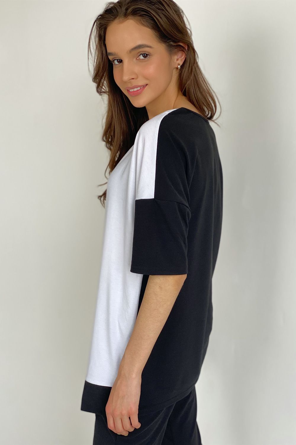 Футболка прямая, свободная, с округлой горловиной, с асимметричным низом. Рукав короткий. Центральная часть полочки выполнена из отделочного полотна. Вдоль шва соединения частей полочки расположены лампасы из отделочного полотна. Горловина обработана бейкой из основного полотна.