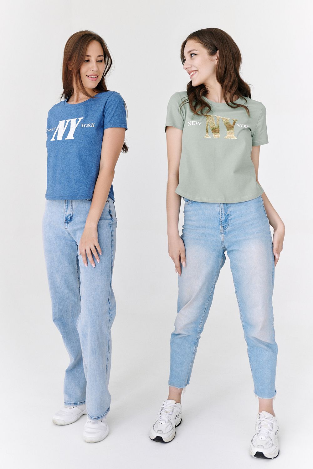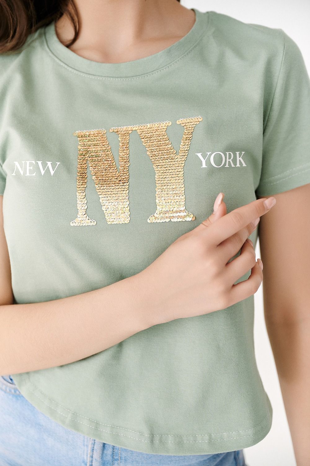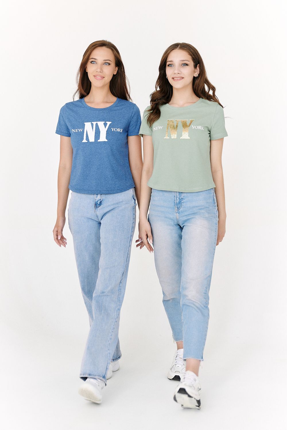Футболка прямого силуэта, с фигурной линией низа, с округлой горловиной. Рукав втачной, короткий. Горловина обработана обтачкой из основного полотна. На полочке эффектно сочетаются аппликация из пайеток в виде букв NY и печать New York