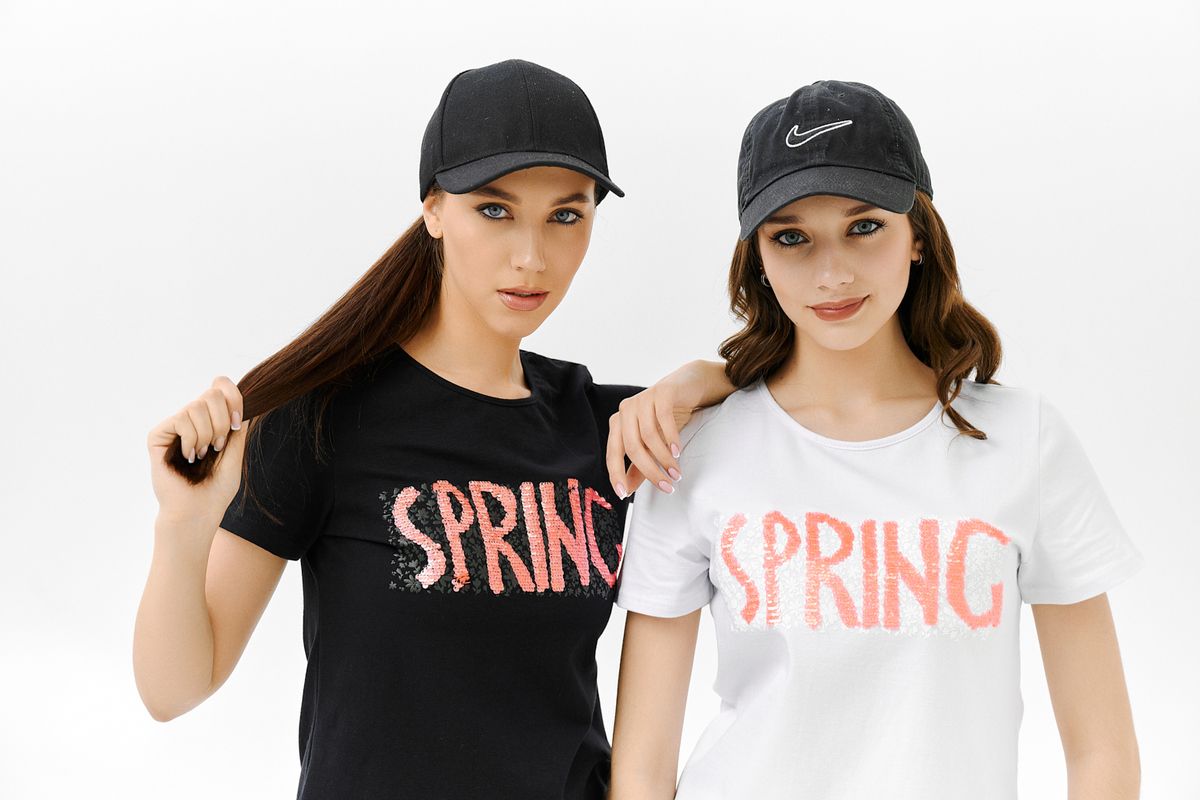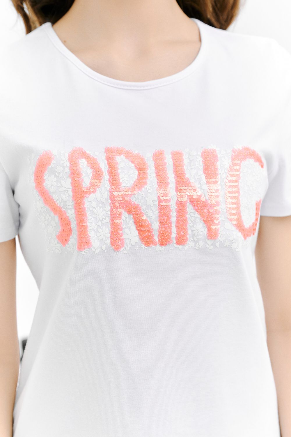Футболка прямого силуэта, с округлой горловиной, длиной до середины бедра. Рукав втачной, короткий. Горловина обработана бейкой из основного полотна. На полочке эффектная переливающаяся аппликация с пайетками