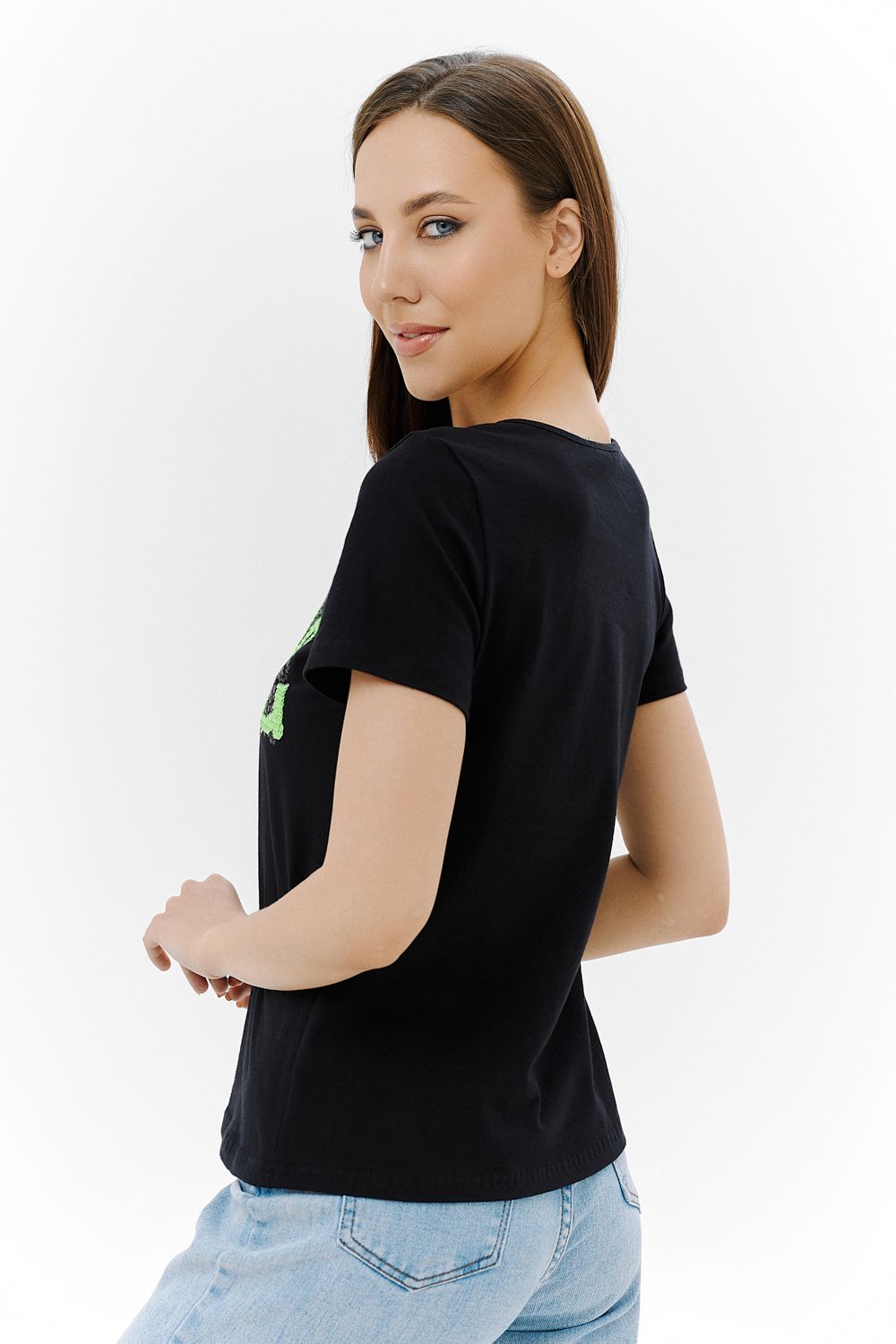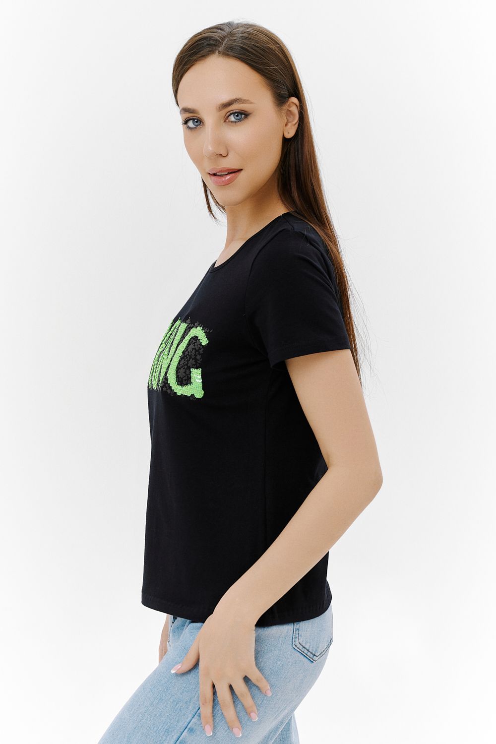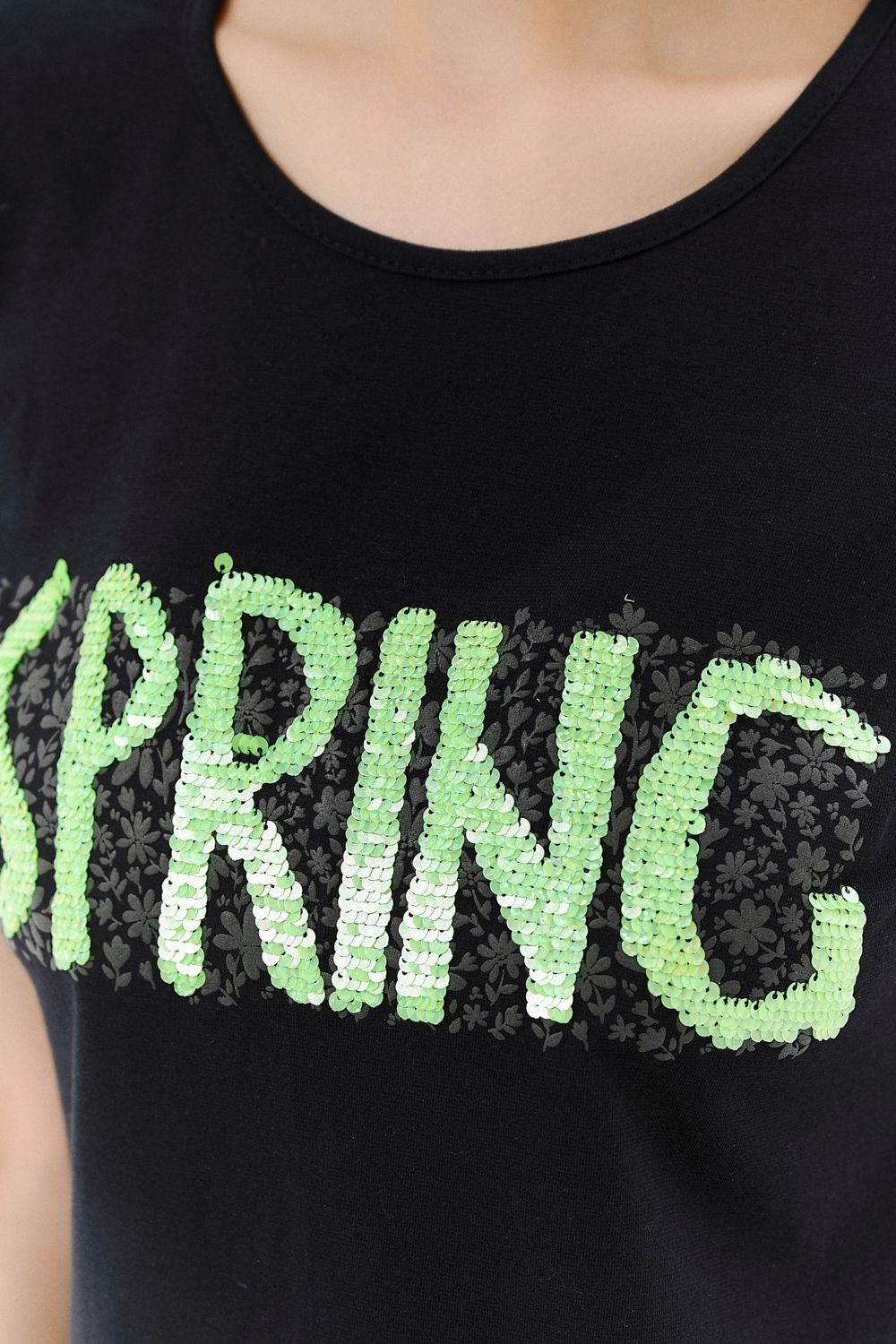 Футболка прямого силуэта, с округлой горловиной, длиной до середины бедра. Рукав втачной, короткий. Горловина обработана бейкой из основного полотна. На полочке эффектная переливающаяся аппликация с пайетками