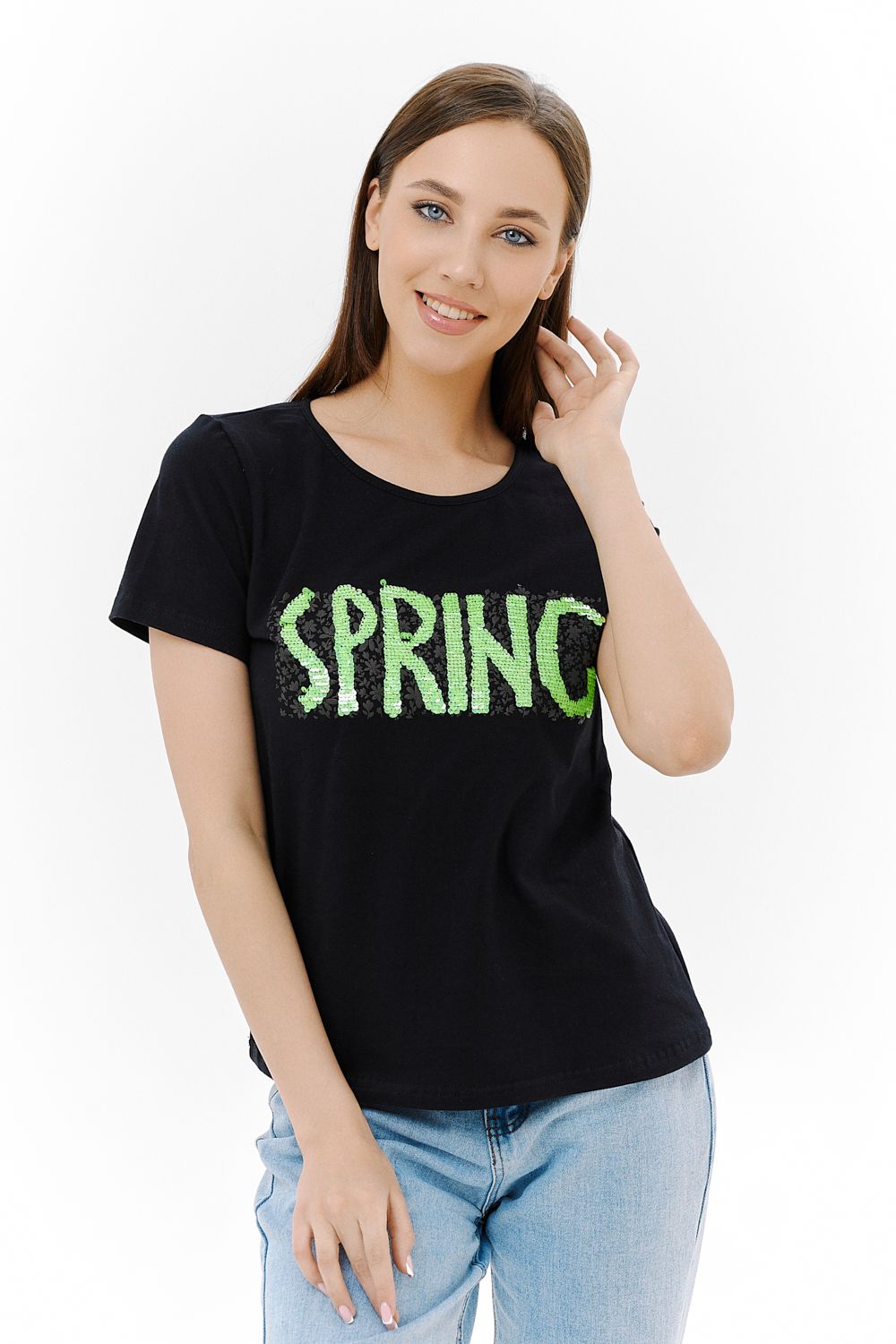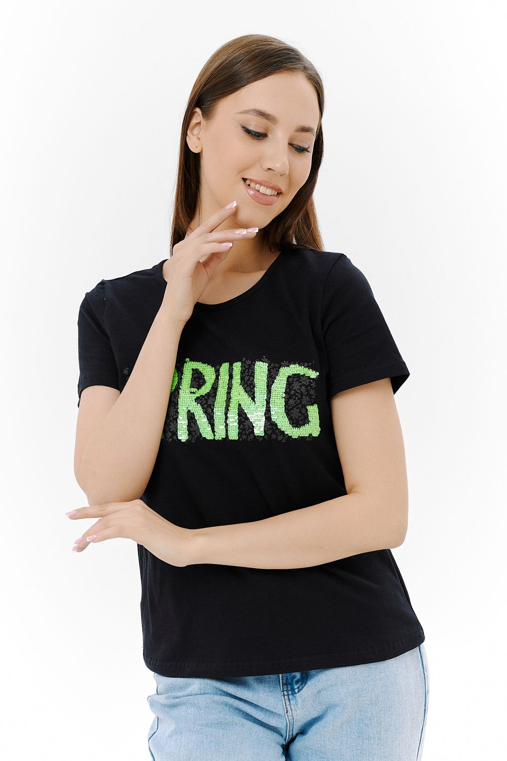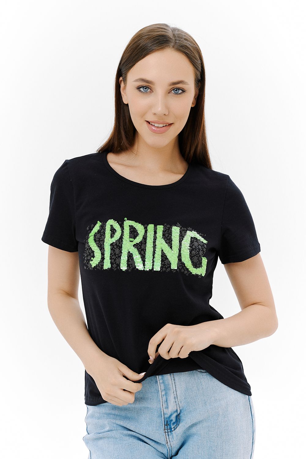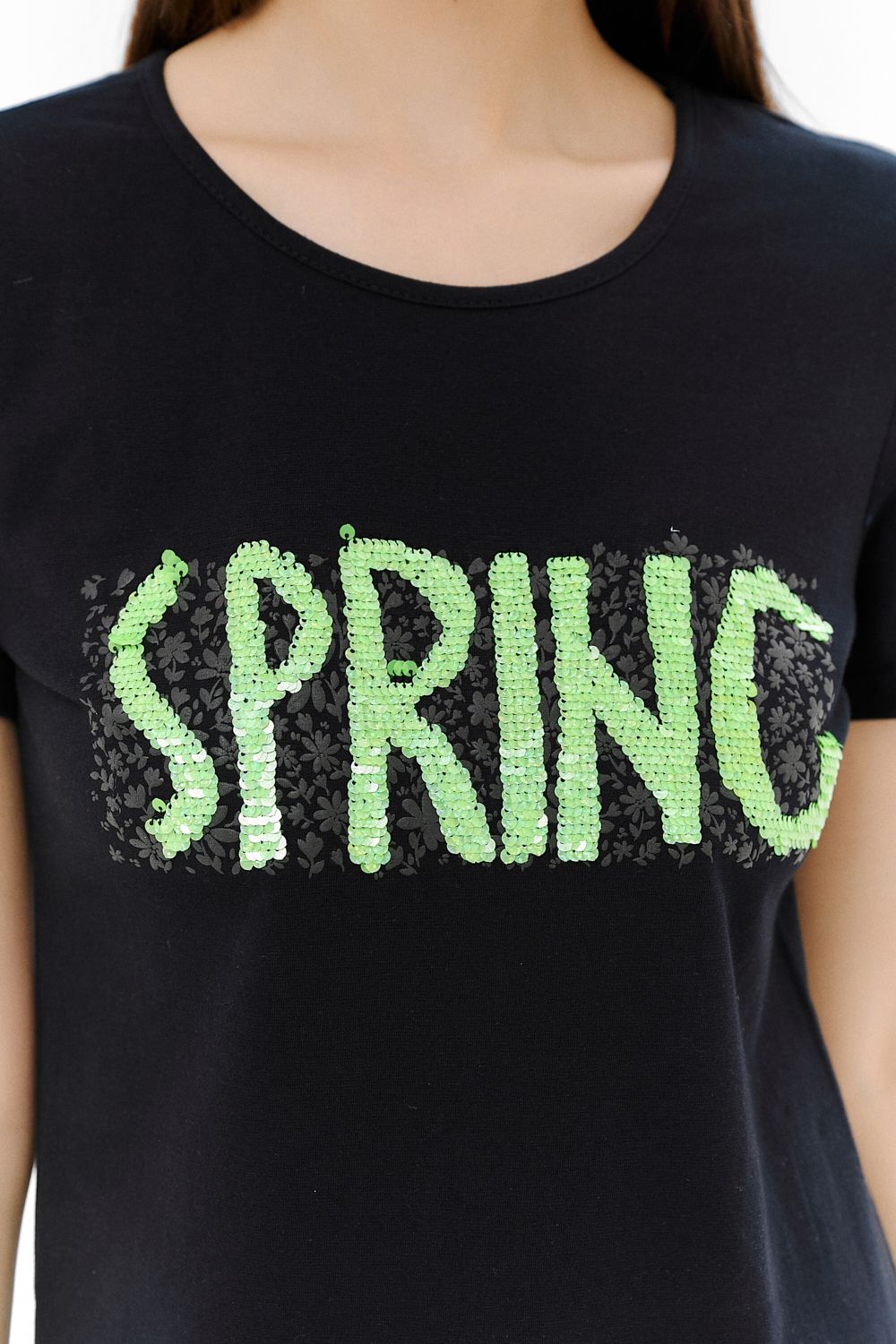 Футболка прямого силуэта, с округлой горловиной, длиной до середины бедра. Рукав втачной, короткий. Горловина обработана бейкой из основного полотна. На полочке эффектная переливающаяся аппликация с пайетками