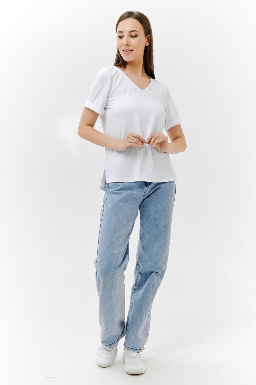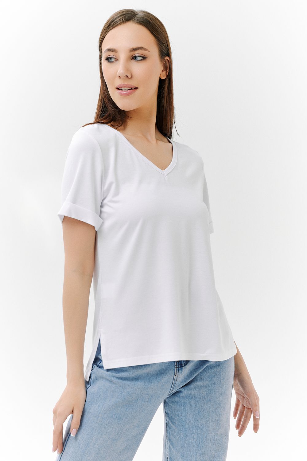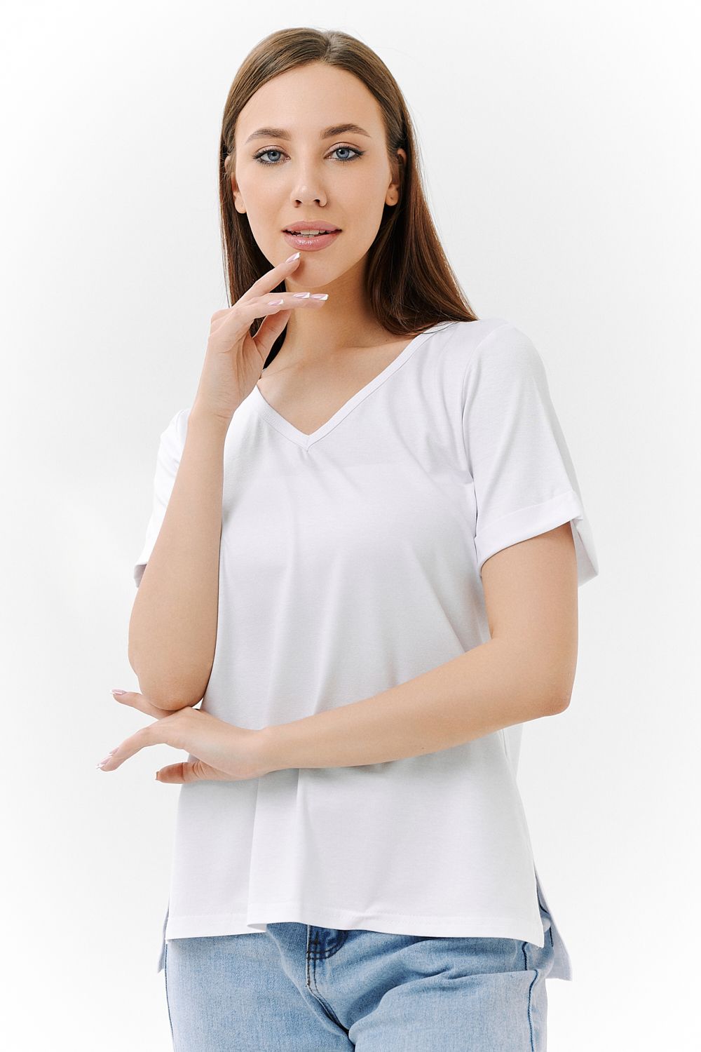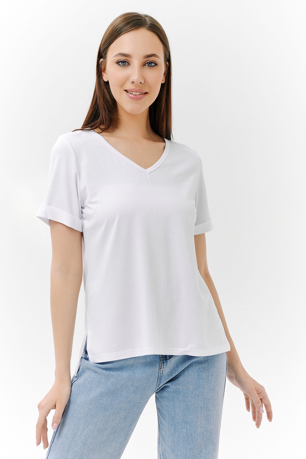 Футболка прямого силуэта, с V-образной горловиной, с разрезами в нижней части боковых швов. Спинка с кокеткой, удлиненная. Горловина обработана бейкой из основного полотна.