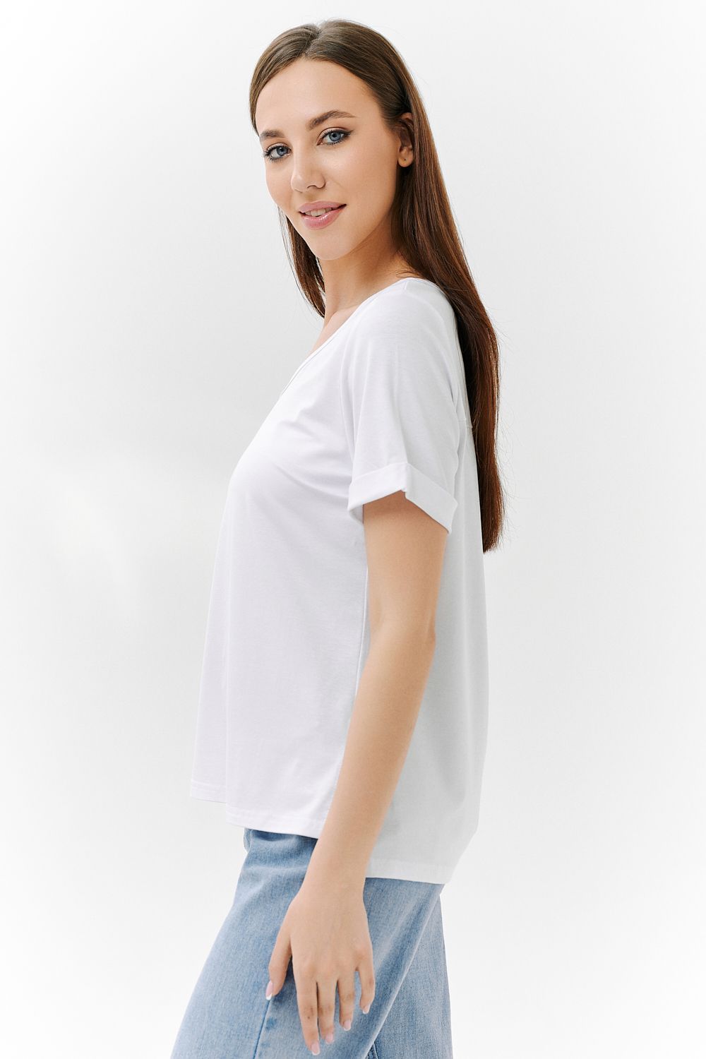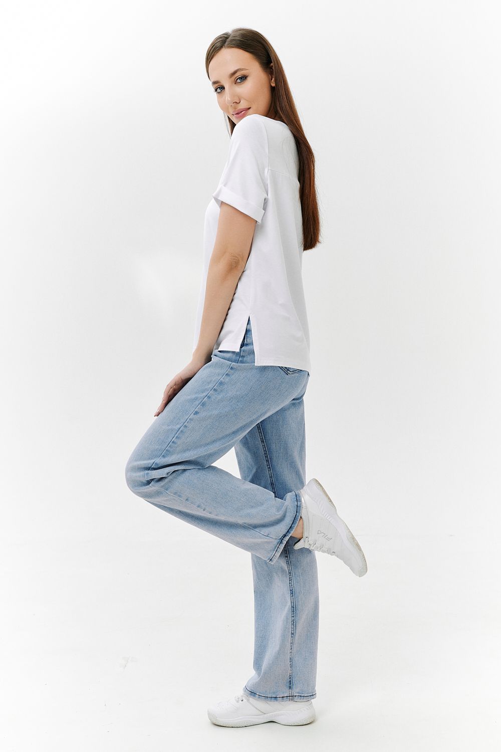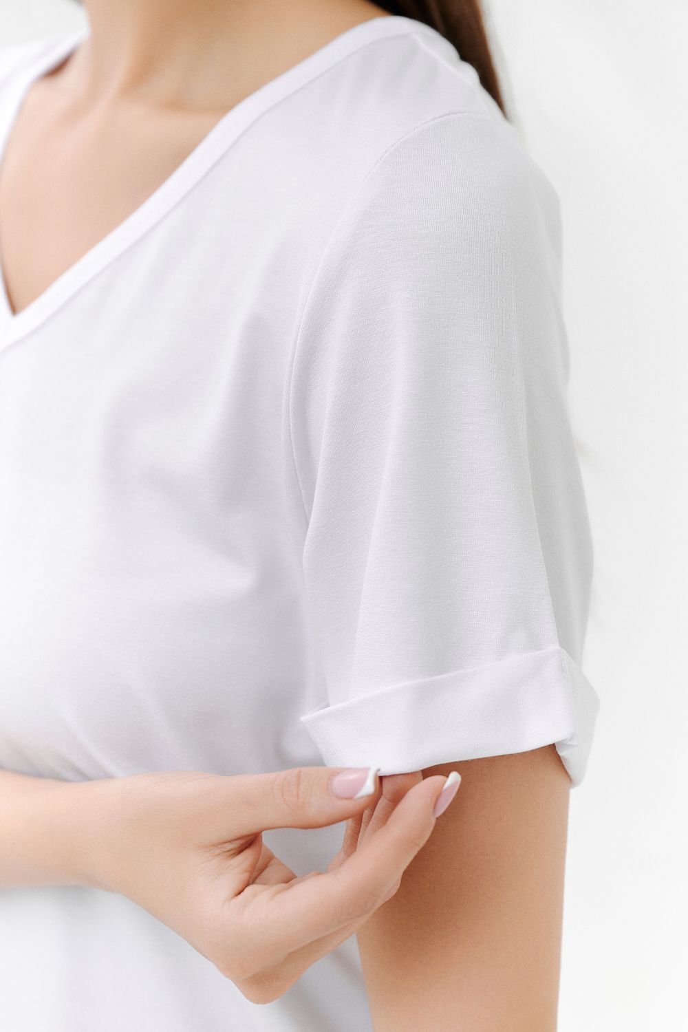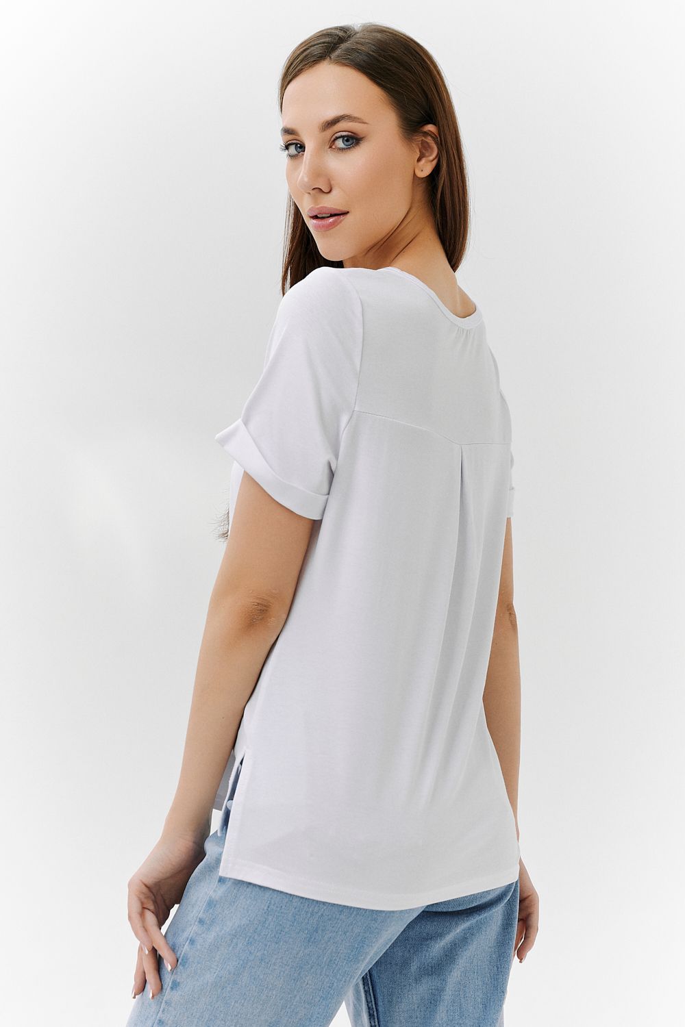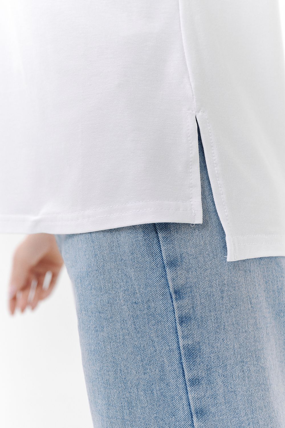 Футболка прямого силуэта, с V-образной горловиной, с разрезами в нижней части боковых швов. Спинка с кокеткой, удлиненная. Горловина обработана бейкой из основного полотна.