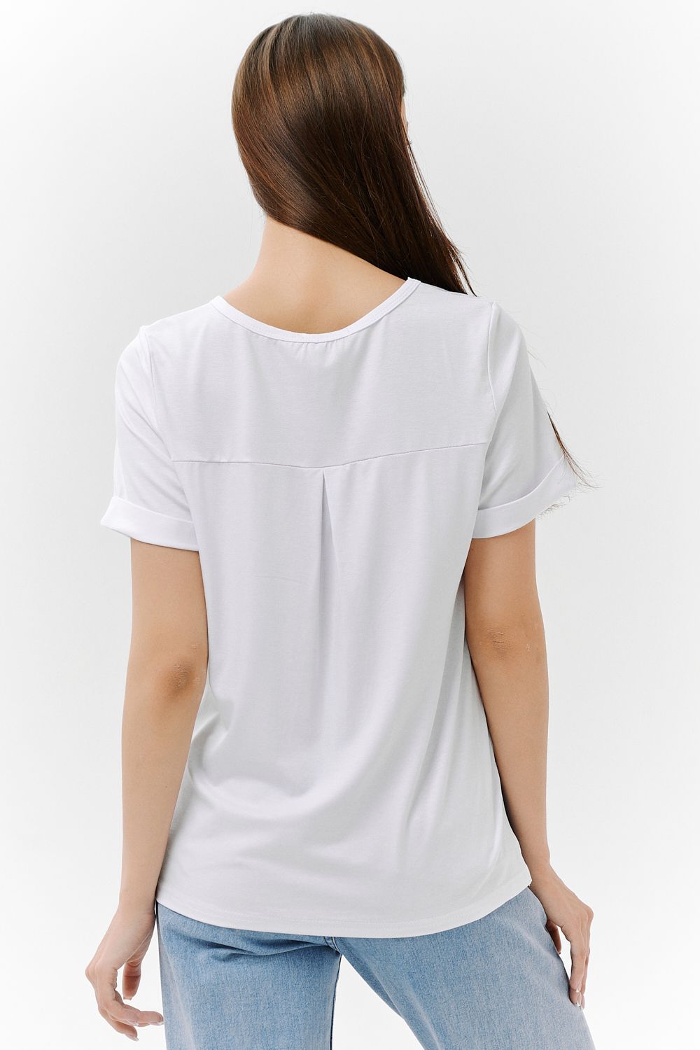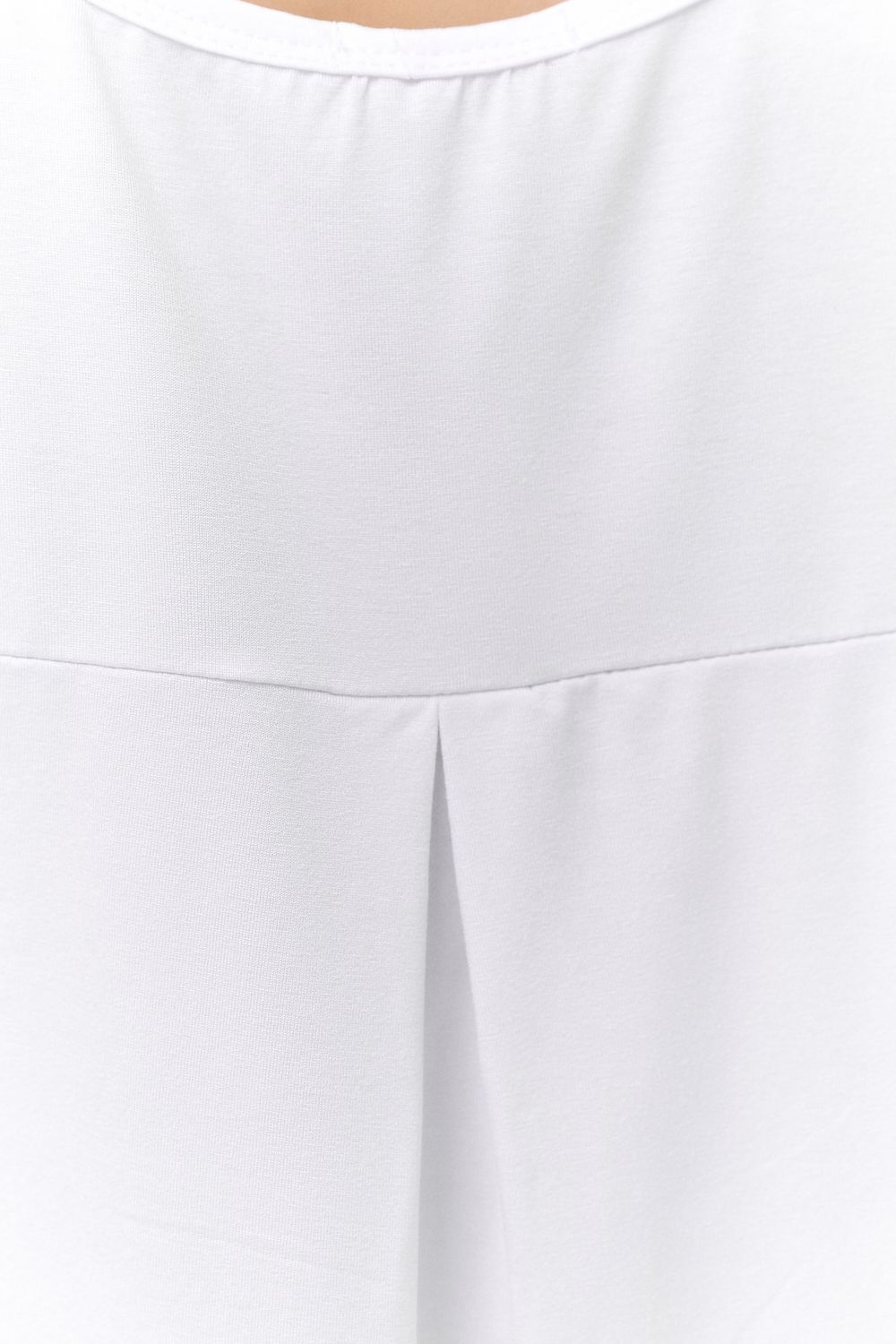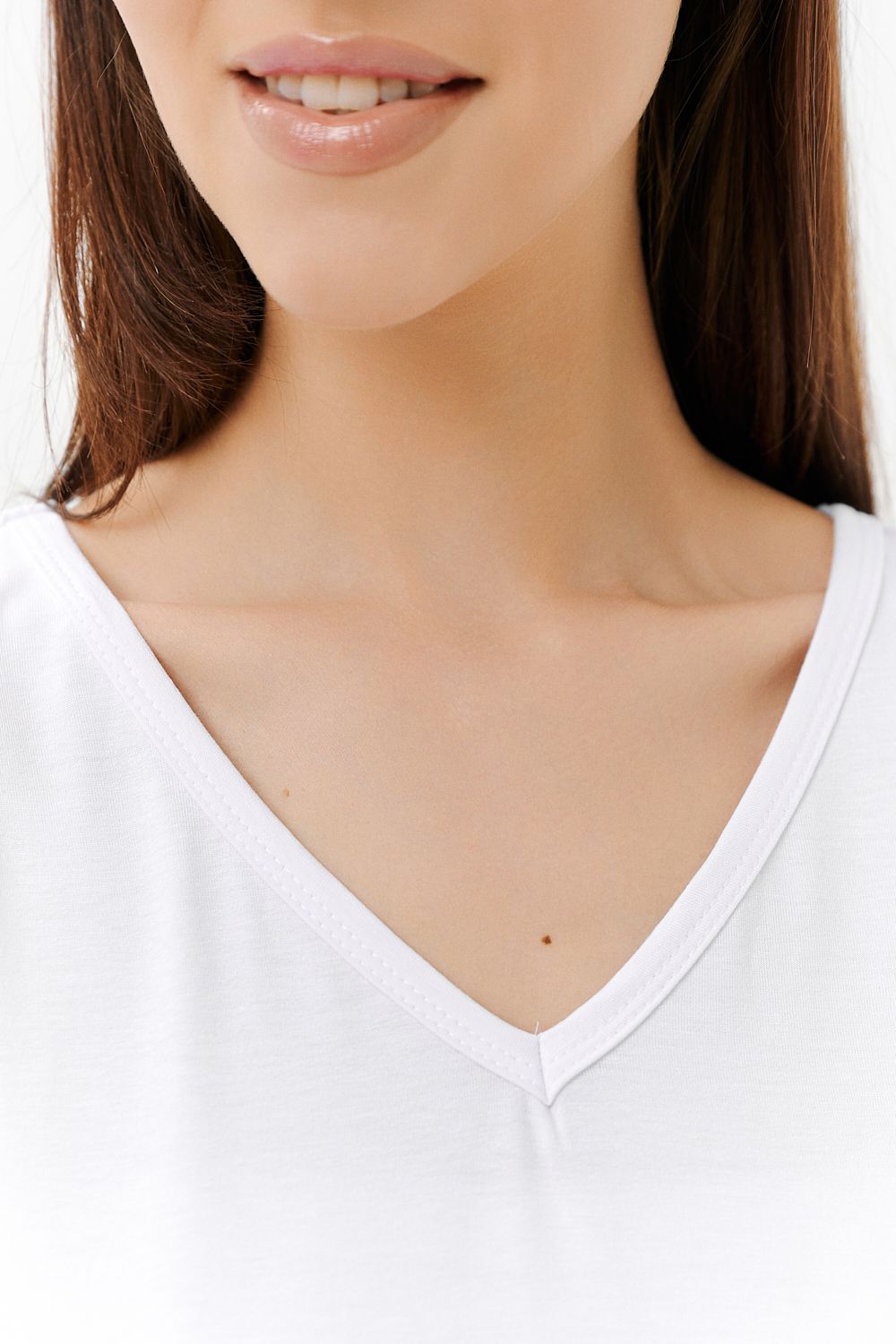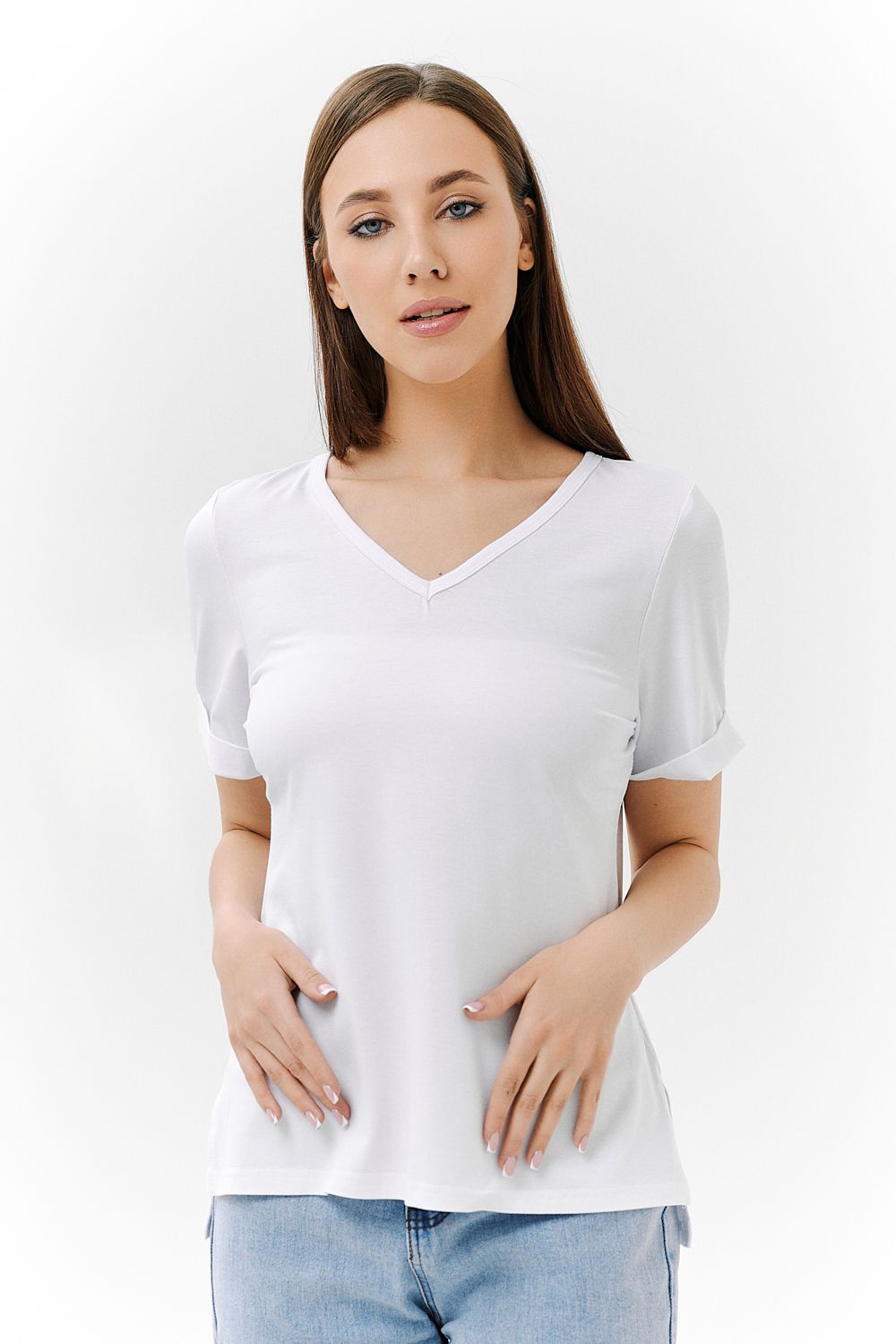 Футболка прямого силуэта, с V-образной горловиной, с разрезами в нижней части боковых швов. Спинка с кокеткой, удлиненная. Горловина обработана бейкой из основного полотна.
