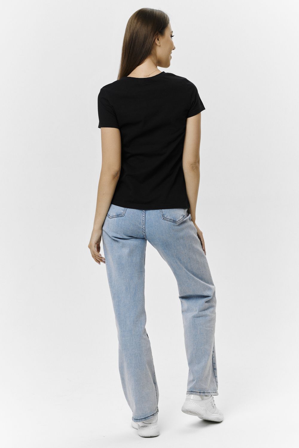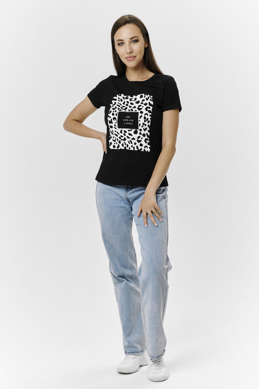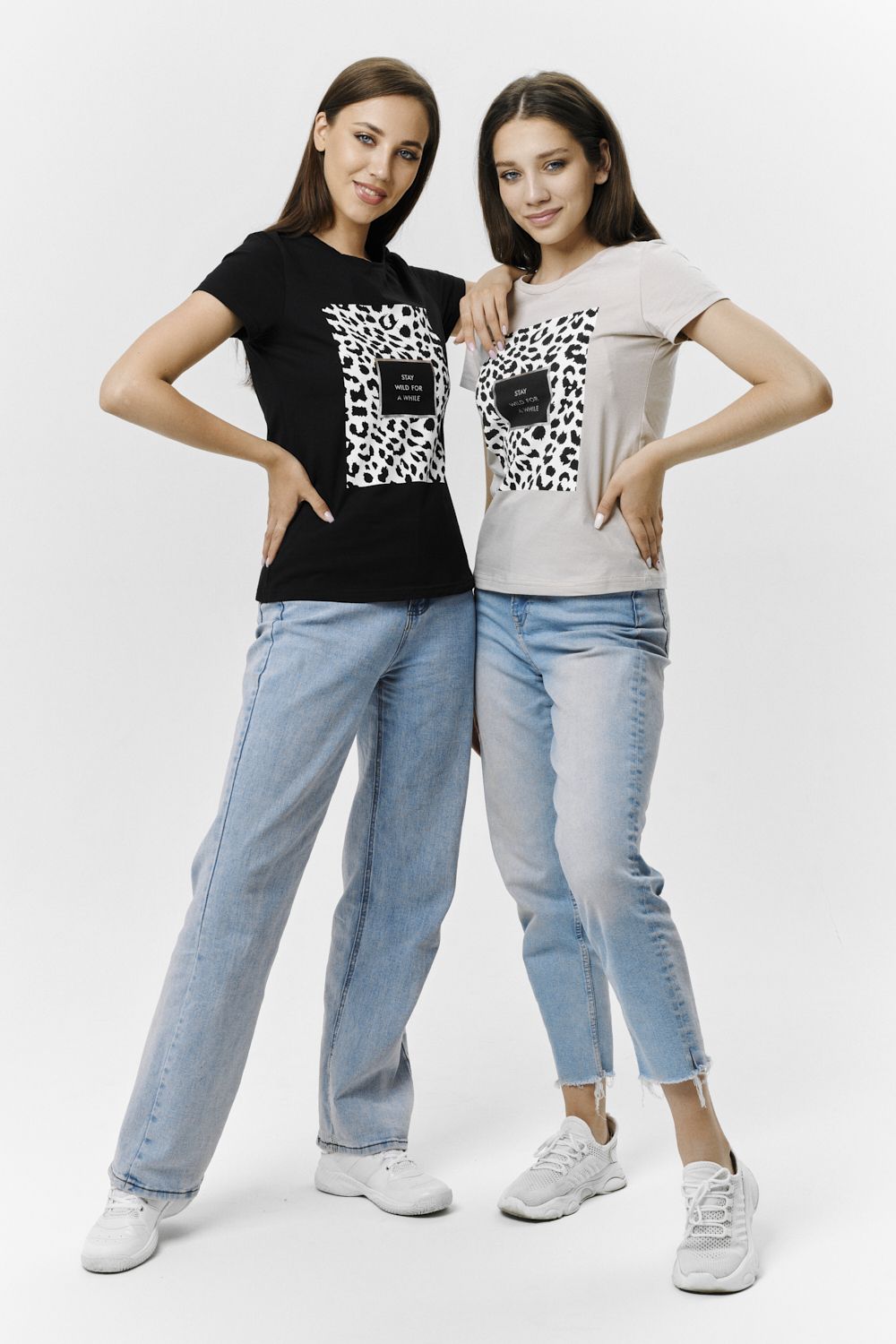 Футболка прямого силуэта, с округлой горловиной, длиной до середины бедра. Рукав втачной, короткий. Горловина обработана обтачкой из основного полотна.