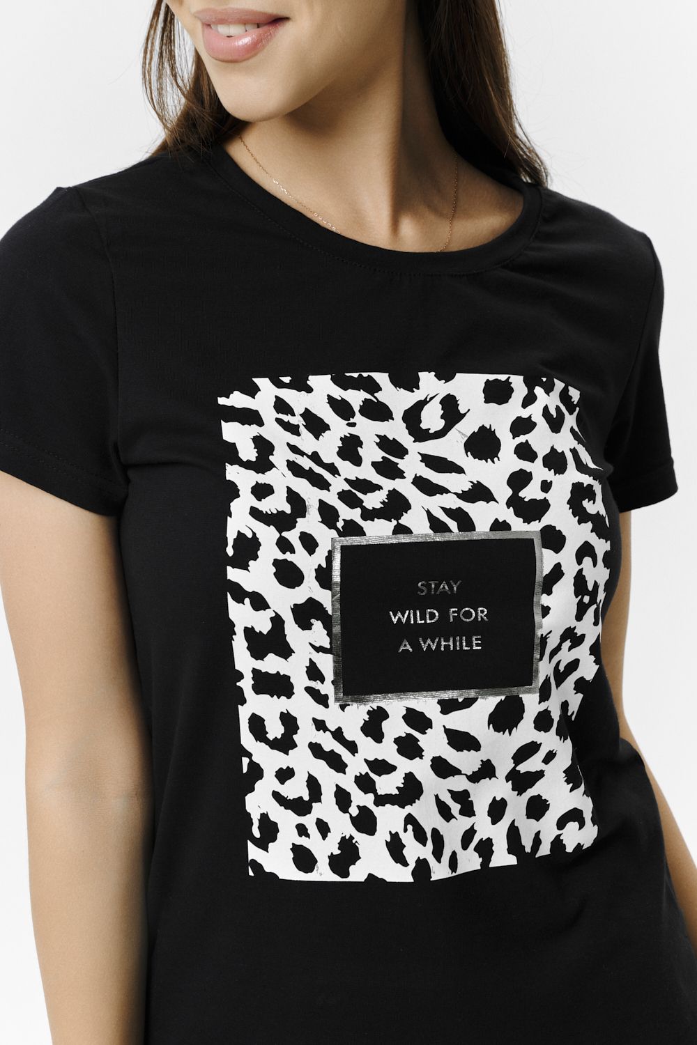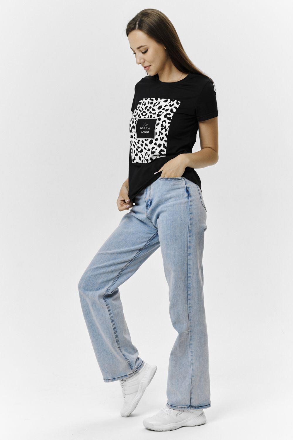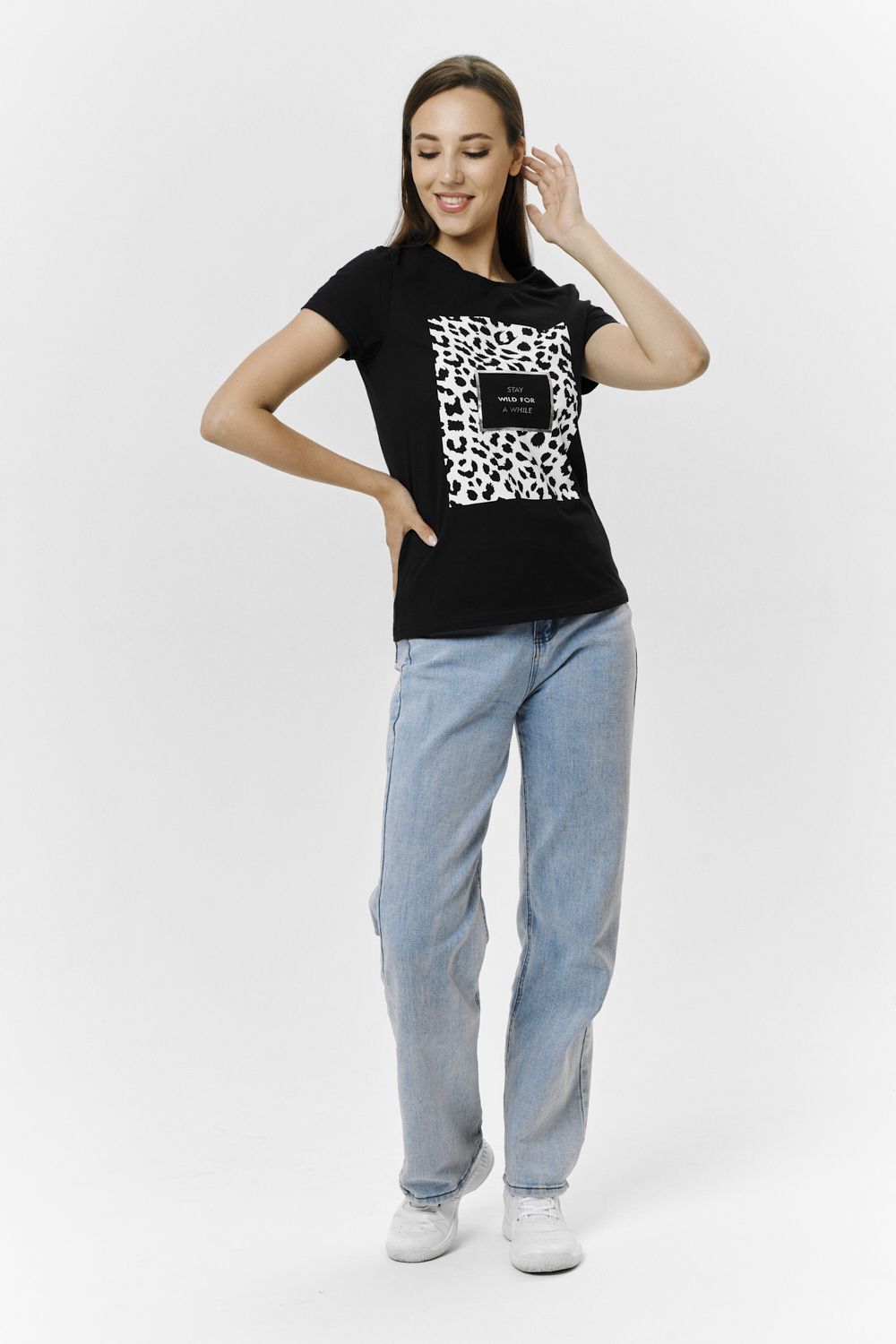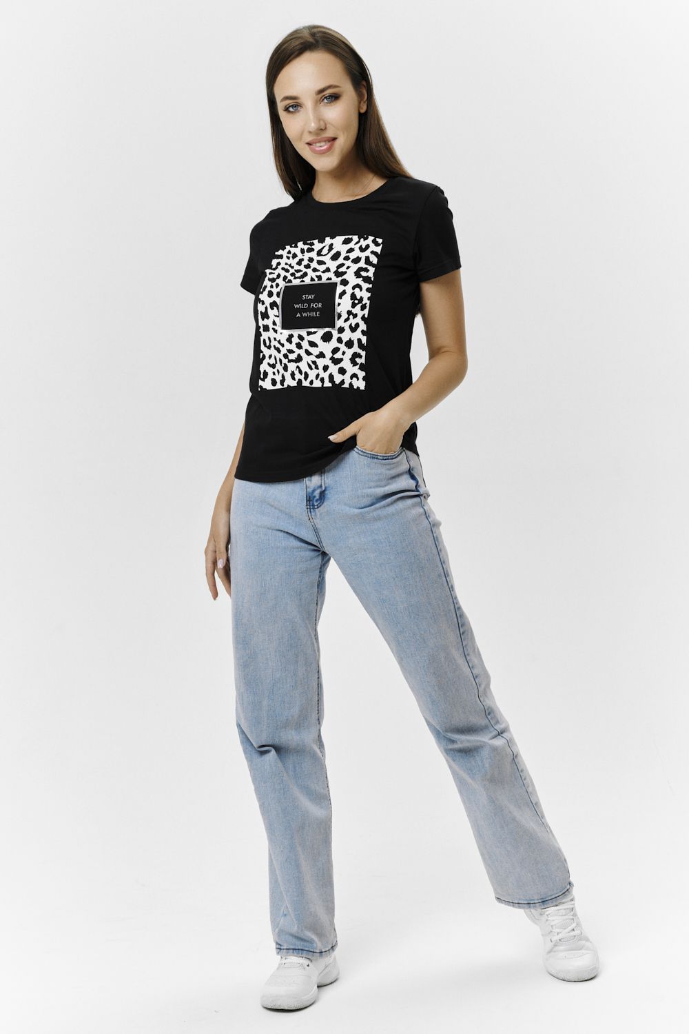 Футболка прямого силуэта, с округлой горловиной, длиной до середины бедра. Рукав втачной, короткий. Горловина обработана обтачкой из основного полотна.