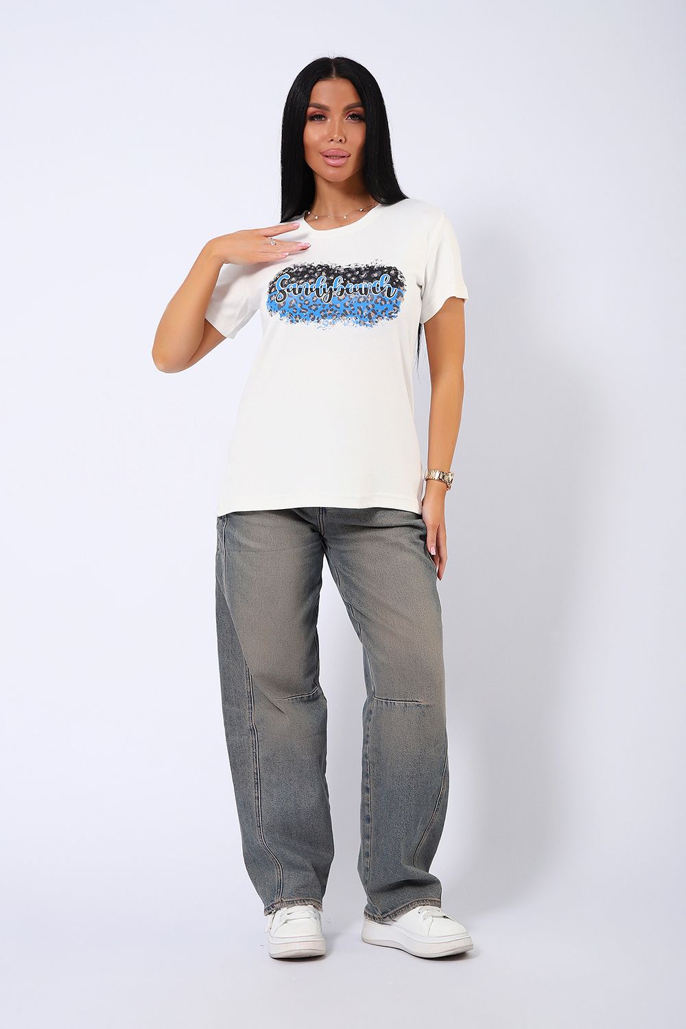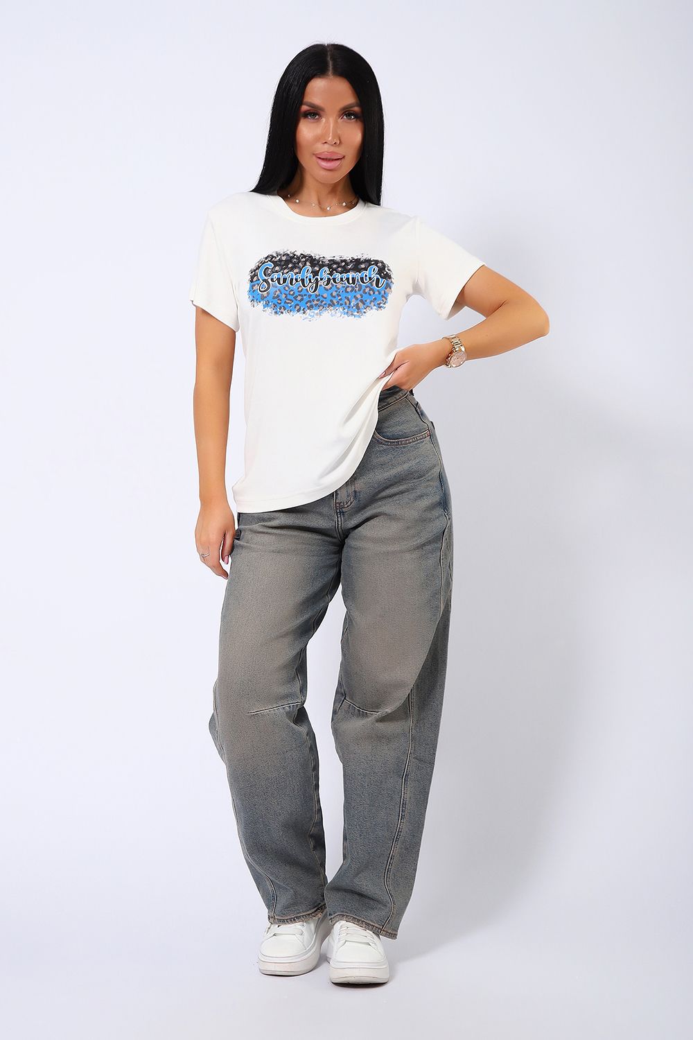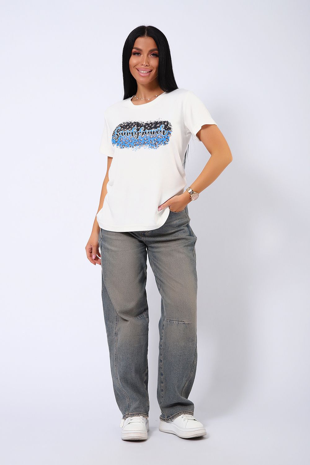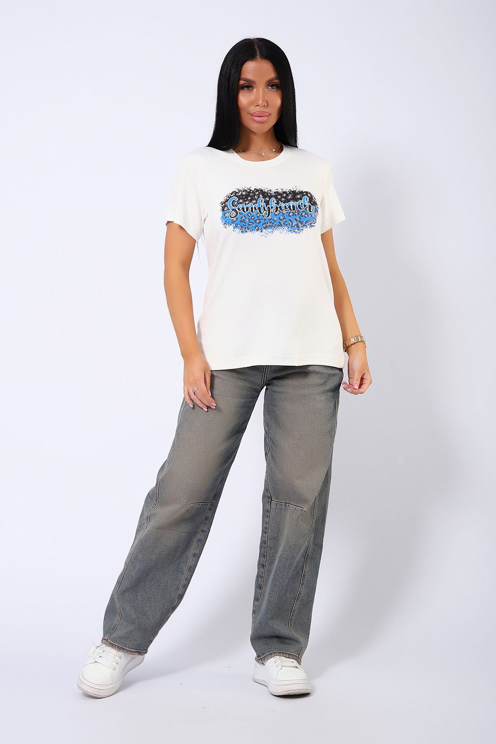Классическая белая футболка с неброским принтом на полочке - незаменимая вещь летнего гардероба! Прекрасно сочетается с любым видом одежды, освежит и выгодно подчеркнет загар1 Благодаря большому содержанию хлопка в ткани футболка прекрасно пропускает воздух, что так актуально в жаркие летние дни!