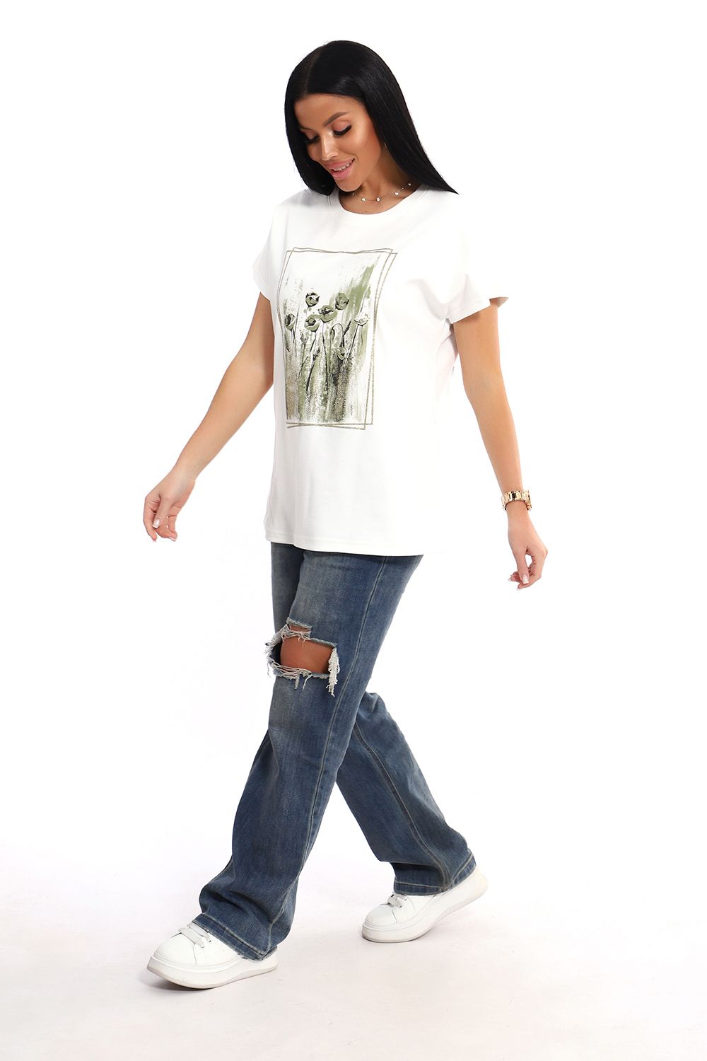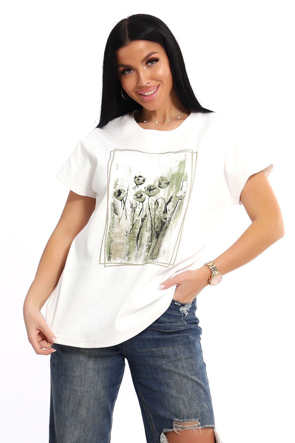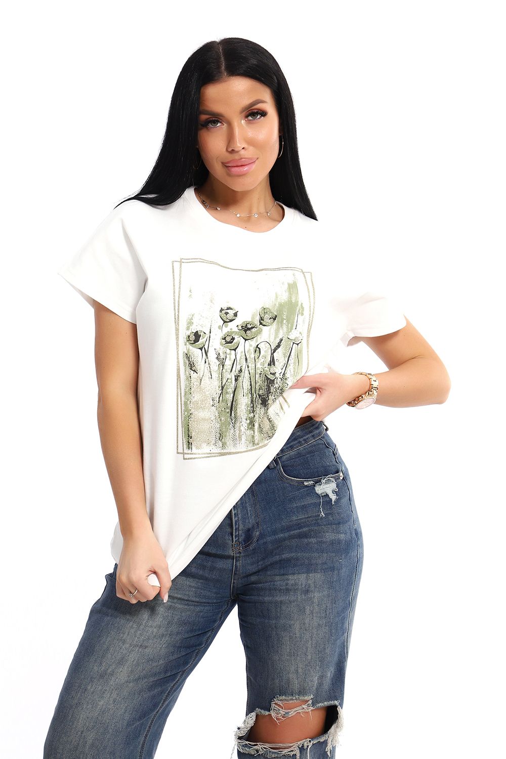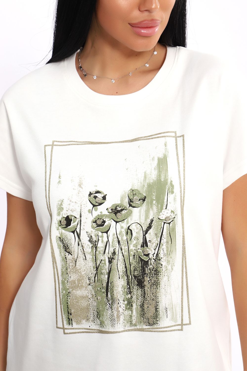 Футболка классического фасона, прямого кроя, с коротким рукавом и округлым вырезом. Полочка декорирована цветочным принтом в пастельных тонах. Универсальная и нарядная модель футболки отлично подойдет для любого образа и станет необходимой вещью в вашем гардеробе наравне с повседневными футболками.