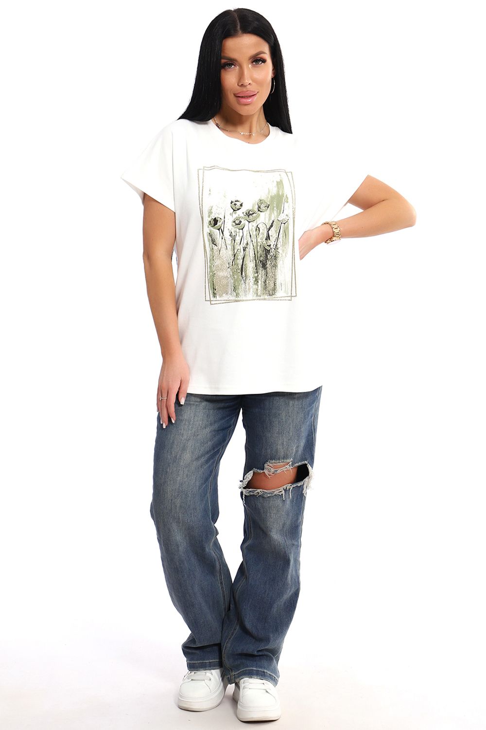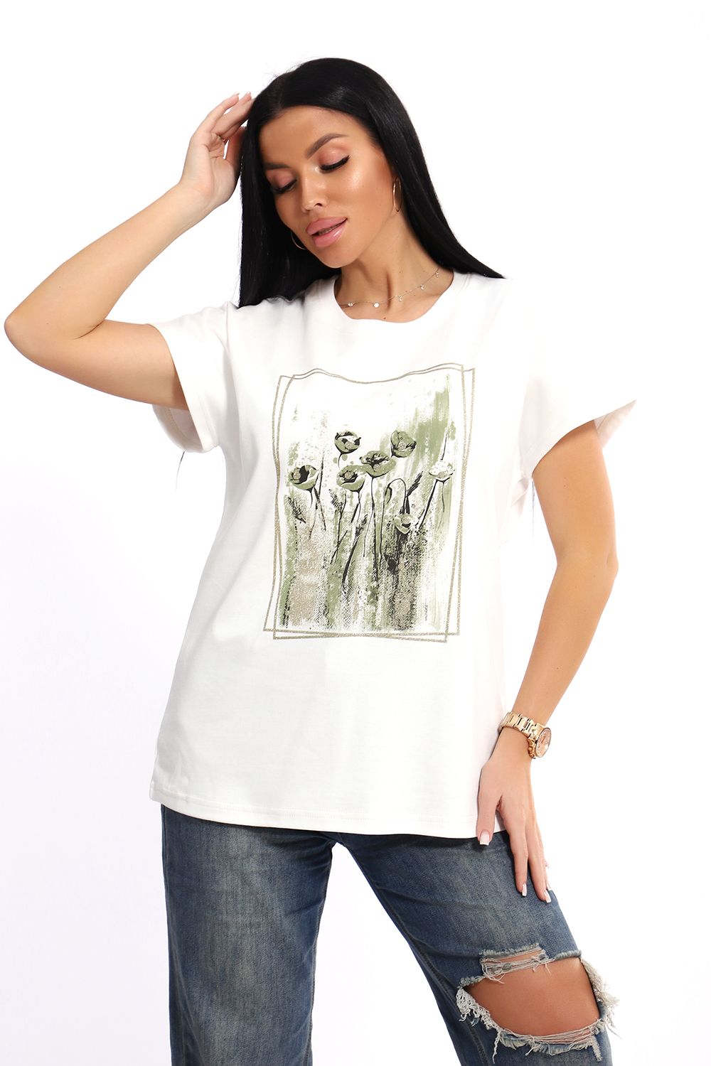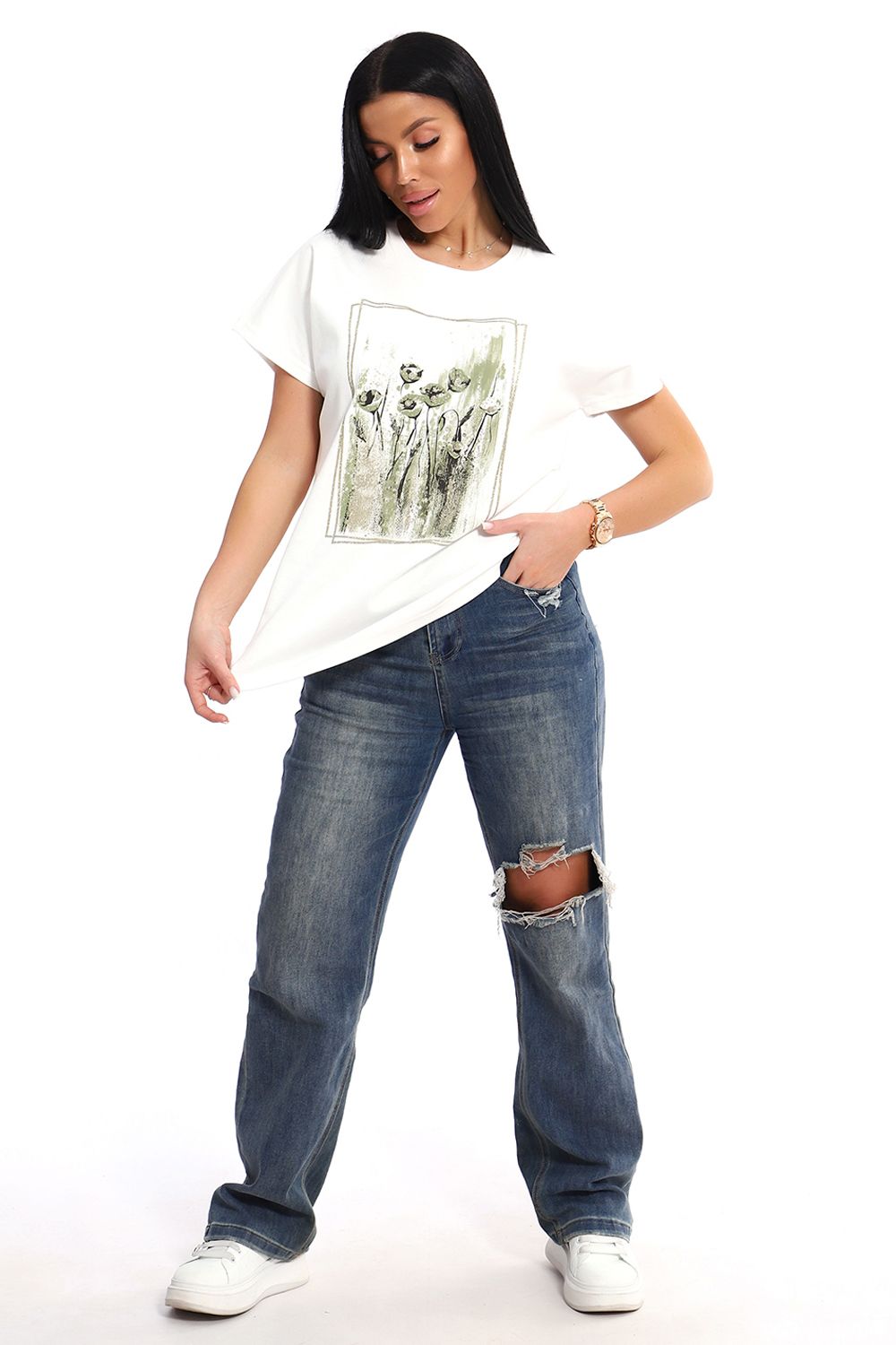Футболка классического фасона, прямого кроя, с коротким рукавом и округлым вырезом. Полочка декорирована цветочным принтом в пастельных тонах. Универсальная и нарядная модель футболки отлично подойдет для любого образа и станет необходимой вещью в вашем гардеробе наравне с повседневными футболками.