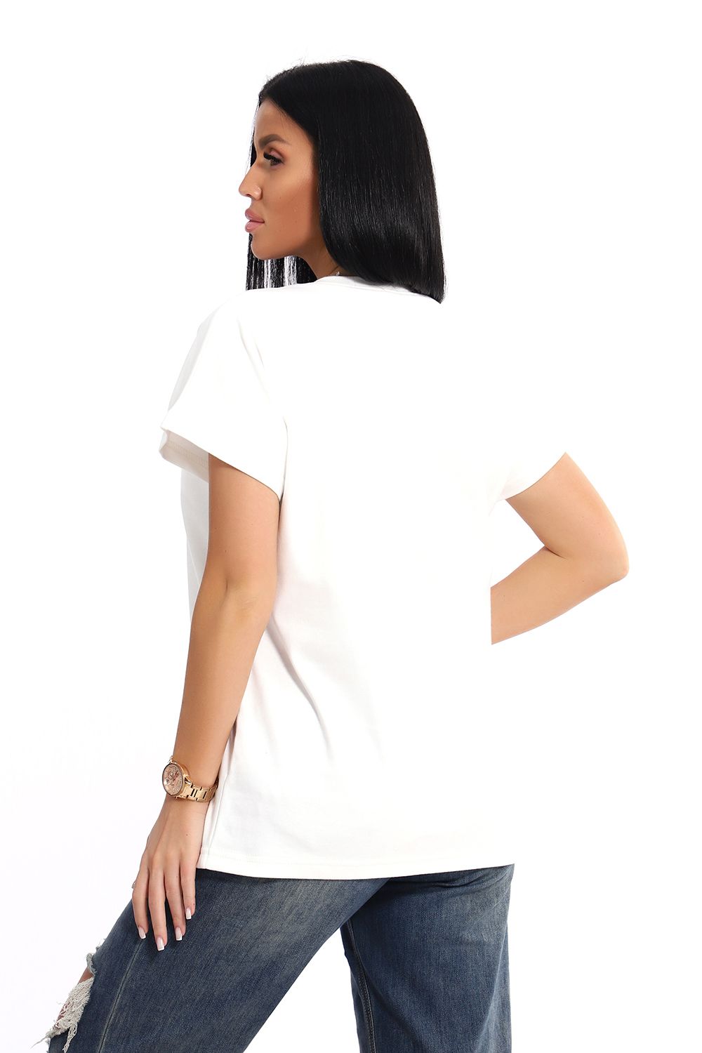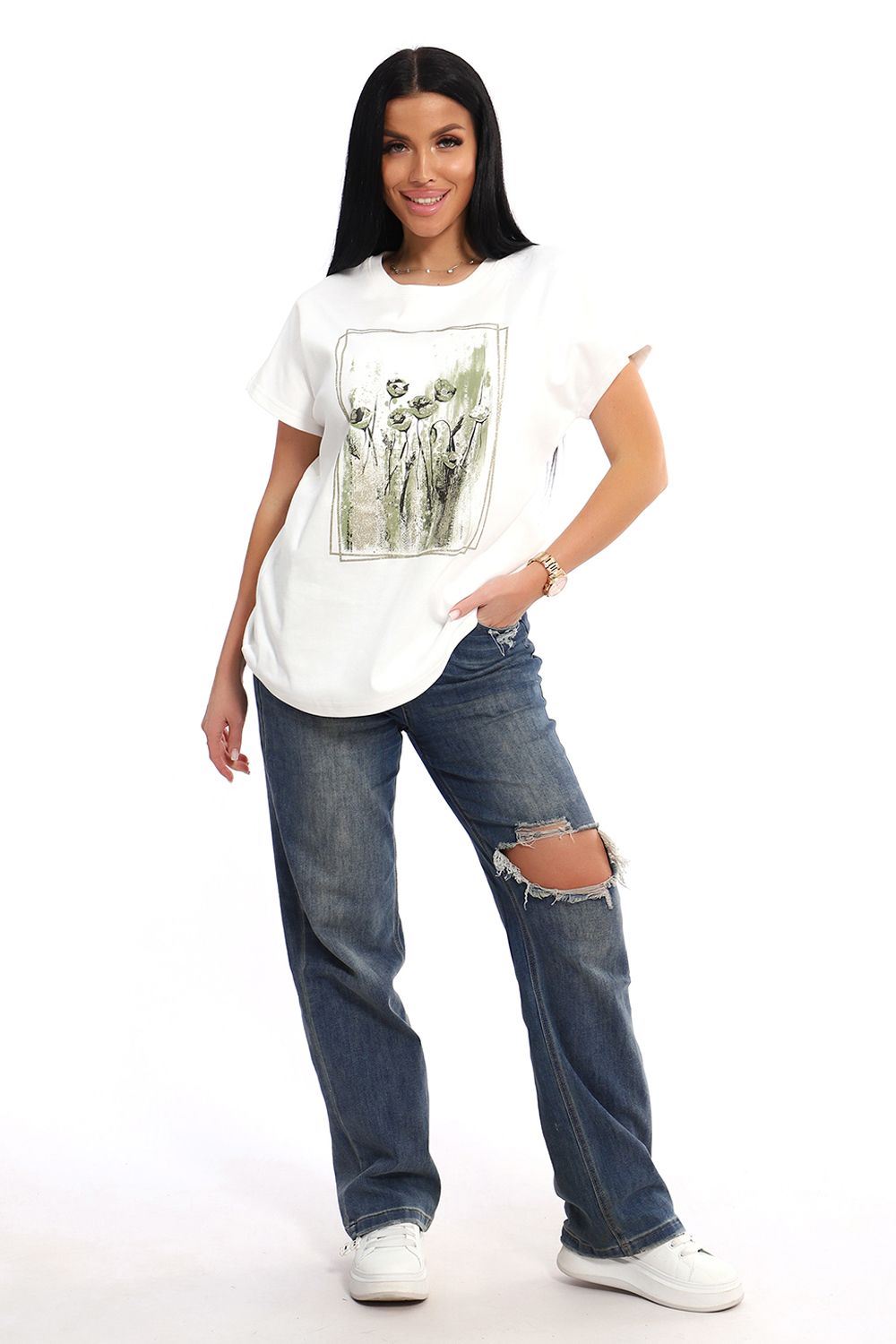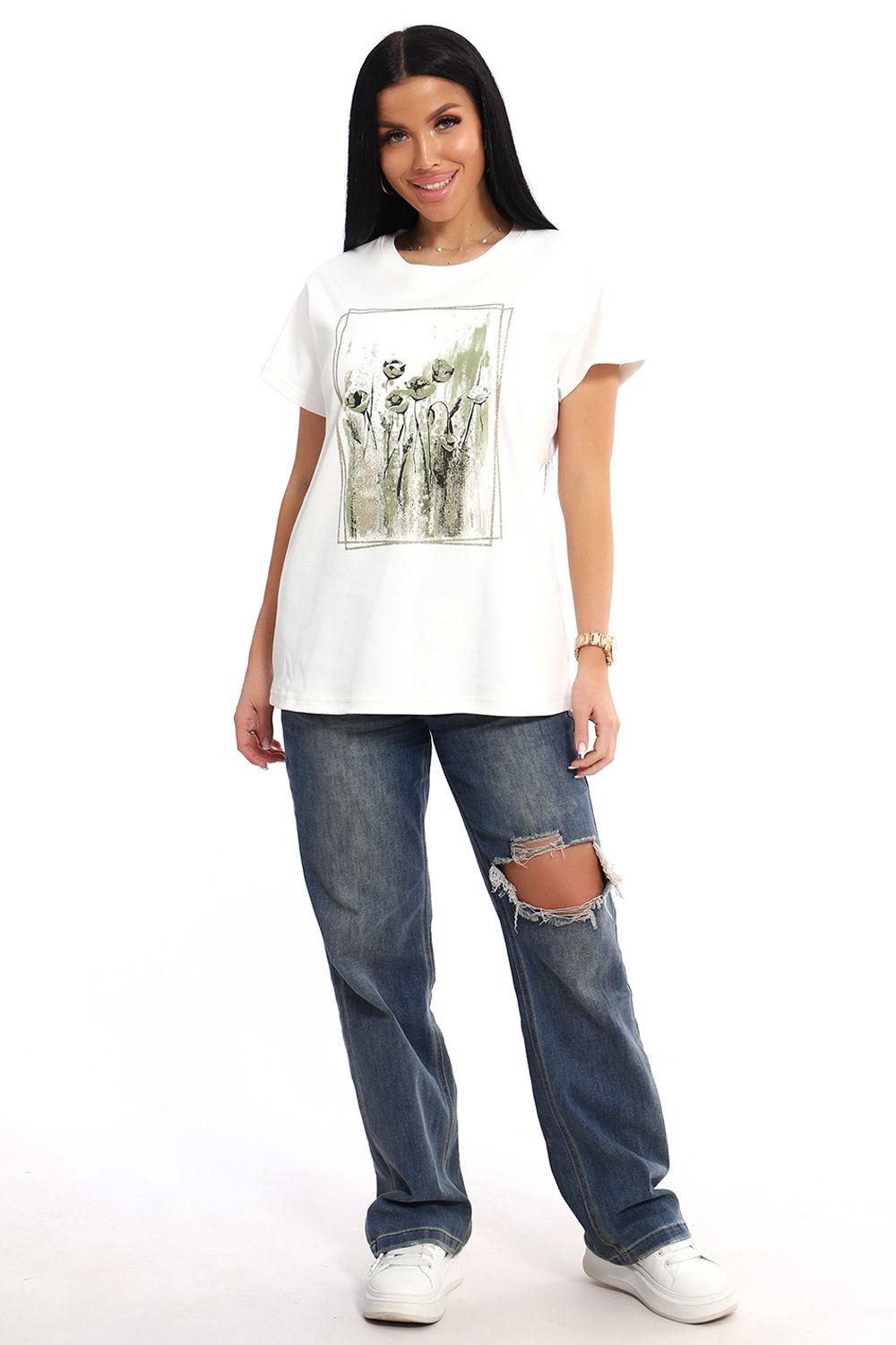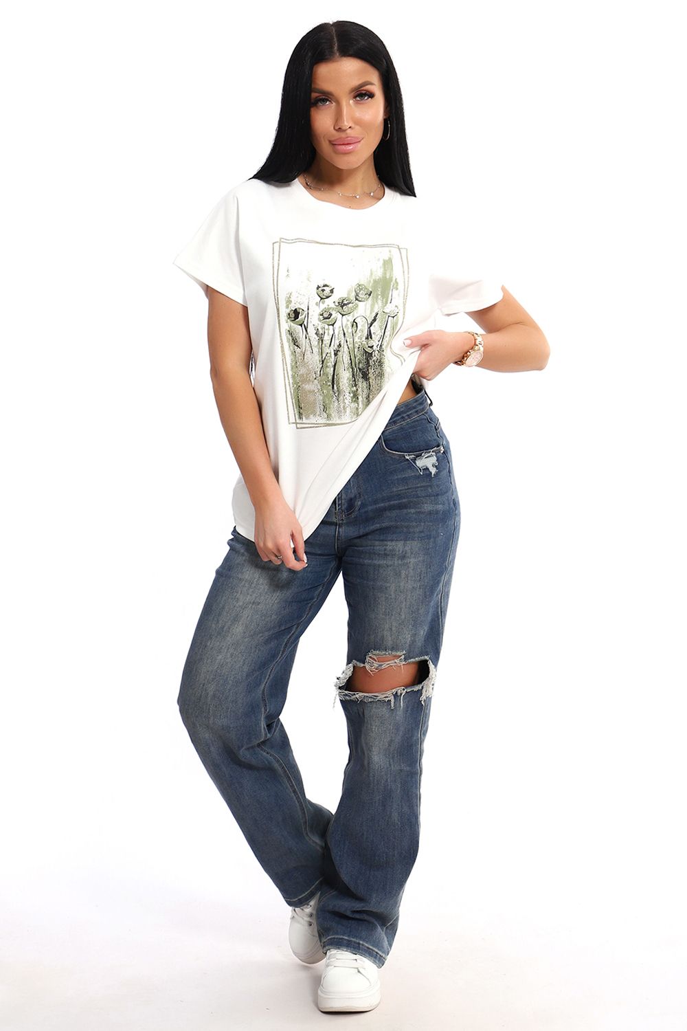 Футболка классического фасона, прямого кроя, с коротким рукавом и округлым вырезом. Полочка декорирована цветочным принтом в пастельных тонах. Универсальная и нарядная модель футболки отлично подойдет для любого образа и станет необходимой вещью в вашем гардеробе наравне с повседневными футболками.